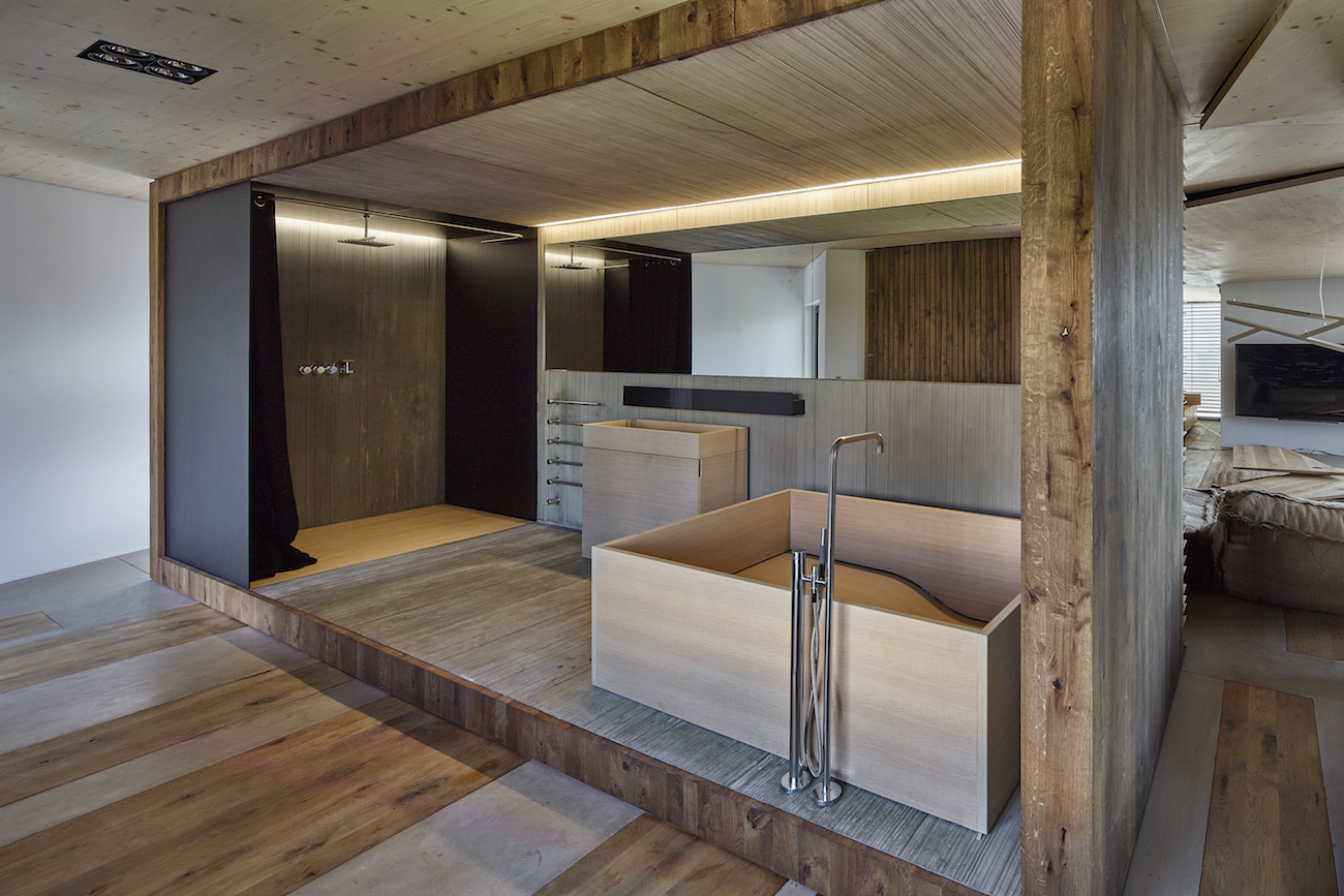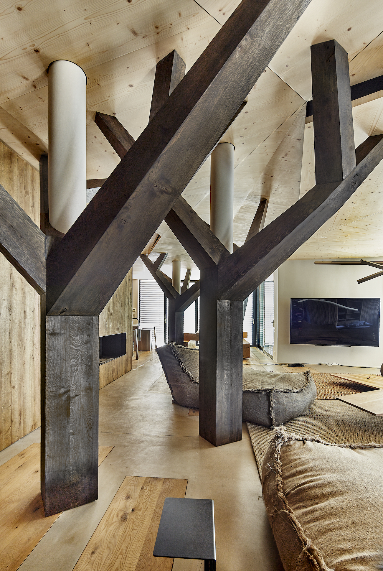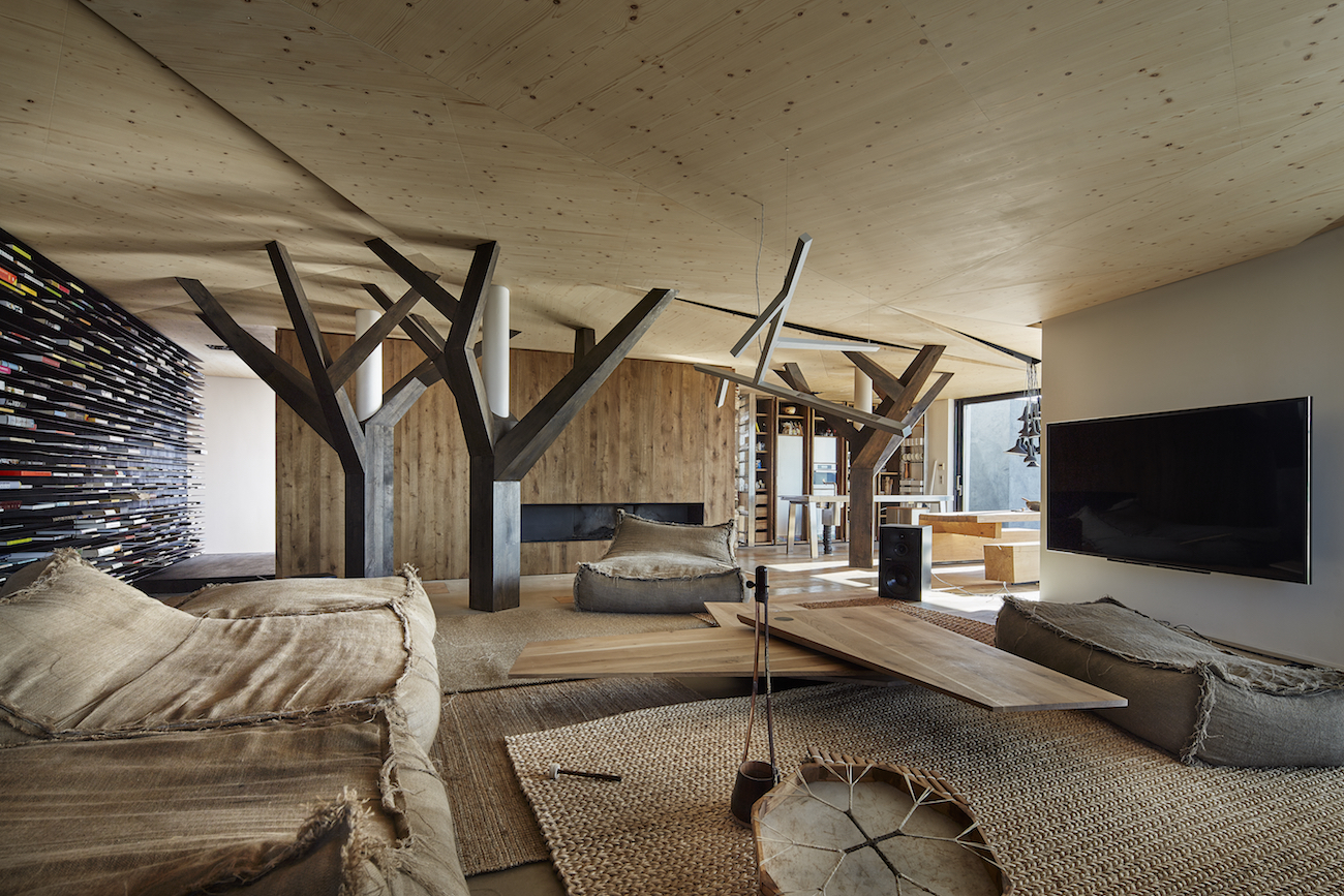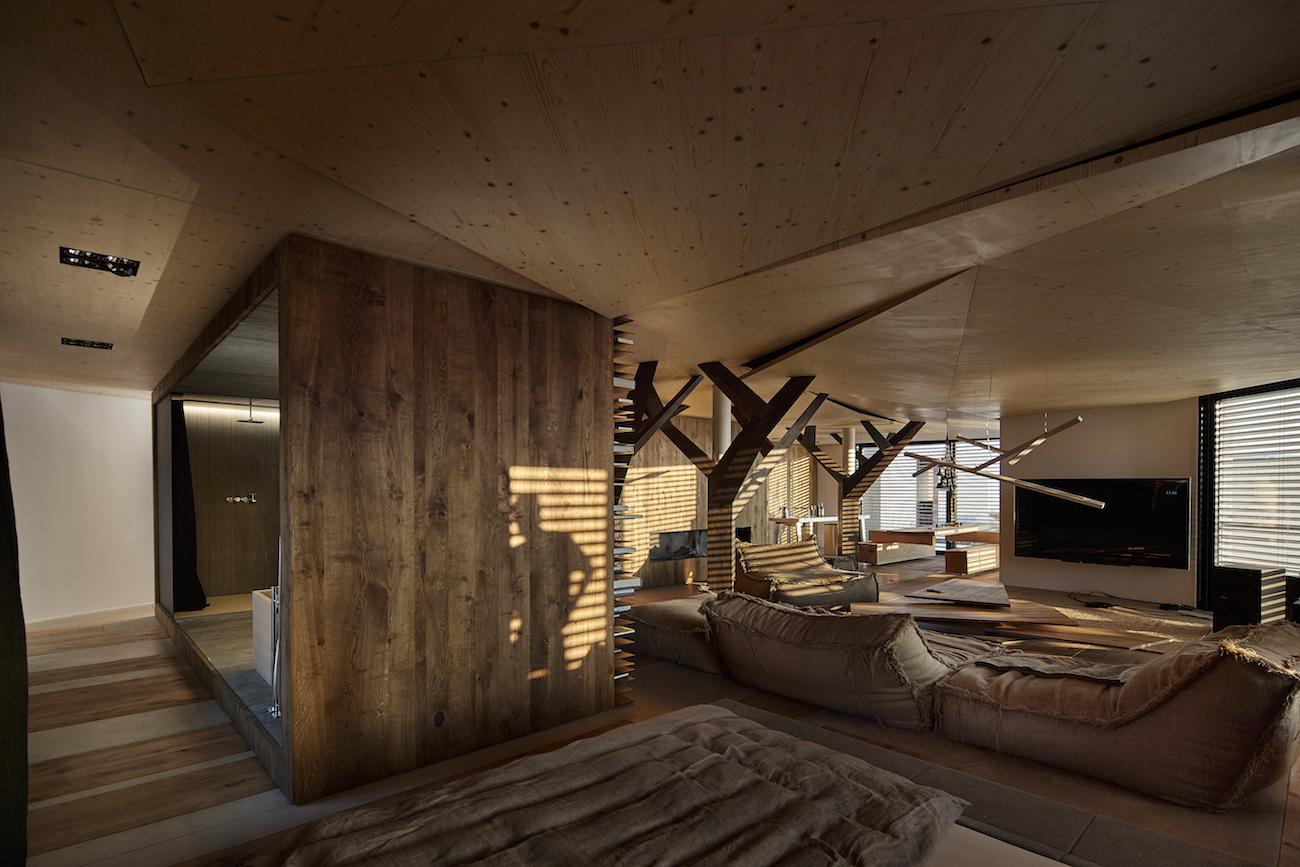 Pôvodne diagonálne radenú dispozíciu päťizbového bytu sme úplne "vyčistili" až na obvodové steny a nosné stĺpy v strede, aby tak vznikol priestranný "Loft" s presvetlením na tri svetové strany. V tomto priestore sú vložené iba dva masívne objekty s otvorenou kúpeľňou, WC a šatníkom. Ani jeden nezasahuje k obvodovým stenám, vďaka čomu môže svetlo nerušene plynúť všade naokolo. Pocit otvorenosti umocňuje súvislá betónová podlaha s dubovými doskami rôznych rozmerov nepravidelne rozmiestnených po celej ploche a tektonicky polámaný, priebežný drevený strop. Priľahlá a oddelená detská izba s textilnou sieťou pod stropom zase poskytuje dokonalý vlastný svet malému rastúcemu potomkovi majiteľa. V kombinácii s masívnymi povrchmi a atypickým zariadením, ako napr. na mieru vyrobený horizontálny krb, drevené abstraktné stromy na mieste nosných stĺpov a stena plná "vznášajúcich sa kníh", poskytuje tento "dvojizbový byt" :) jedinečnú atmosféru a zážitok z priestoru.
