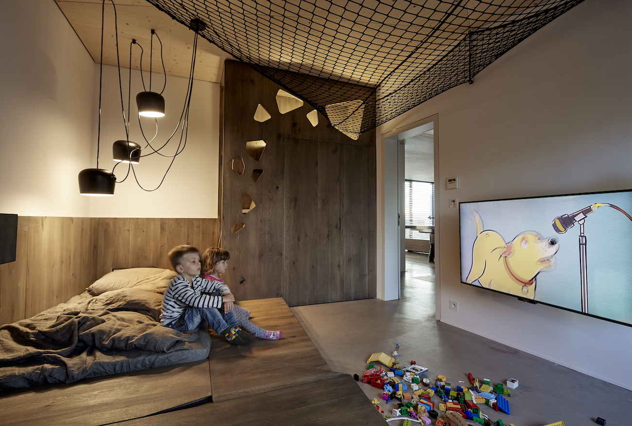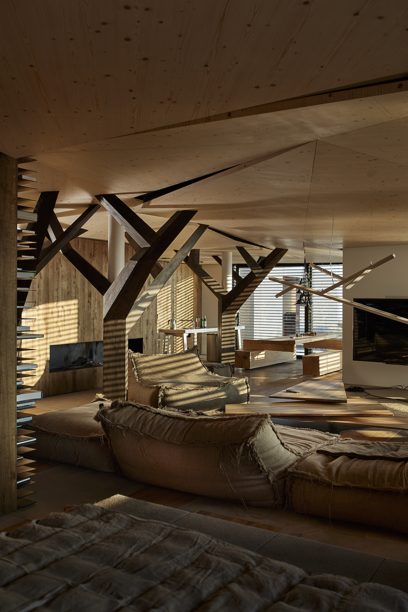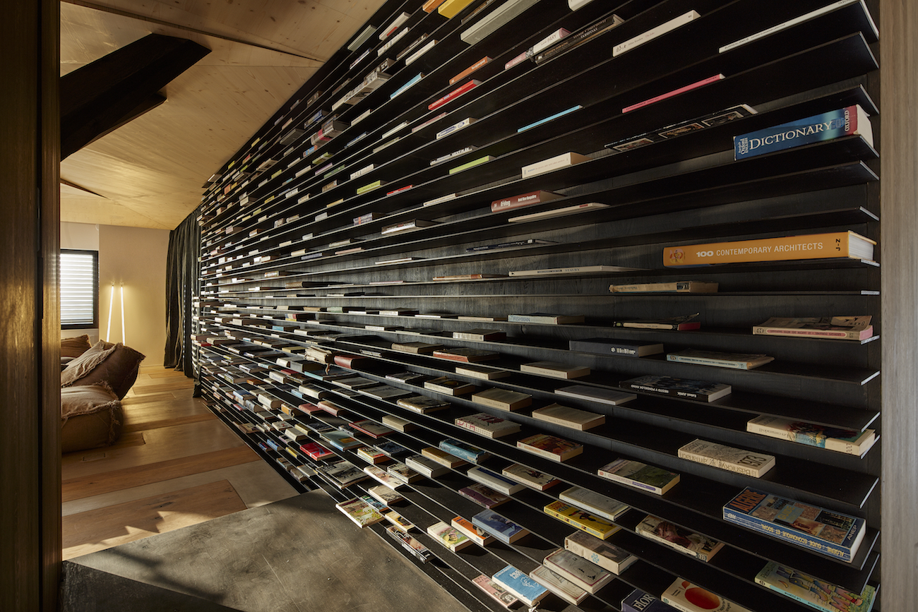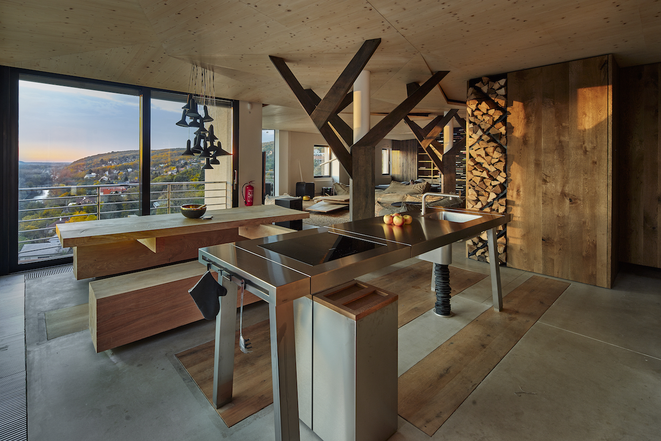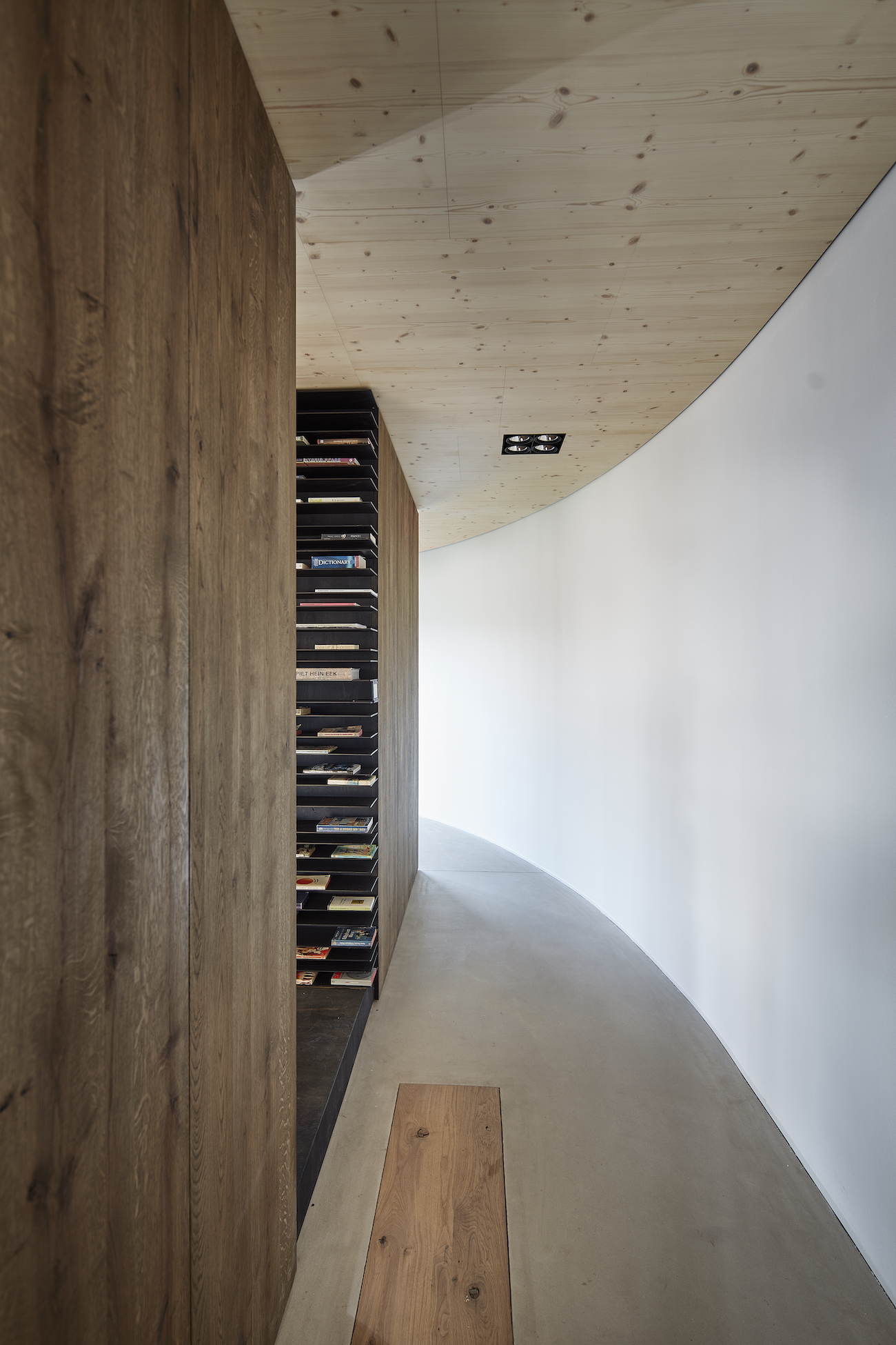 Pôvodne diagonálne radenú dispozíciu päťizbového bytu sme úplne "vyčistili" až na obvodové steny a nosné stĺpy v strede, aby tak vznikol priestranný "Loft" s presvetlením na tri svetové strany. V tomto priestore sú vložené iba dva masívne objekty s otvorenou kúpeľňou, WC a šatníkom. Ani jeden nezasahuje k obvodovým stenám, vďaka čomu môže svetlo nerušene plynúť všade naokolo. Pocit otvorenosti umocňuje súvislá betónová podlaha s dubovými doskami rôznych rozmerov nepravidelne rozmiestnených po celej ploche a tektonicky polámaný, priebežný drevený strop. Priľahlá a oddelená detská izba s textilnou sieťou pod stropom zase poskytuje dokonalý vlastný svet malému rastúcemu potomkovi majiteľa. V kombinácii s masívnymi povrchmi a atypickým zariadením, ako napr. na mieru vyrobený horizontálny krb, drevené abstraktné stromy na mieste nosných stĺpov a stena plná "vznášajúcich sa kníh", poskytuje tento "dvojizbový byt" :) jedinečnú atmosféru a zážitok z priestoru.