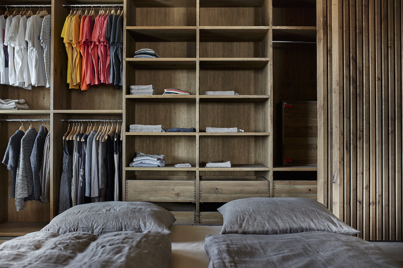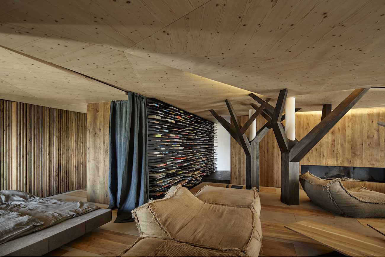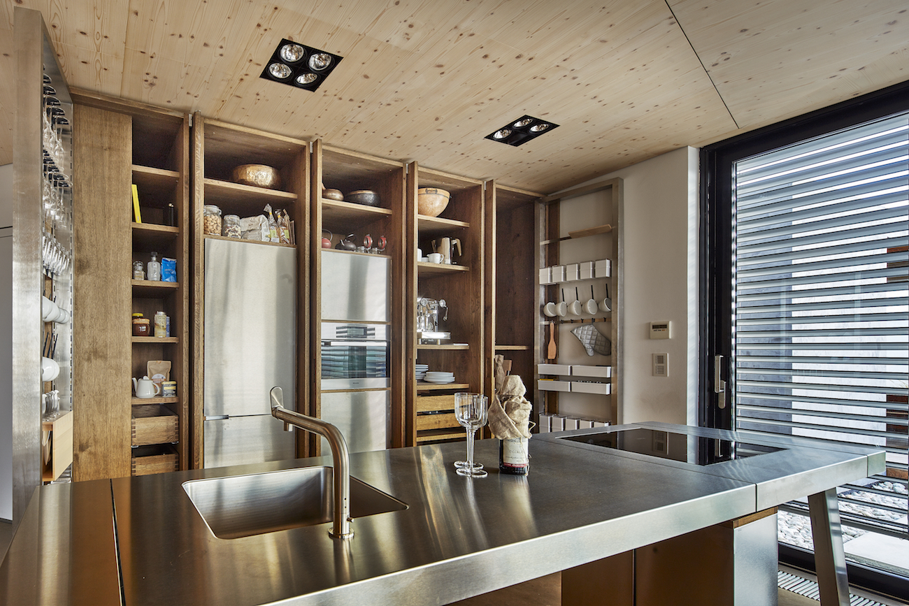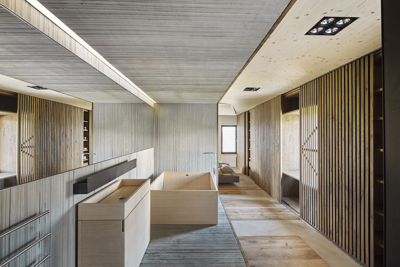 Pôvodne diagonálne radenú dispozíciu päťizbového bytu sme úplne "vyčistili" až na obvodové steny a nosné stĺpy v strede, aby tak vznikol priestranný "Loft" s presvetlením na tri svetové strany. V tomto priestore sú vložené iba dva masívne objekty s otvorenou kúpeľňou, WC a šatníkom. Ani jeden nezasahuje k obvodovým stenám, vďaka čomu môže svetlo nerušene plynúť všade naokolo. Pocit otvorenosti umocňuje súvislá betónová podlaha s dubovými doskami rôznych rozmerov nepravidelne rozmiestnených po celej ploche a tektonicky polámaný, priebežný drevený strop. Priľahlá a oddelená detská izba s textilnou sieťou pod stropom zase poskytuje dokonalý vlastný svet malému rastúcemu potomkovi majiteľa. V kombinácii s masívnymi povrchmi a atypickým zariadením, ako napr. na mieru vyrobený horizontálny krb, drevené abstraktné stromy na mieste nosných stĺpov a stena plná "vznášajúcich sa kníh", poskytuje tento "dvojizbový byt" :) jedinečnú atmosféru a zážitok z priestoru.