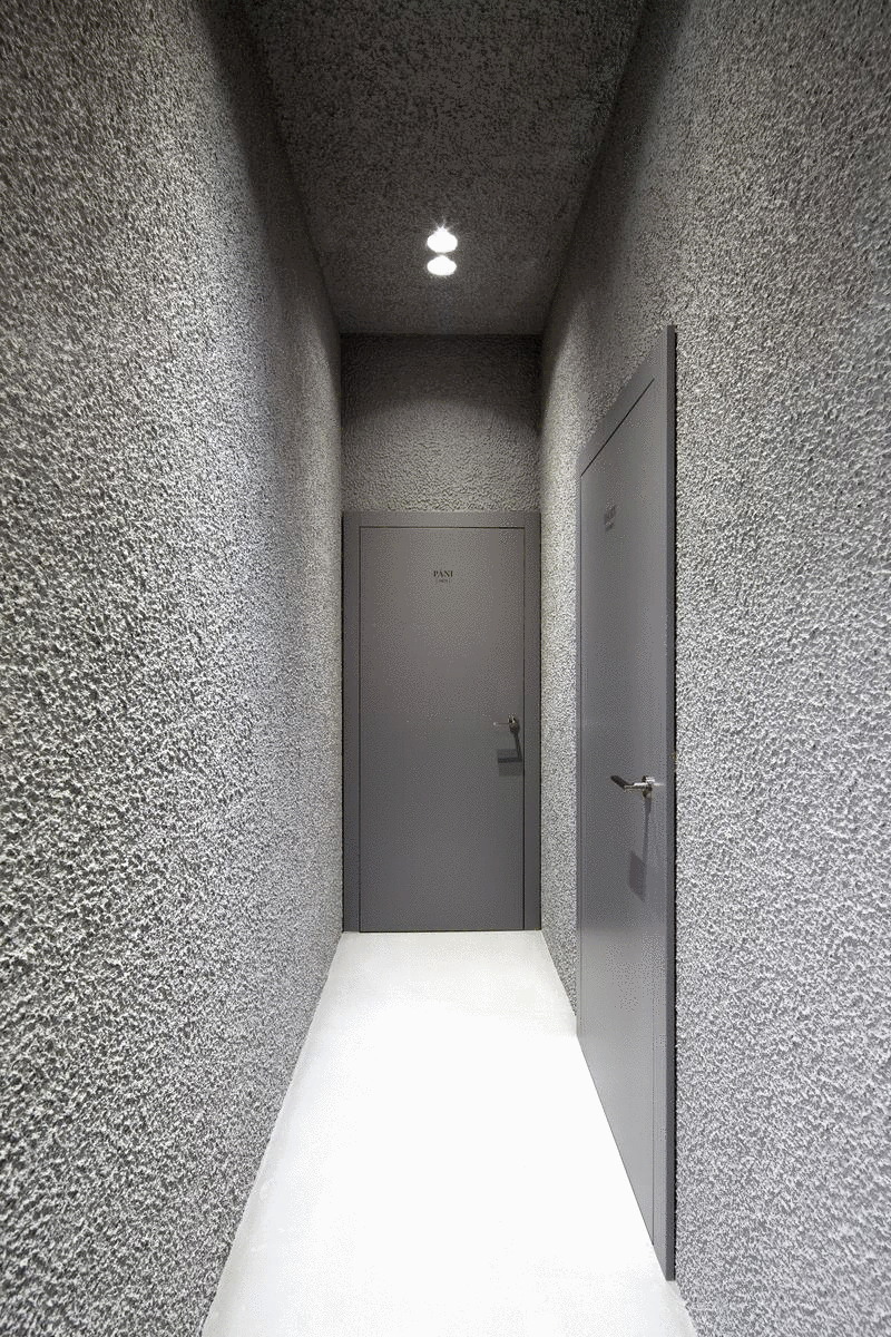 Kombinácia priznanej štruktúry MDF dosiek, zrkadiel a hrubej omietky priniesla navrhovanému priestoru svetlo bez prílišnej expozície zákazníka. V priestoroch hygieny použili architekti kombináciu sivej omietky a keramického obkladu uloženého pod 45 stupňovým uhlom.