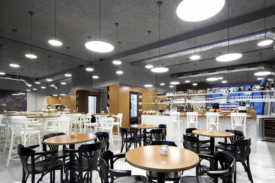Optická hra so zrkadlami predlžuje a zväčšuje priestory. Svietidlá zavesené v pravidelnom rastri umožňujú drobné zmeny v usporiadaní mobiliáru.