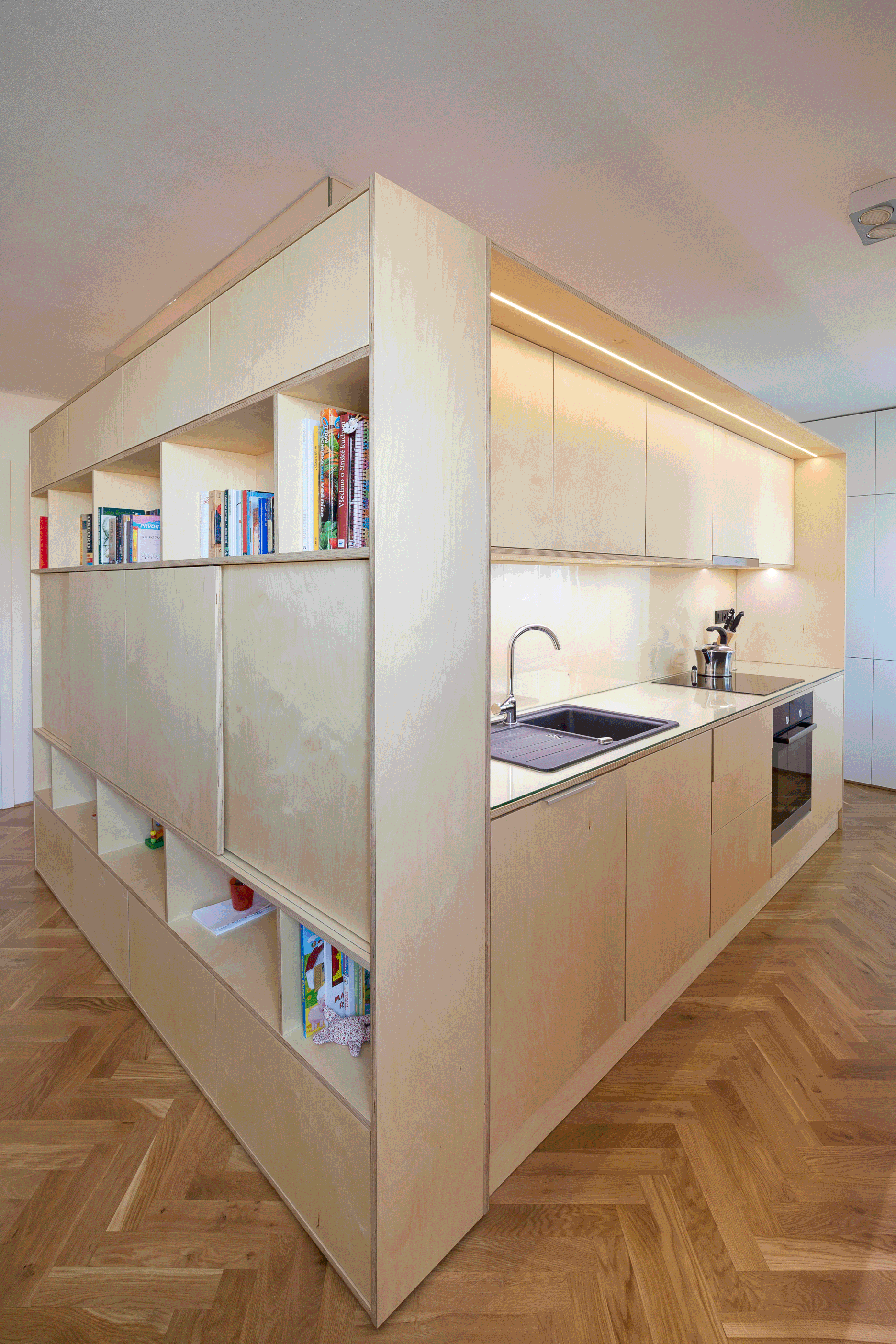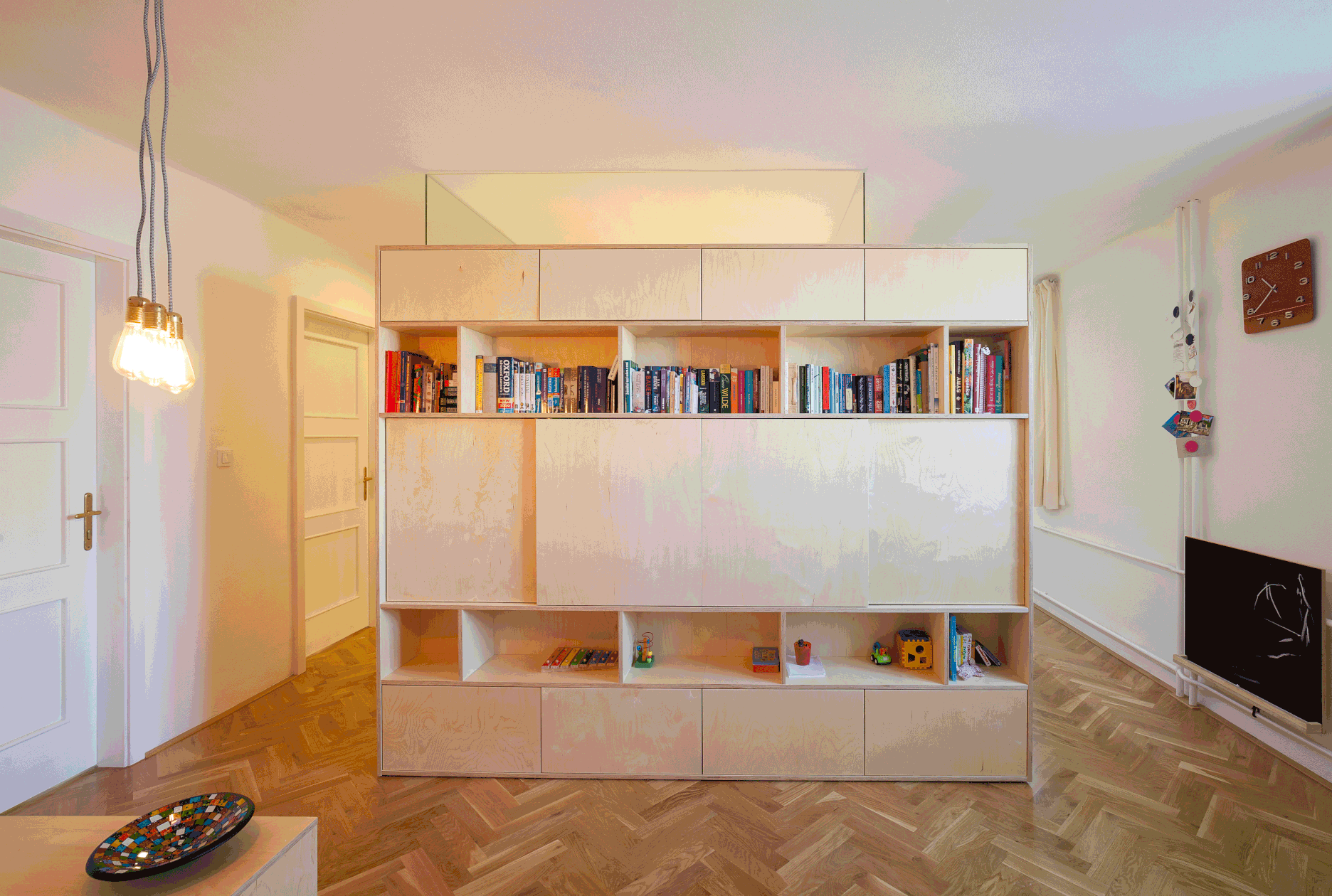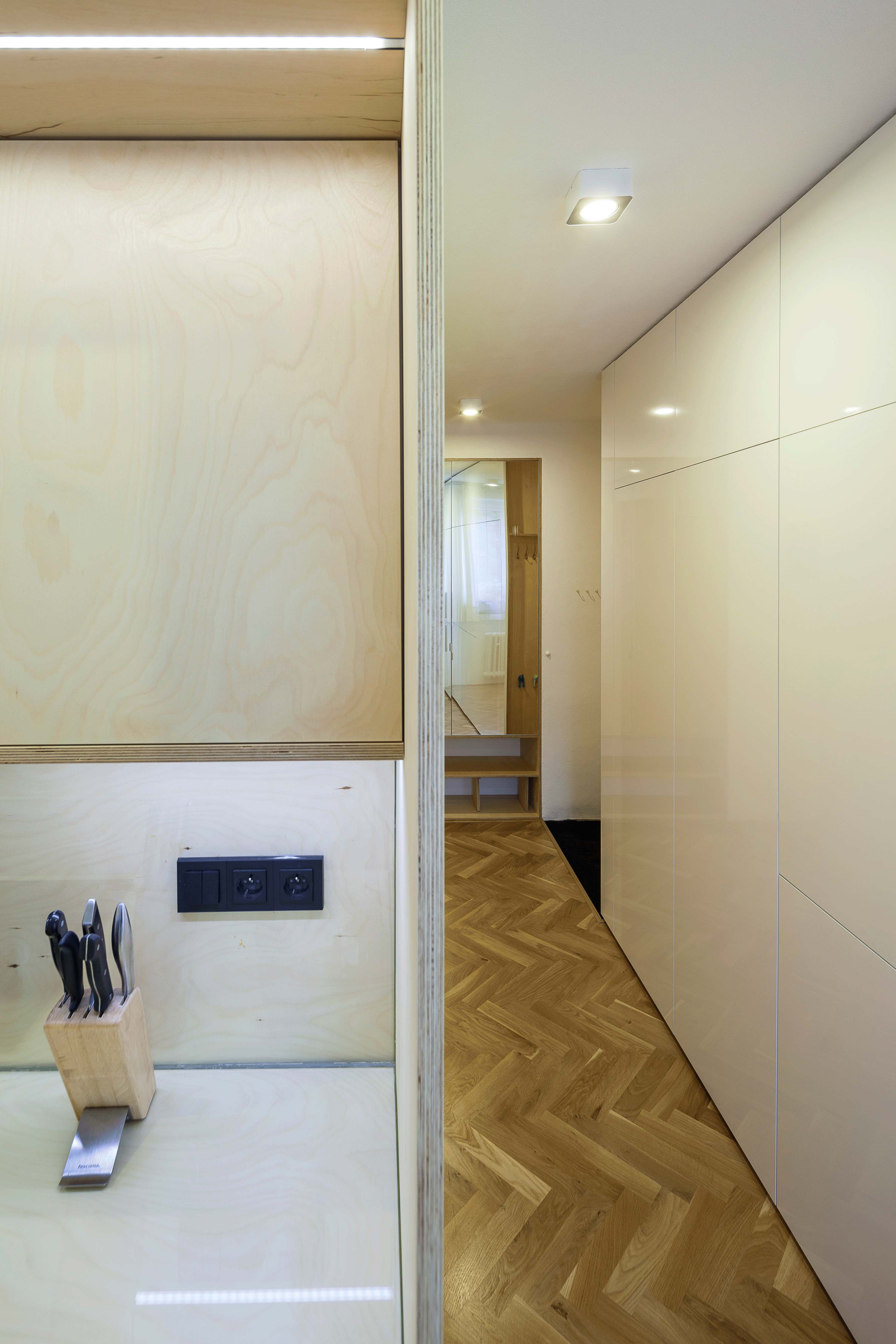 Celková rekonštrukcia znamenala vybúranie takmer všetkých pôvodných priečok a následné vybudovanie centrálneho bloku okolo bytového jadra. Vstavaný blok vymedzuje vstupnú časť bytu a plní funkciu kuchyne a úložnej zostavy zo strany obývacej izby. Vo vnútri bloku je kúpeľňa s prirodzeným osvetlením, WC a komora.
