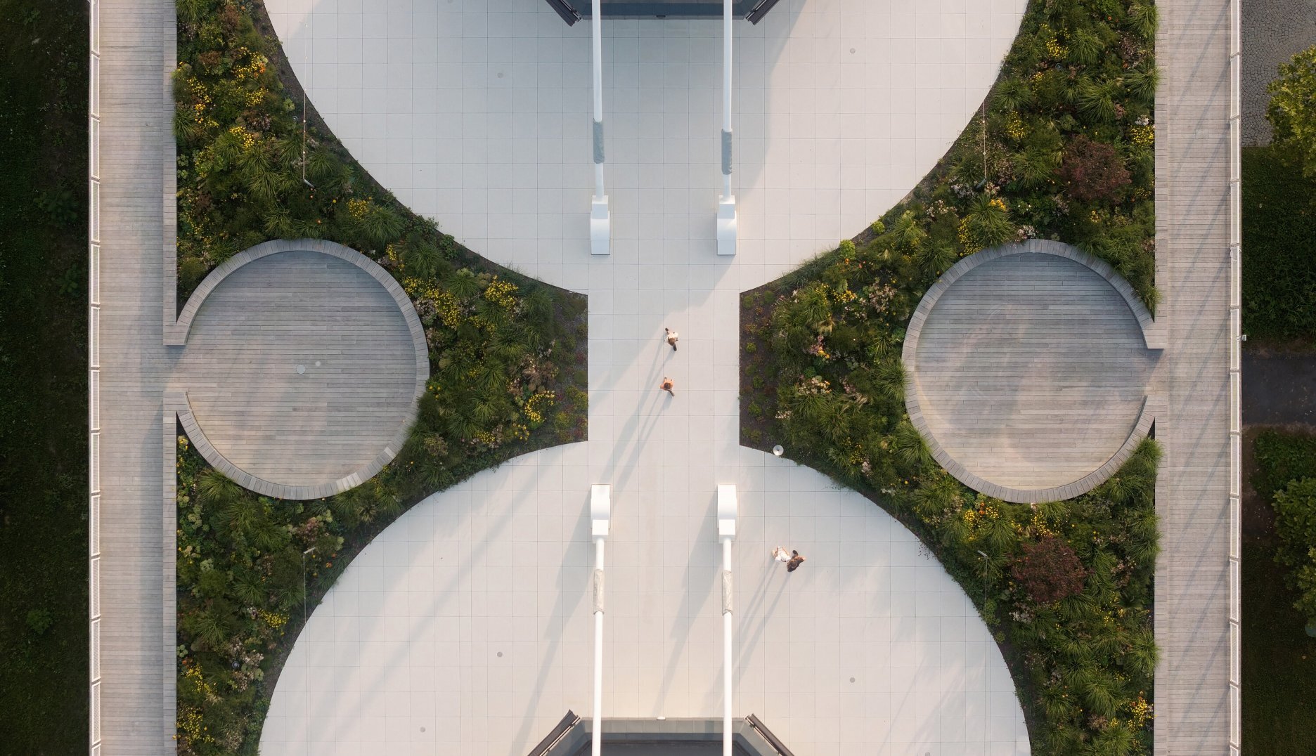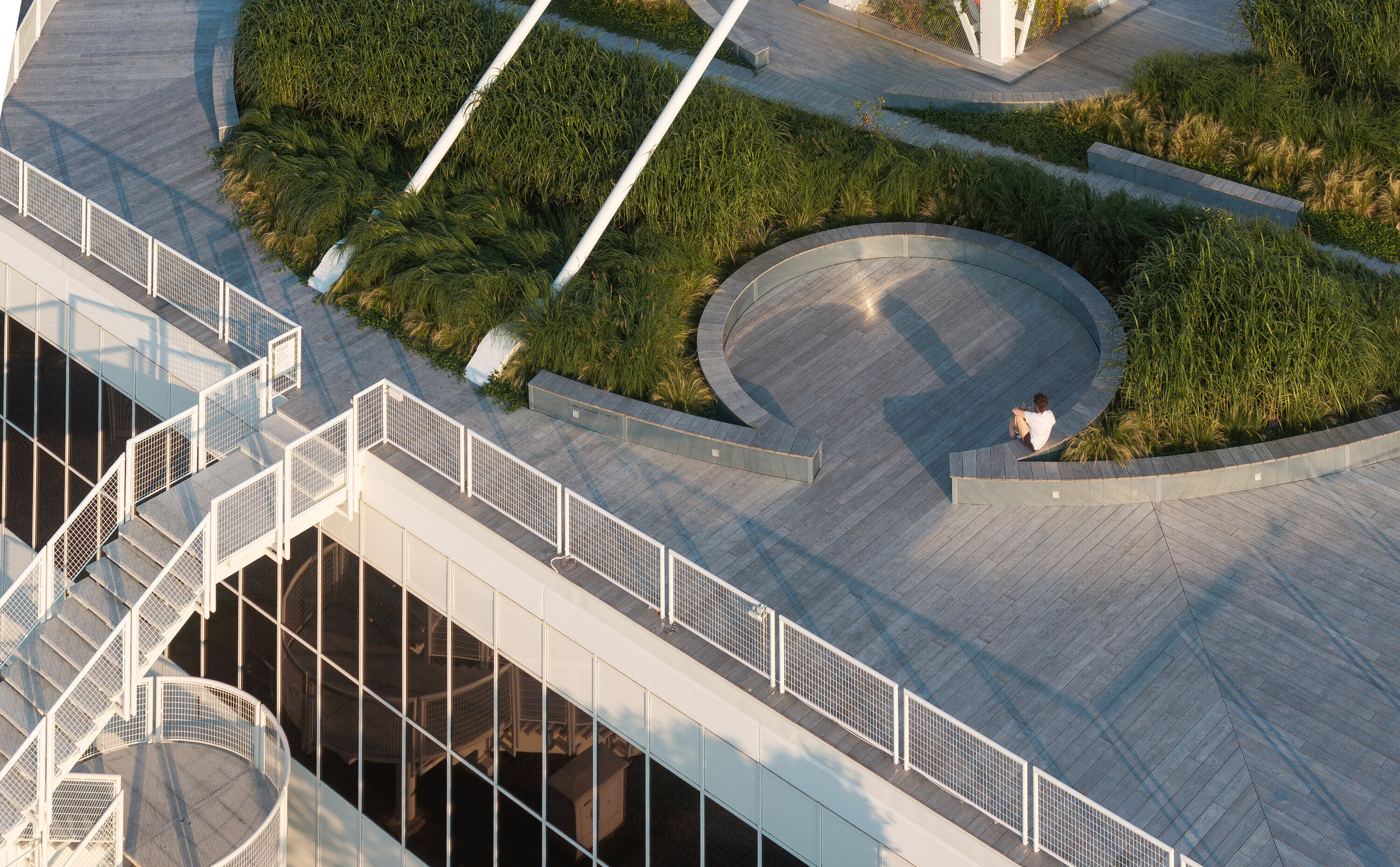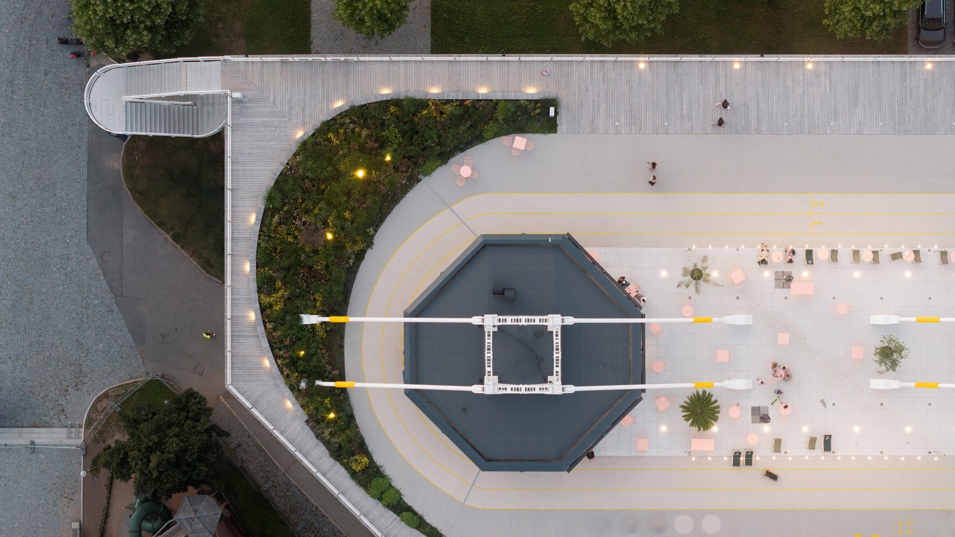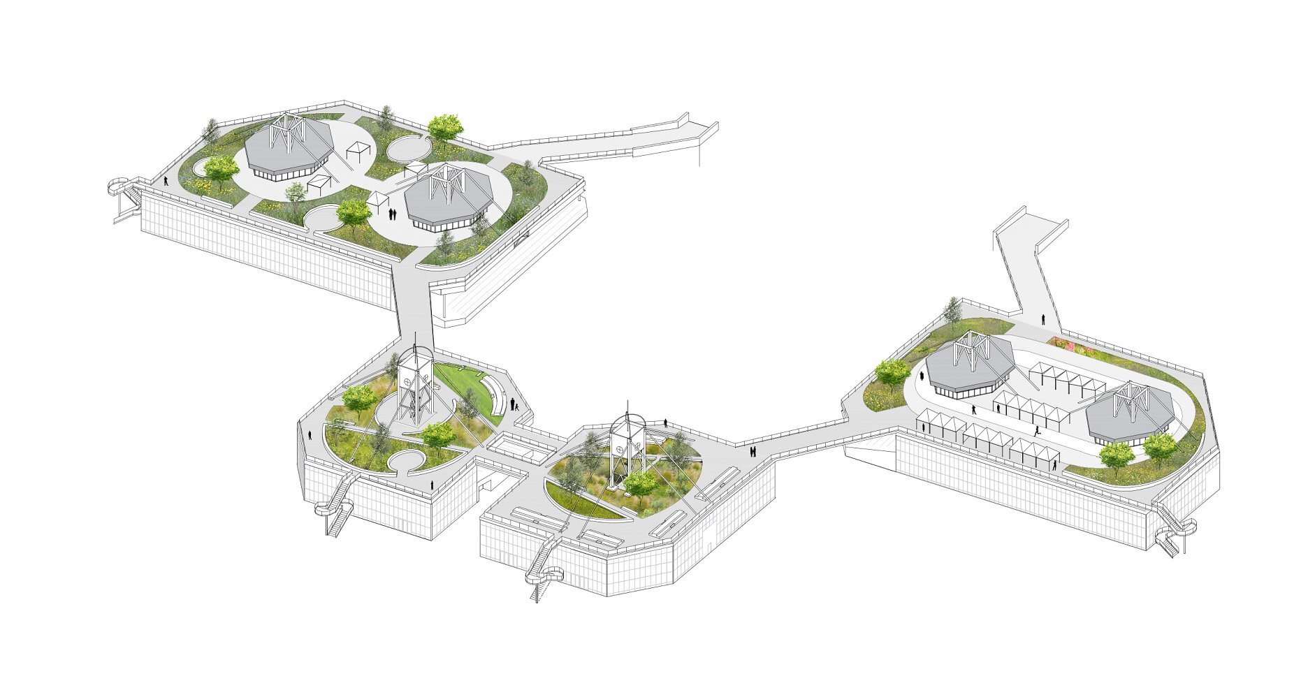 Jedným z kľúčových prvkov revitalizácie je úprava strechy, ktorá nadobudla úplne nový charakter. Pôvodne nevyužité a zanedbané betónové plochy sa zmenili na aktívne zelené strechy prístupné verejnosti. Koncepcia zelených striech reaguje na aktuálnu potrebu udržateľných mestských zásahov – znižuje efekt tepelného ostrova a zlepšuje odtokovú bilanciu zrážkových vôd. Zároveň vytvára priestor s rôznorodou funkciou, umožňujúcou celoročné využitie. Okrem oddychu v zeleni sa tu plánuje aj jednoduché občerstvenie, športové a spoločenské aktivity. Na streche sa dnes nachádza bufet, bežecká dráha a herné prvky.