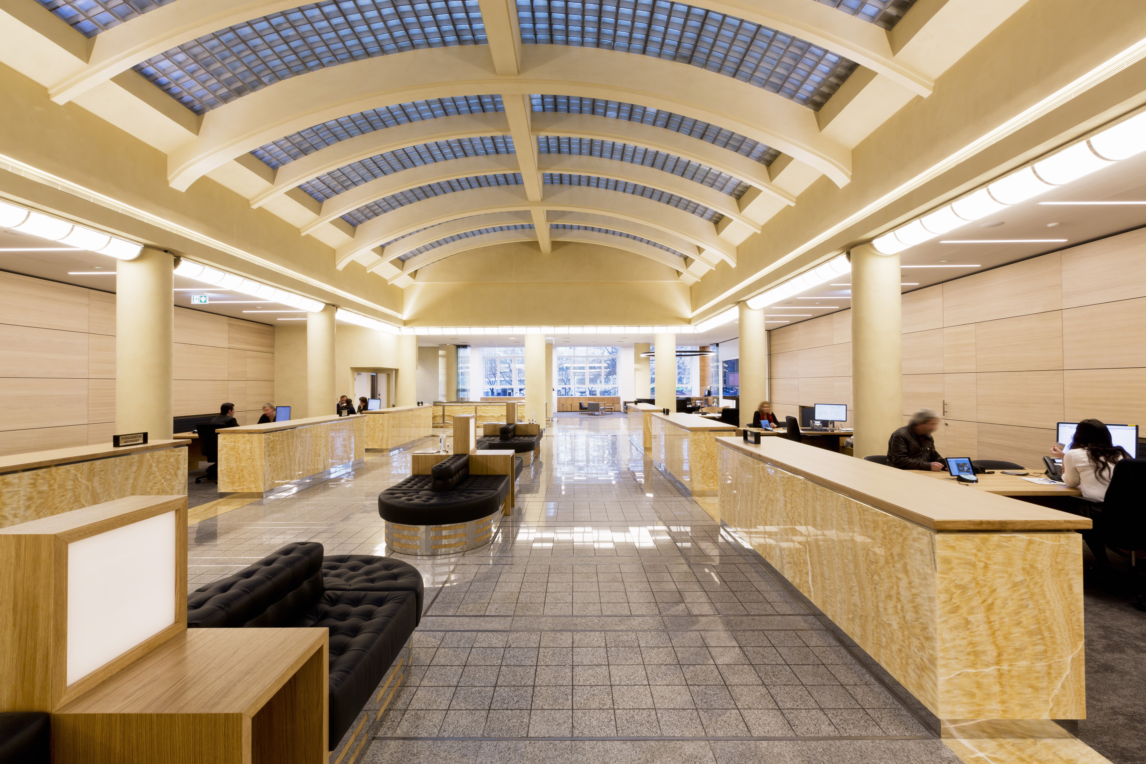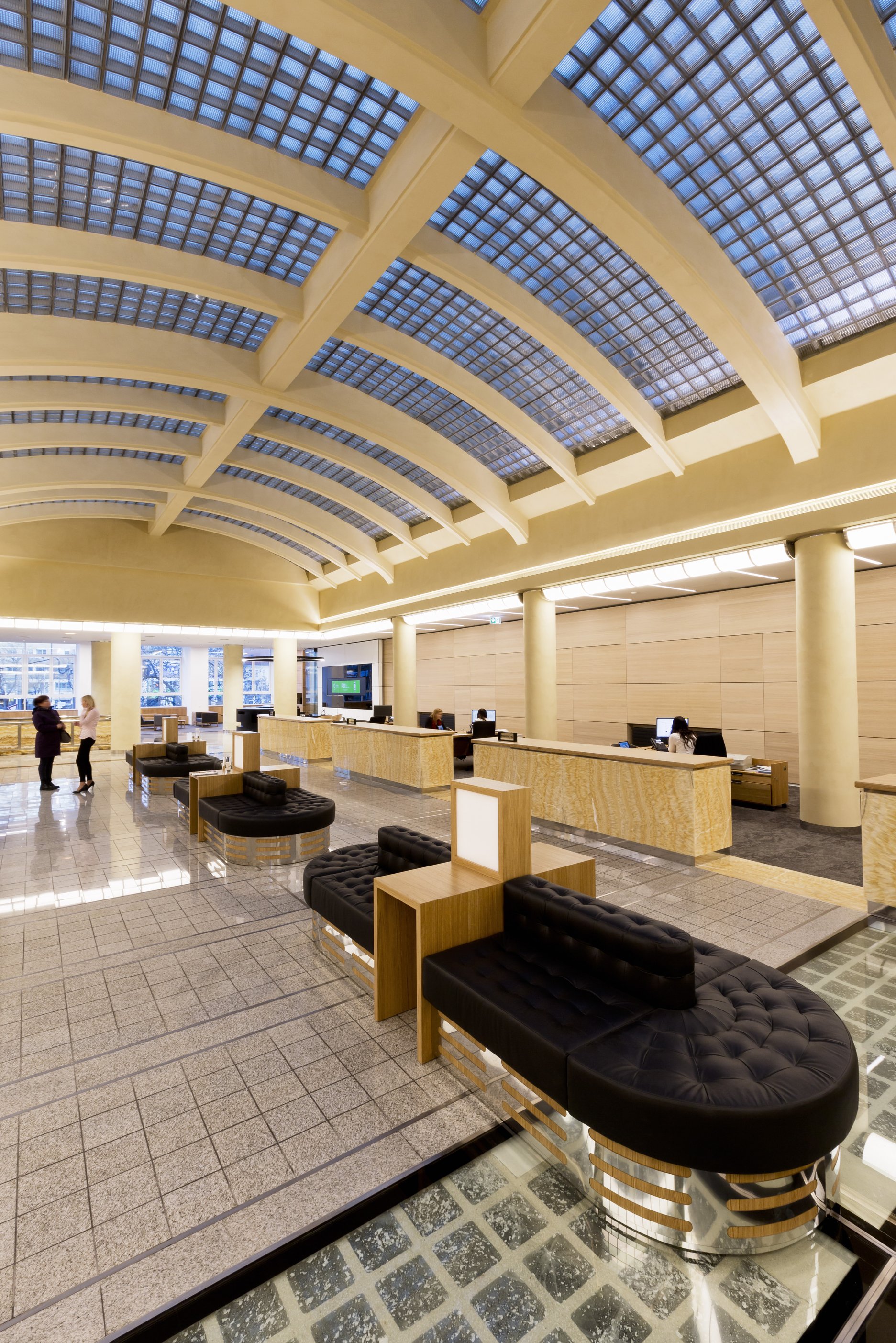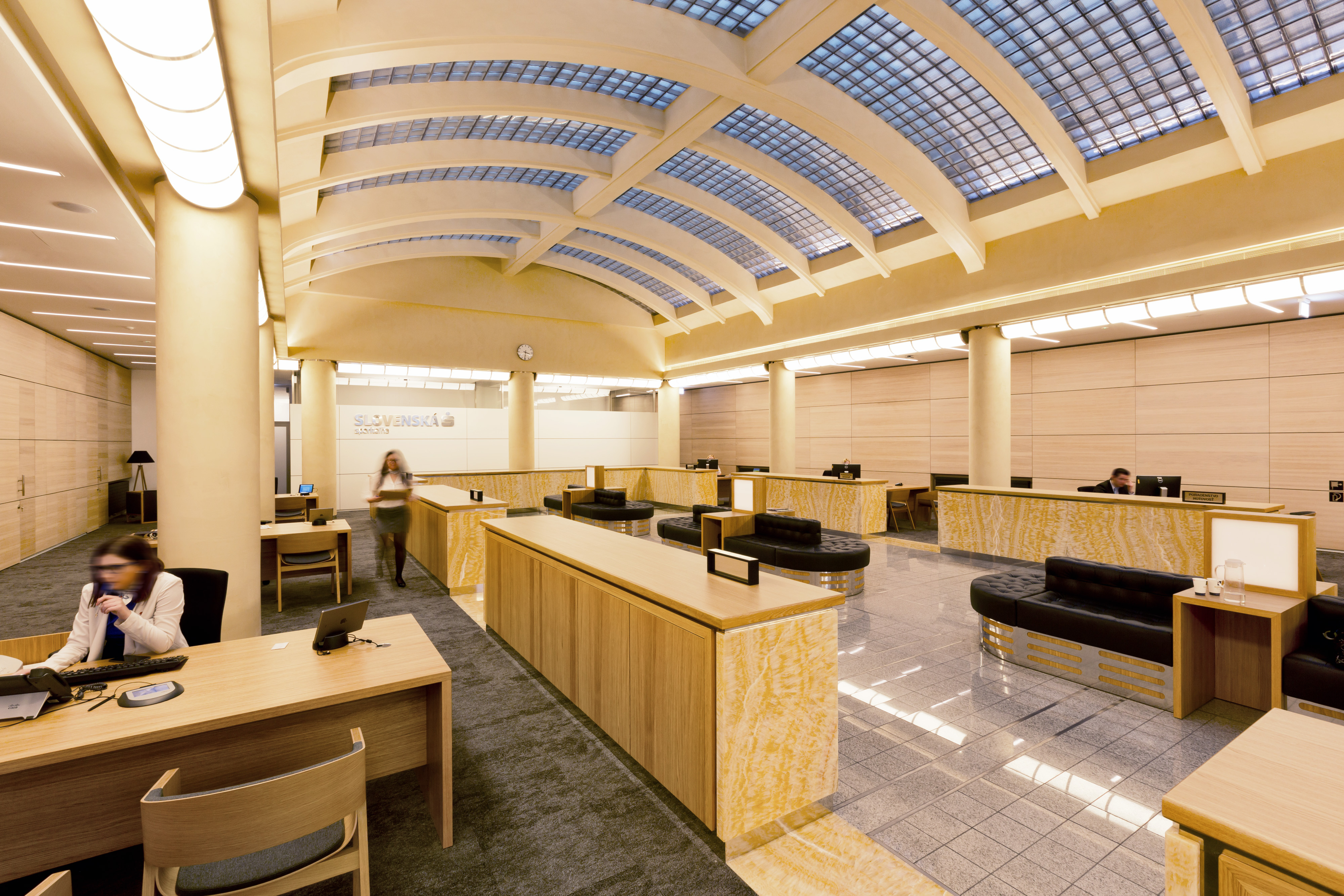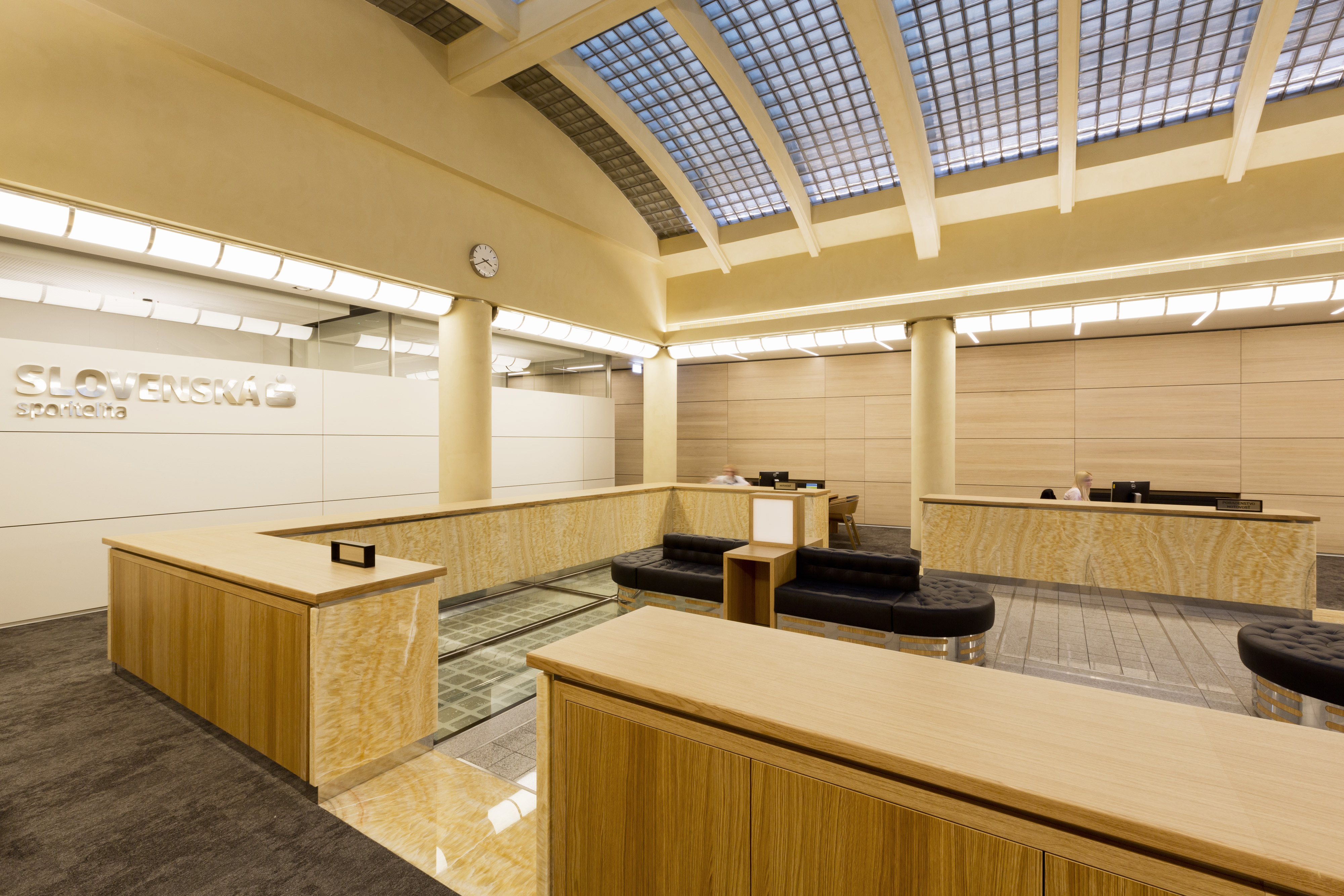 Najvýznamnejšou zmenou v zariadení bankovej haly bolo rozčlenenie priebežných zákazníckych pultov na menšie moduly, ktoré zodpovedajú novým prevádzkovým požiadavkam. Zariadenie sa po výraznej reorganizácii vracia bližšie k pôvodnému Tvarožkovému usporiadaniu. Pôdorysné umiestnenie pultov zodpovedá originálu, ich členenie však umožnilo prístup klientov k stolom bankových pracovníkov. Na ich pôvodnú celistvú formu odkazujú intarzie v podlahe, ktoré materiálovo reflektujú povrch pultov.