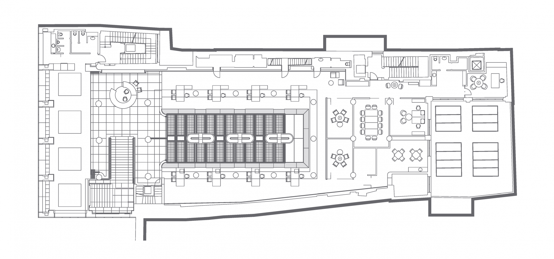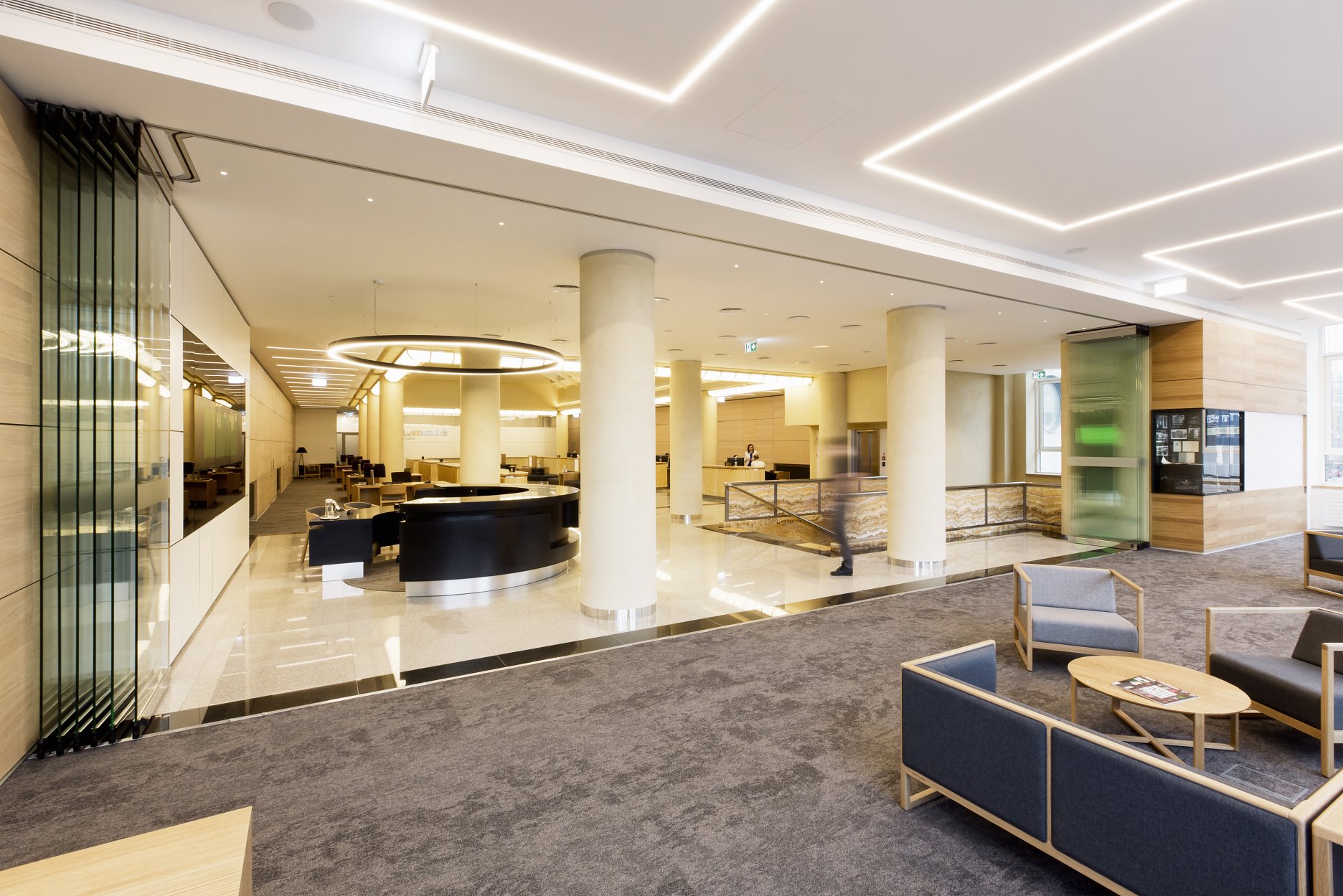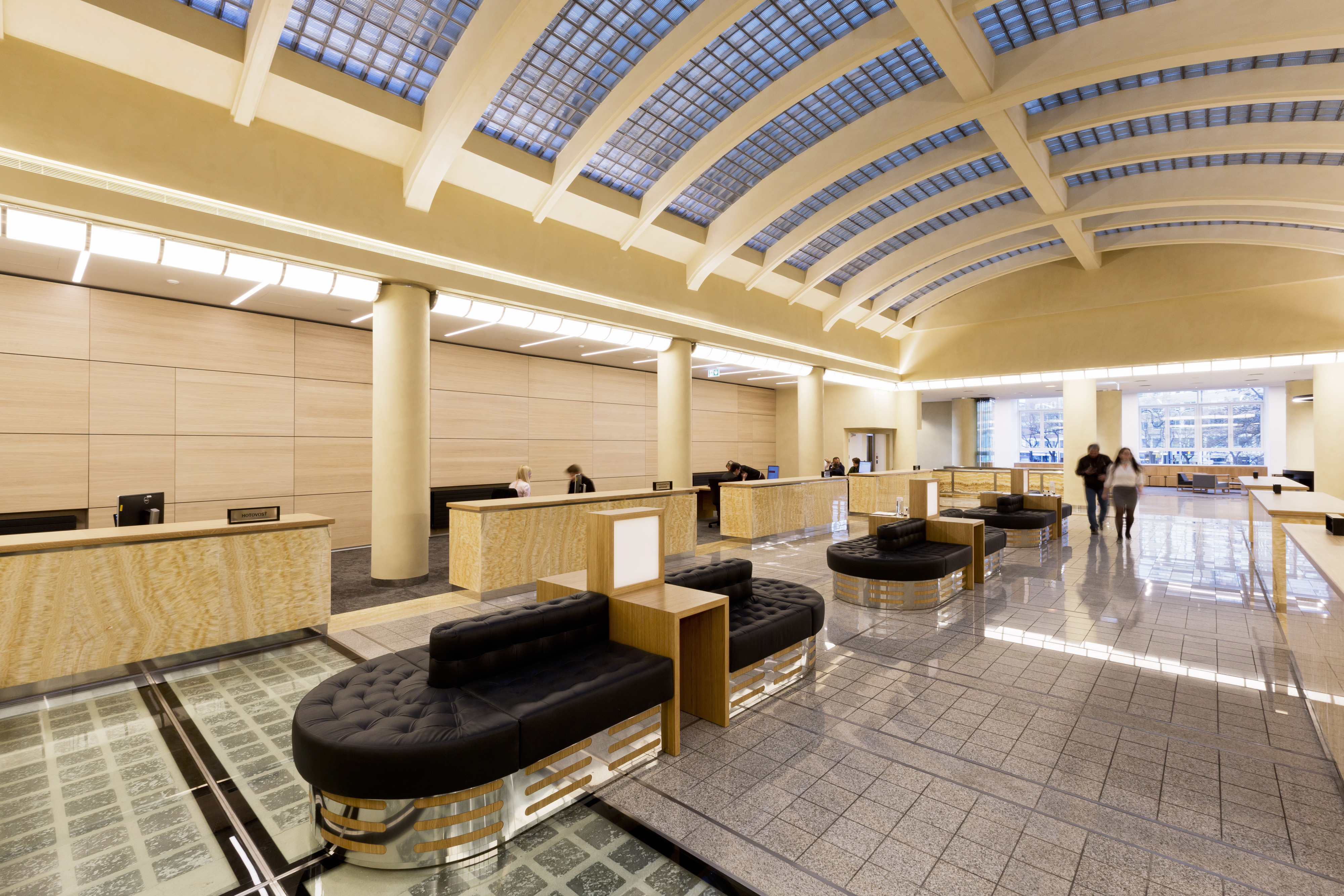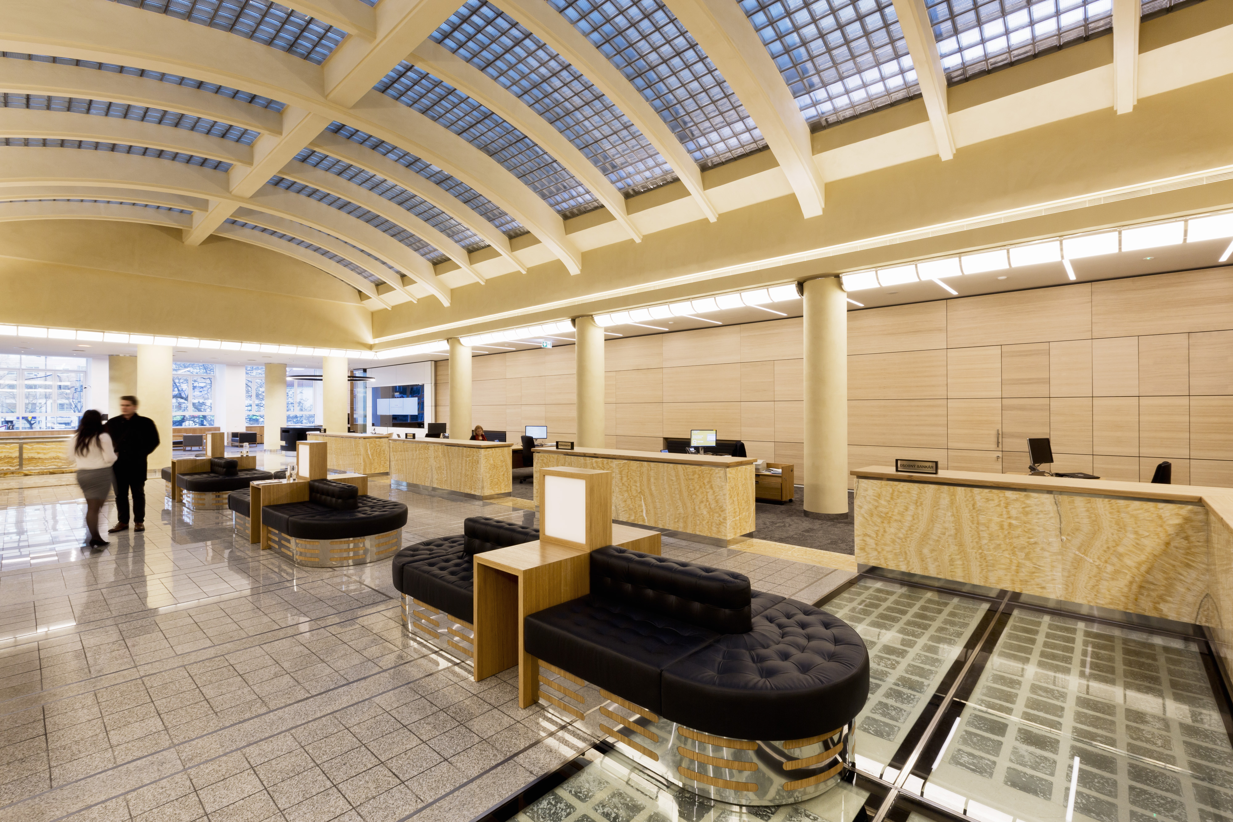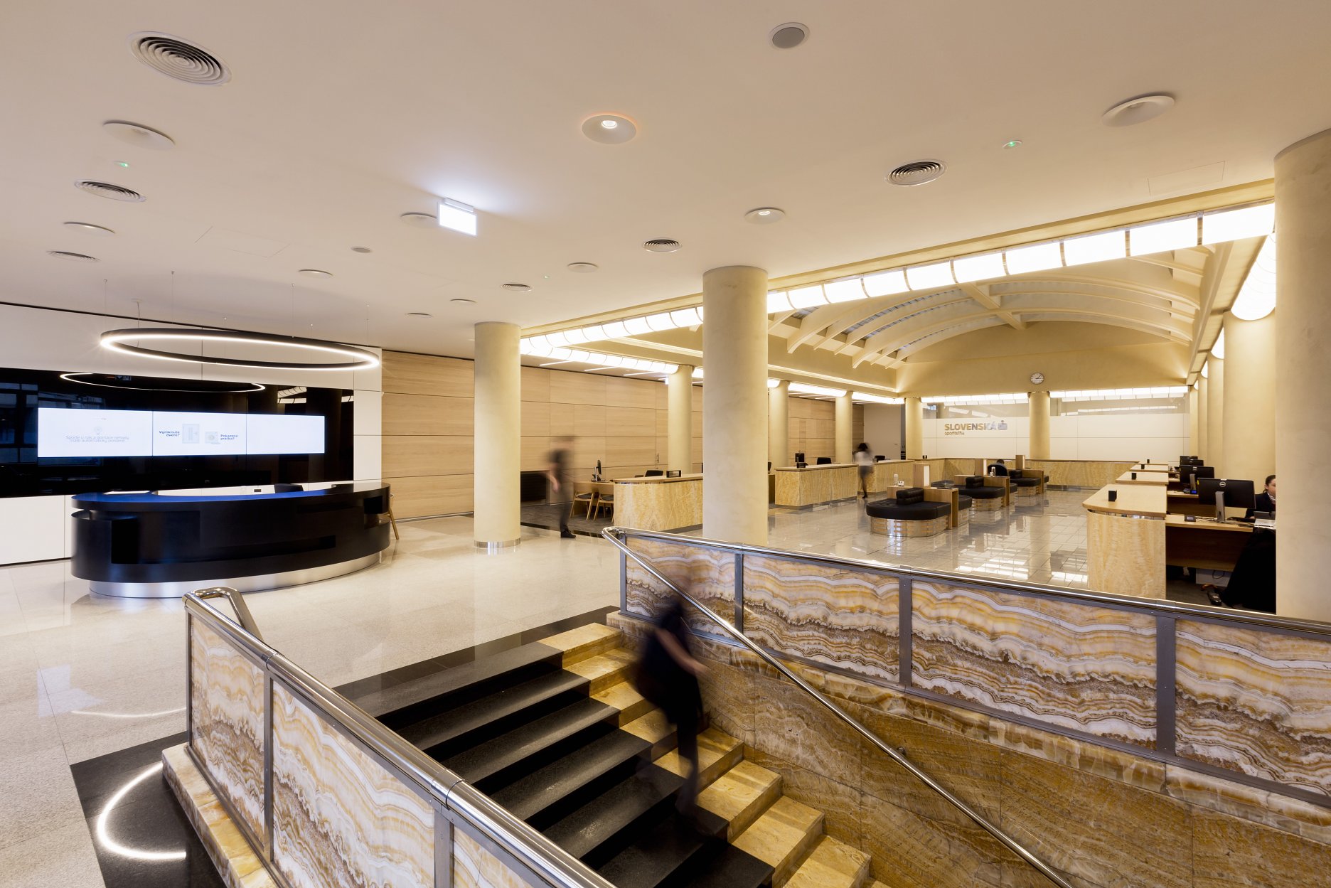 Najvýznamnejšou zmenou v zariadení bankovej haly bolo rozčlenenie priebežných zákazníckych pultov na menšie moduly, ktoré zodpovedajú novým prevádzkovým požiadavkam. Zariadenie sa po výraznej reorganizácii vracia bližšie k pôvodnému Tvarožkovému usporiadaniu. Pôdorysné umiestnenie pultov zodpovedá originálu, ich členenie však umožnilo prístup klientov k stolom bankových pracovníkov. Na ich pôvodnú celistvú formu odkazujú intarzie v podlahe, ktoré materiálovo reflektujú povrch pultov.