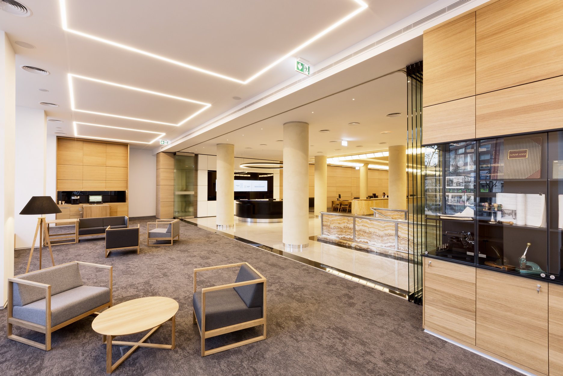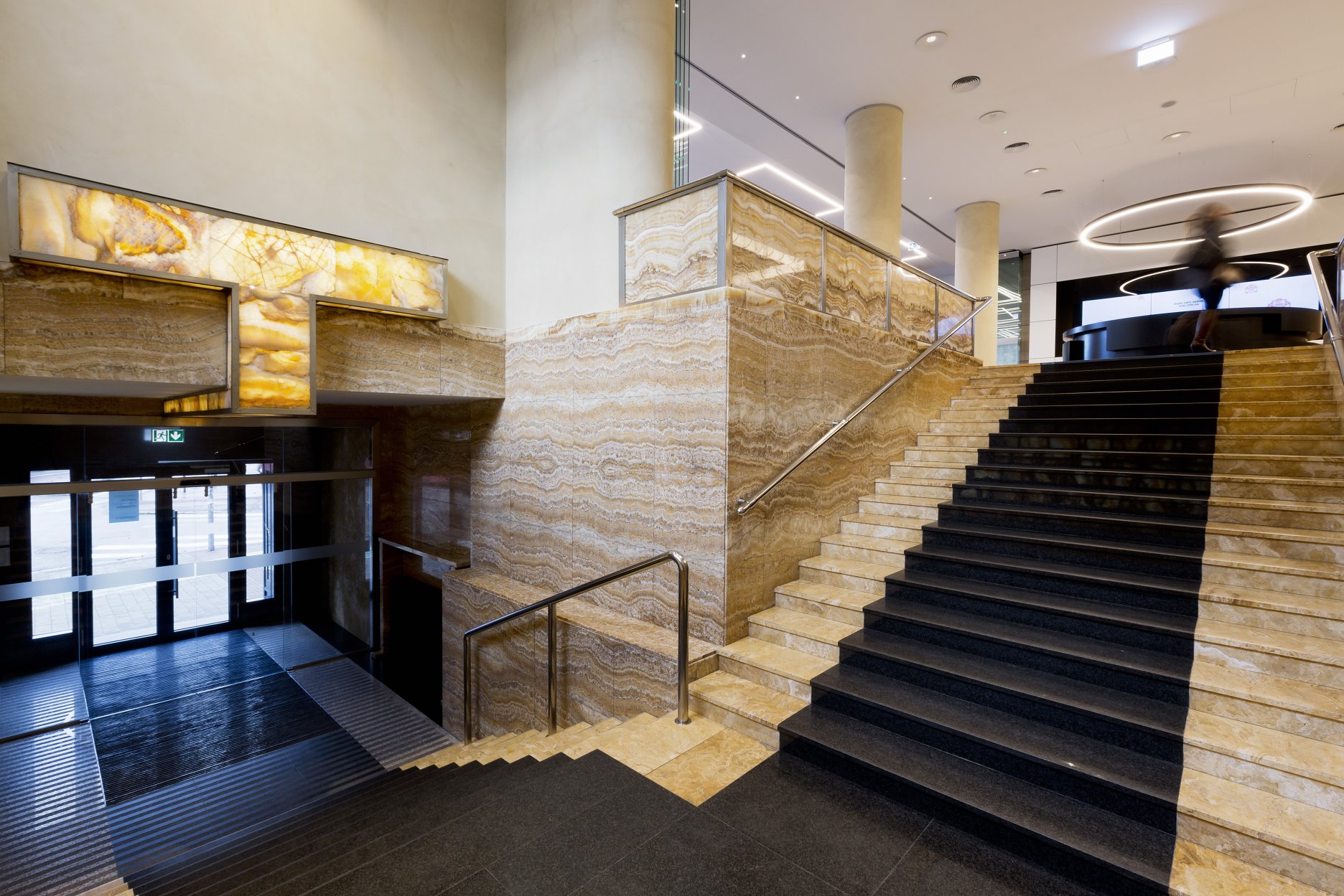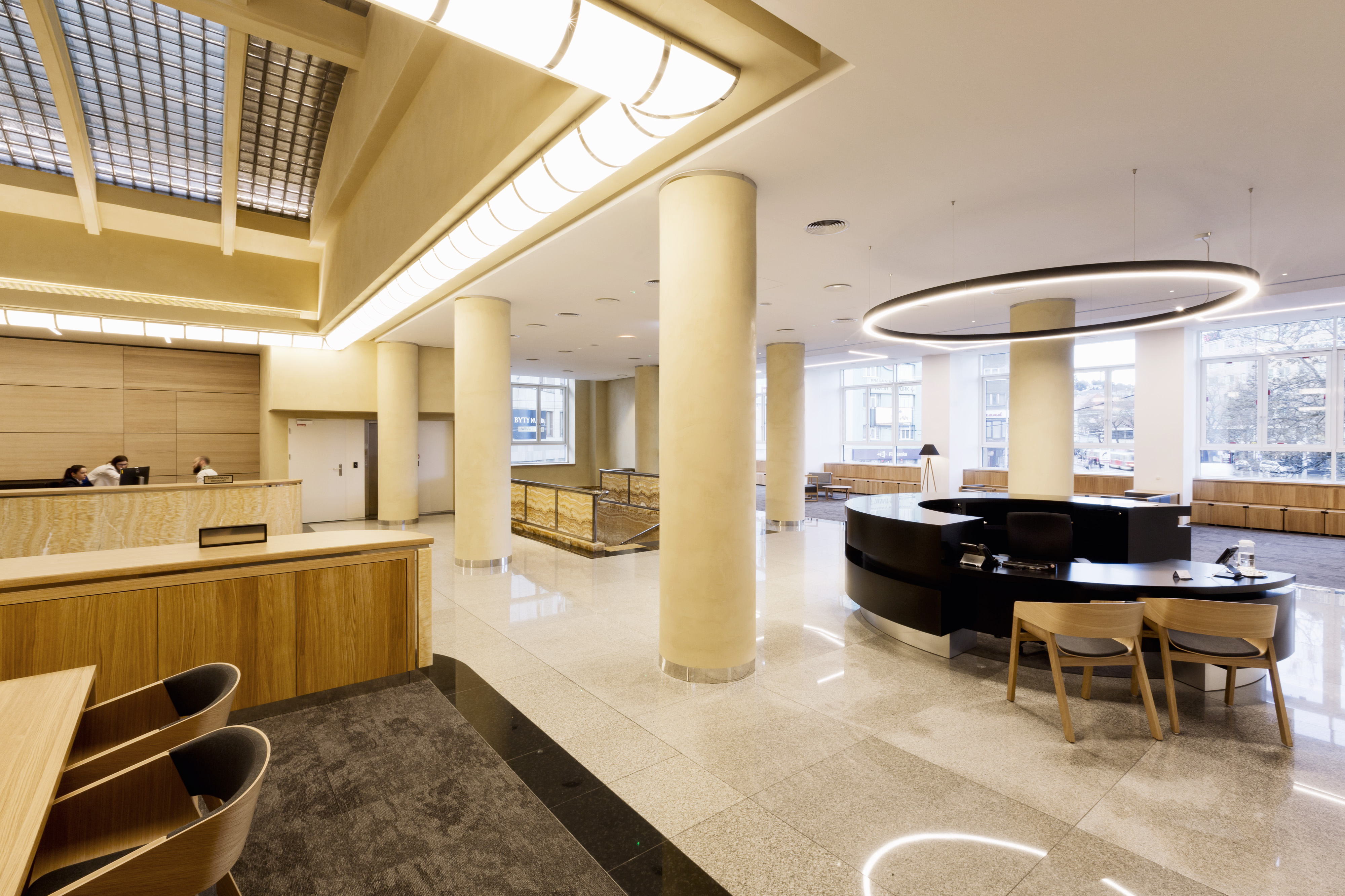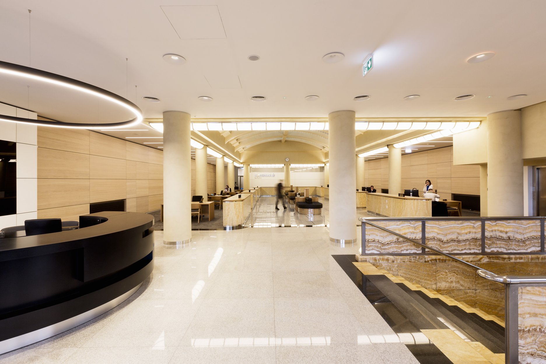 Pôvodný návrh kopíruje aj vstup do budovy. Kruhový turniket nahradila replika pôvodných dverí. Na svoje predošlé miesto pri vstupe boli prinavrátené aj dve mramorové plastiky významného bratislavského sochára Alojza Rigeleho, symbolizujúce Prácu a Sporivosť.