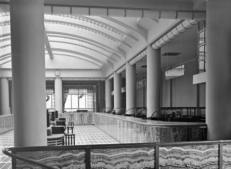 Súčasťou komplexného architektonického diela bol samozrejme aj verejný interiér banky. Vestibul a schodisko boli obložené vzácnym levickým zlatým ónyxom, osvetlenie zabezpečovalo svietidlo nad nástupnou terasou. Časť podlahy bankovej haly tvorili nosné sklobetónové tvárnice, ktoré zároveň presvetlovali pasáž vedúcu na prízemí. O poschodie vyššie našiel sklobetón uplatnenie ako výplň polí elegantnej železobetónovej klenutej konštrukcie. Prepážková ústredná hala je tak veľmi dobre osvetlená prirodzeným svetlom. Nákladné materiály a riešenia neboli použité prvoplánovo, decentne reprezentovali vážnosť inštitúcie.