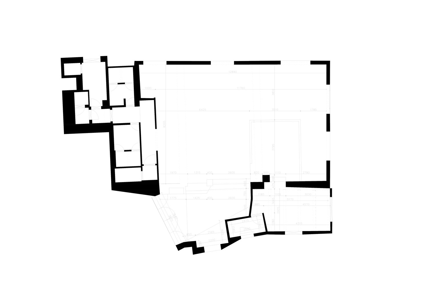Zužujúci sa lichobežníkový pôdorys vstupnej časti a zaoblená stena navádzajú priamo do odbytového priestoru. Ten sa celý otvára do jednej veľkej prevádzky s asymetricky umiestneným barom. V priestore dominuje bledá, béžová farba. Do farebnej schémy zapadajú steny so šúchanou interiérovou omietkou. Obvodové steny s oknami a dverami na terasu sú zakryté vrstvou závesov. Ďalšími prvkami, ktoré dodávajú priestoru mäkkosť sú zaoblenia rohov a klenbové oblúky medzi jednotlivými miestnosťami.