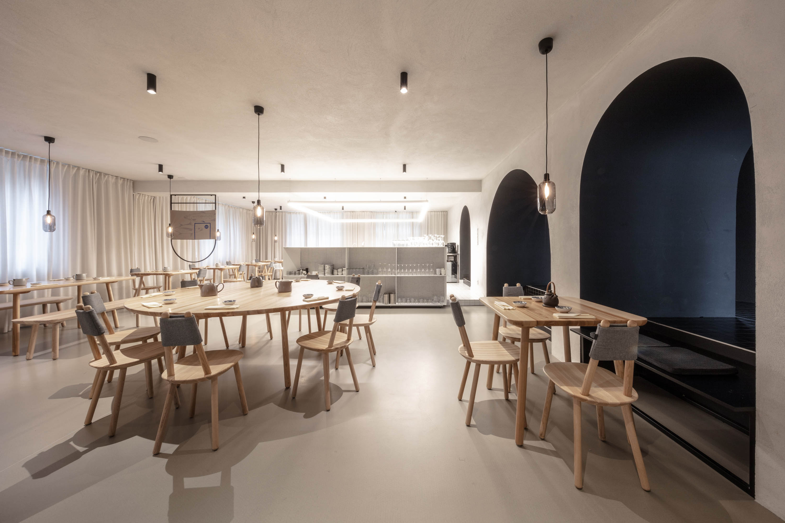 Tretiu farbu v interiéri dopĺňa drevený mobiliár. Lavice, stoličky a stoly sú z jelšového dreva. Výtvarné umenie sa objavuje na textilných paravánoch s kovovou konštrukciou v podobe sieťotlače s motívom rýb.