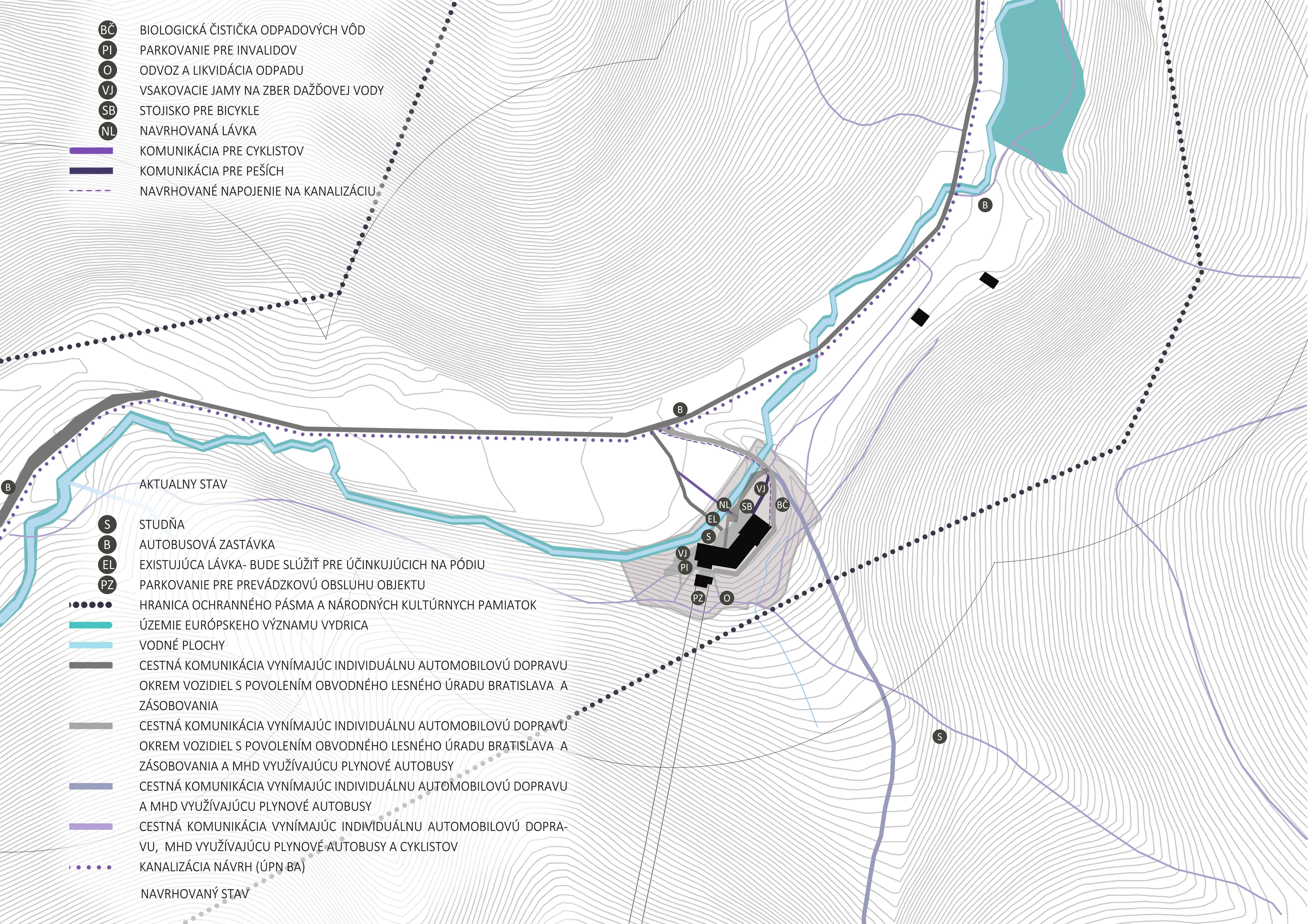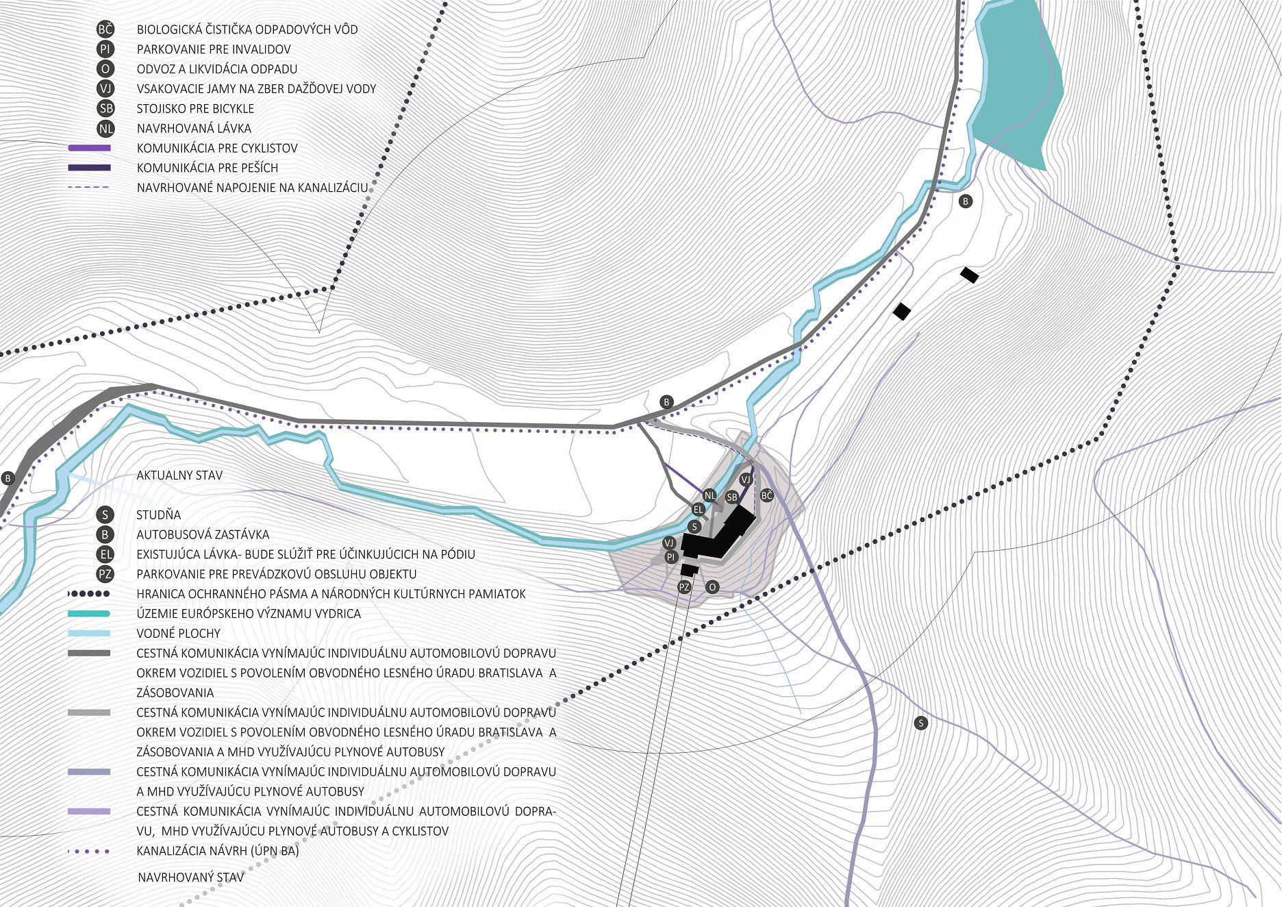 V blízkosti objektu sa nachádza viacero cyklochodníkov, na ktoré v mieste ich stretnutia návrh reaguje lokálnymi odpočinkovými priestormi, rovnako aj dostatočným množstvom novo-navrhovaných cyklistických stojísk. Z urbanisticko-kompozičného hľadiska je zásadný návrh pešieho chodníka smerujúceho z Drieňovskej lúky k objektu, ktorý vyvrchoľuje v priehľade medzi novým – vstavaným kubusom a budovou stanice lanovky. Riešenie kladie dôraz na bezbariérovosť, takže na toto miesto je možné dostať sa aj rampou pre invalidov. Rampa začína v bezprostrednej blízkosti parkovacieho miesta, ktoré je umiestnené na južnej strane fasády (približne pod trasou lanovky).