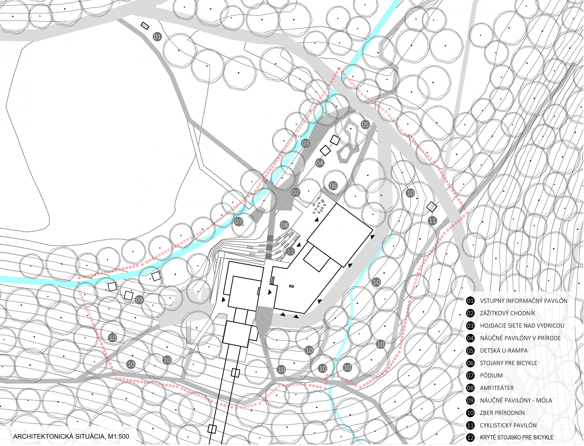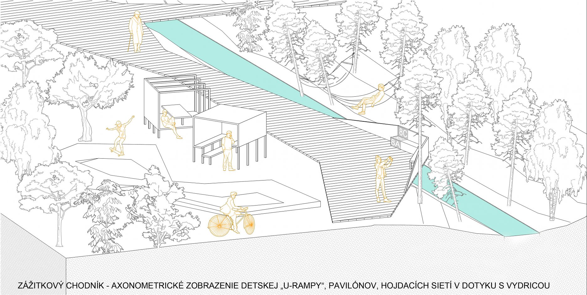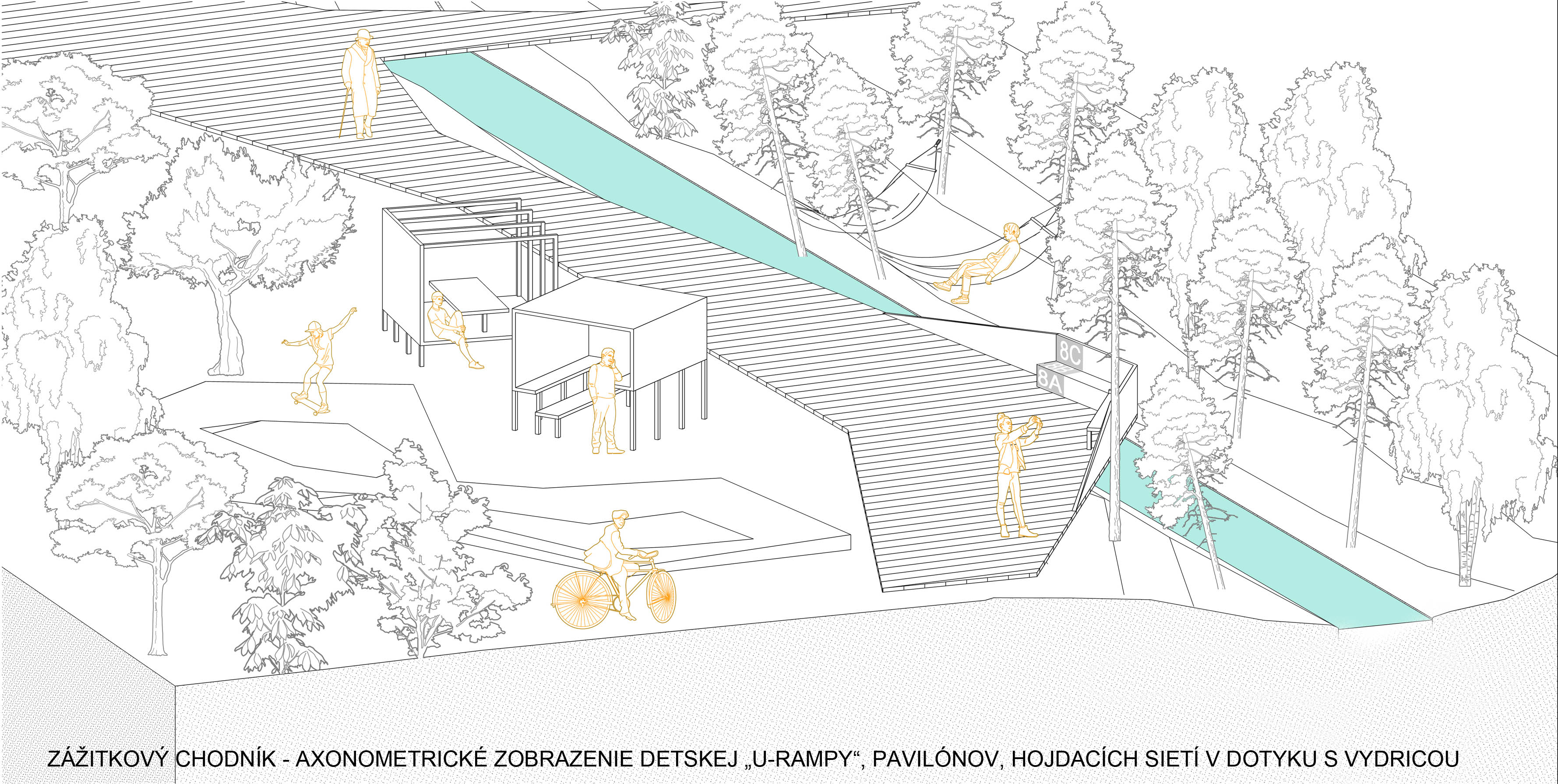 Verejné priestranstvá poskytujú širokú škálu využitia na trávenie voľného času všetkých vekových kategórií. Pre podporu edukačného charakteru a ozvláštnenie exponovaných plôch bol navrhnutý systém tzv. pavilónov, ktoré sú doplnené o „zážitkový chodník“, detskú cyklo „U-rampu“ a nové „mikro-zhluky“ krovín s drobnými plodmi (šípky, baza, maliny..). Tieto úpravy roztrúsené po lokalite podporujú cirkuláciu ľudí v prírode, ako aj ich aktívny odpočinok s možnosťou dozvedania sa nových informácií. S existujúcim detským ihriskom sa uvažuje na pôvodnom mieste v pôvodnom charaktere a v pôvodnej forme. Jeho napojenie je zabezpečené prepojením cez vodný tok novým mobiliárom slúžiaci pre deti.