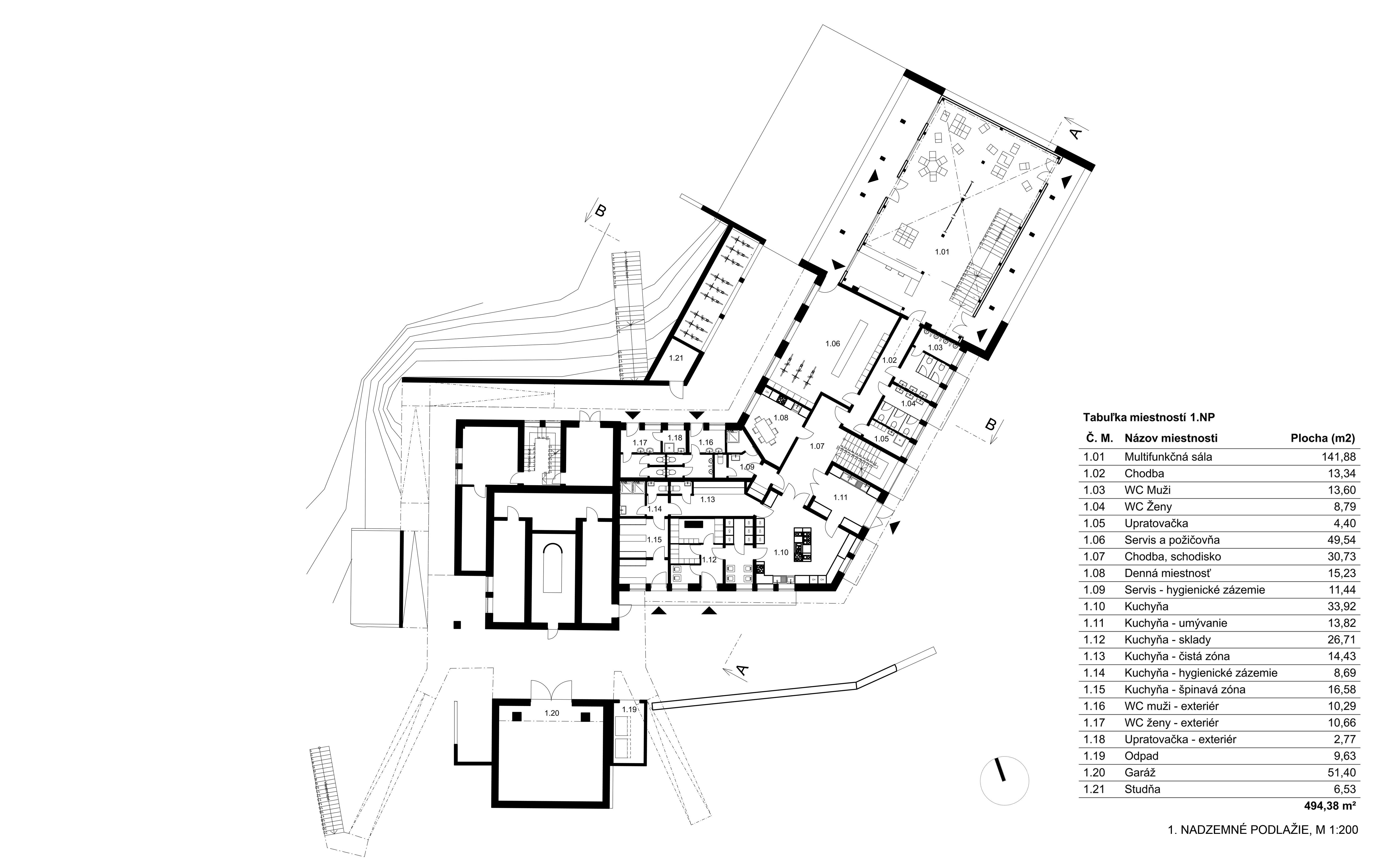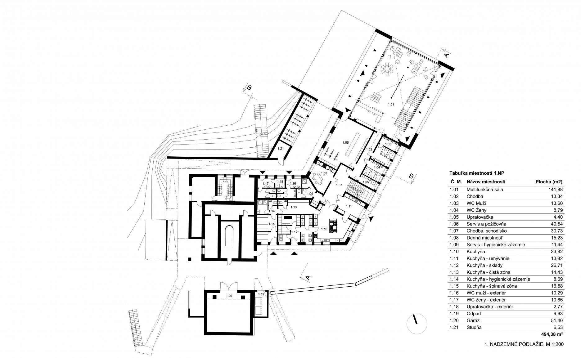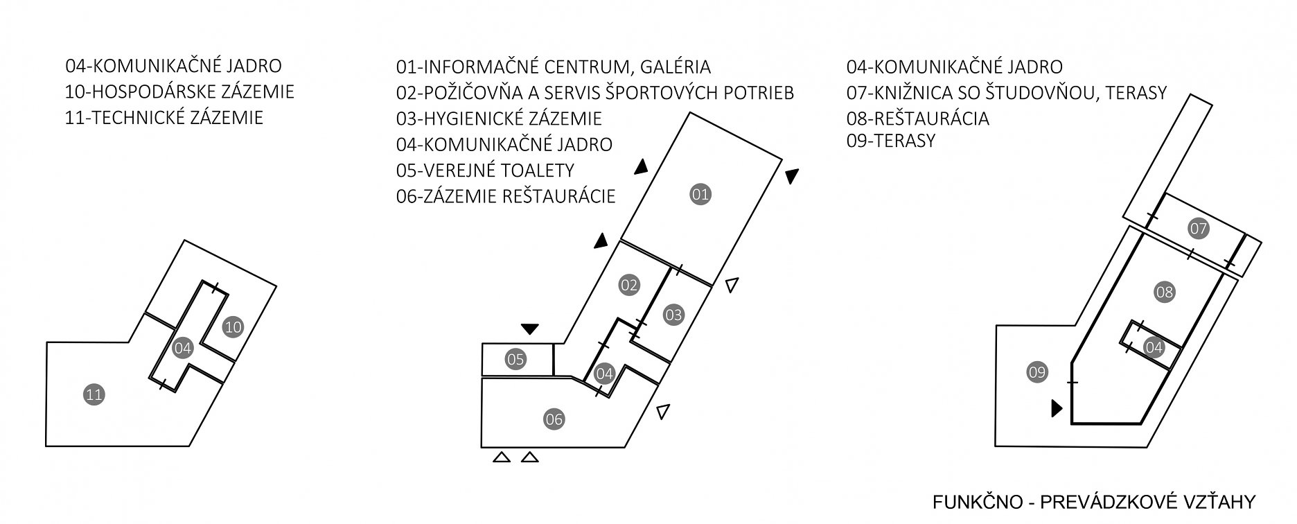 Spodné podlažie je v najlepšej kondícii, preto návrh uvažuje s jeho sanovaním , zachovaním a následným vybudovaním zázemia pre reštauráciu (kuchyňu, sociálne zariadenia prístupné pre stravníkov, ako aj toalety prístupné z exteriéru). V časti, ktorá je na vizuálne najdostupnejšom mieste, je umiestnený servis a požičovňa športových potrieb.