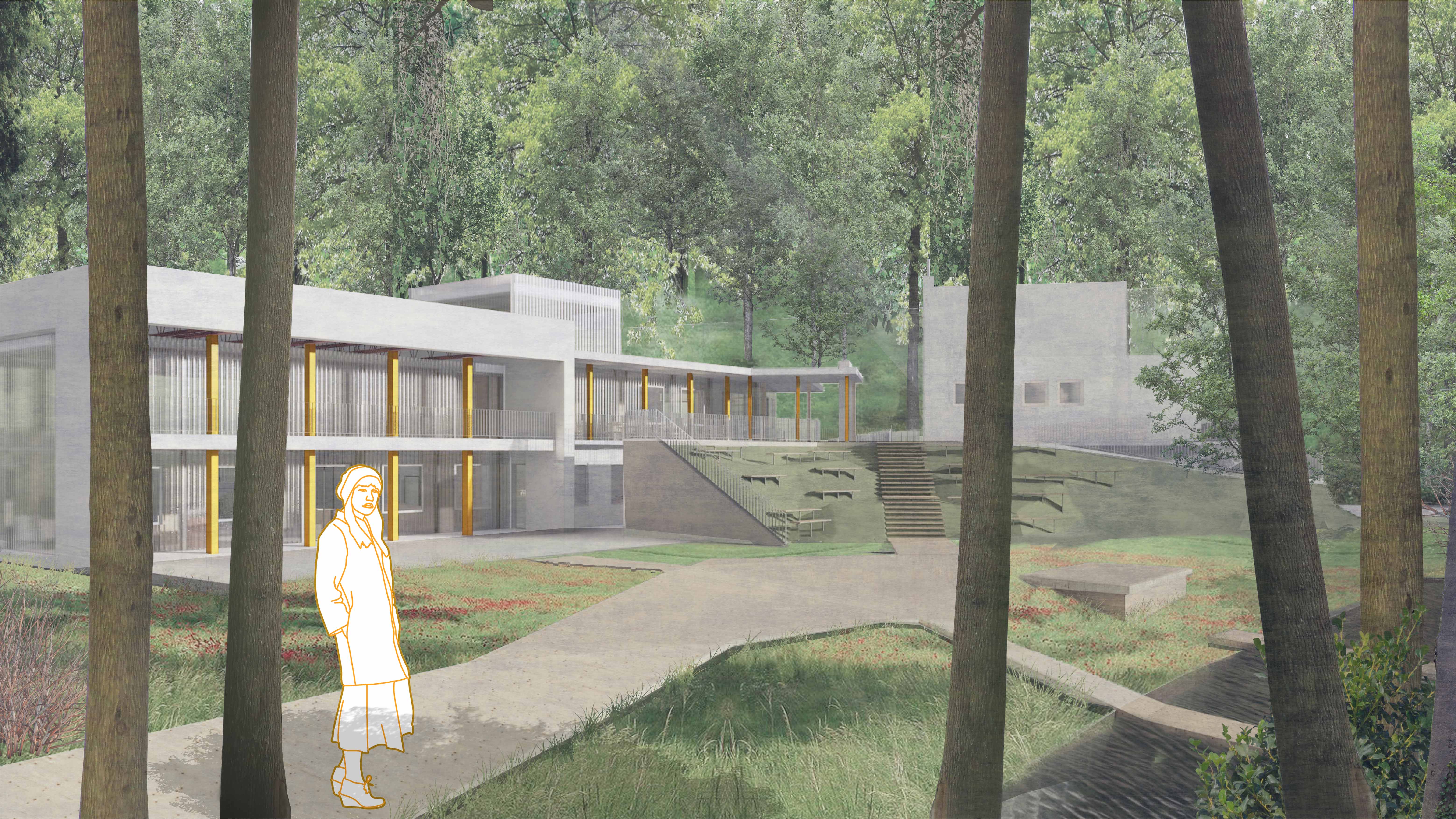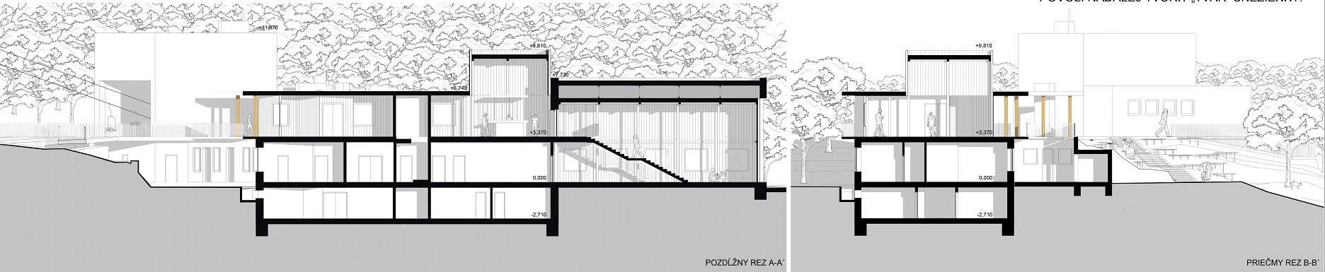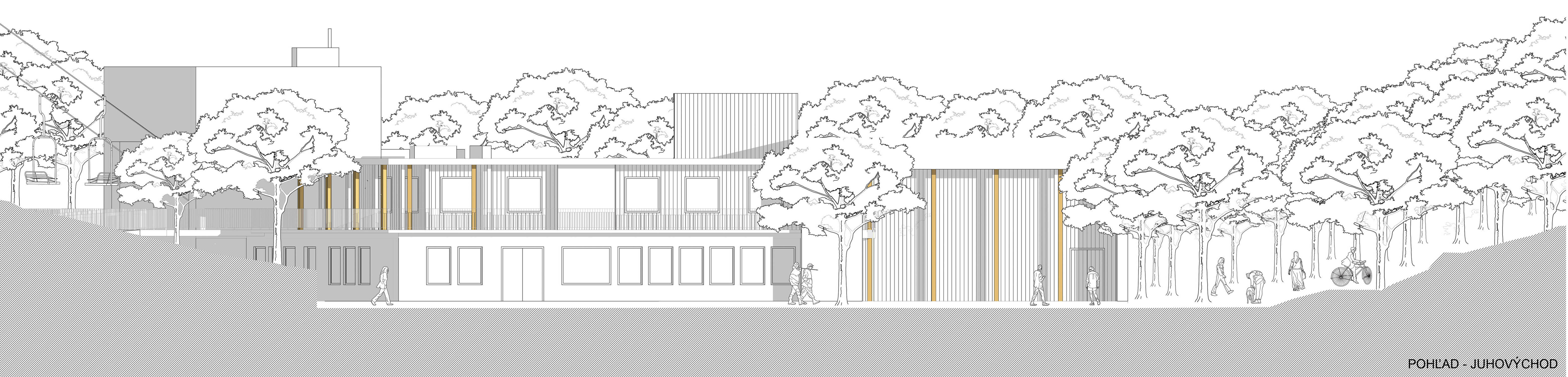 Fasáda je doplnená o transparentné okenné a dverné konštrukcie, slúžiace na vetranie a získavanie priamych pasívnych solárnych ziskov. Objekt je navrhnutý ako nízkoenergetický s rekuperáciou. Bude výhľadovo napojený na navrhovanú kanalizáciu podľa UPN Bratislava, dovtedy riešený biologickým septikom pri budove. Odpad z kuchyne je plánovaný na malo frekventovanej strane objektu s priamym dopravným napojením na zásobovanie. Parkovacie miesta pre personál sa nachádzajú taktiež v tejto časti pozemku. Dažďová voda bude zachytávaná do dvoch vsakovacích šácht umiestnených na opačných koncoch v rámci pozemku, pri budove).