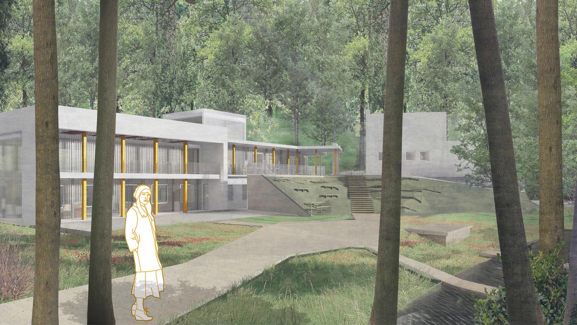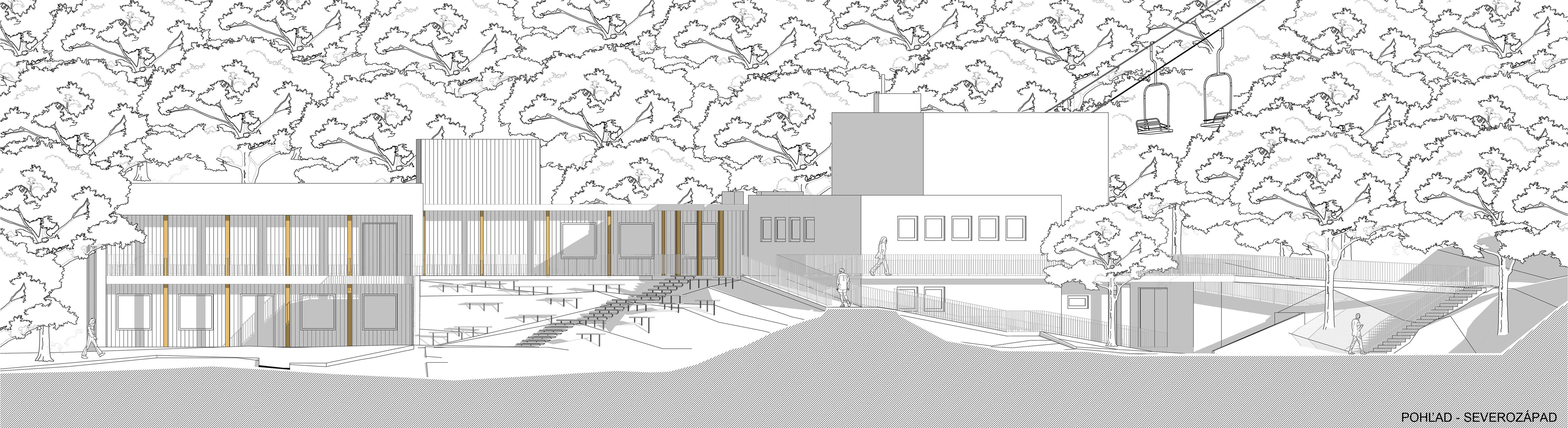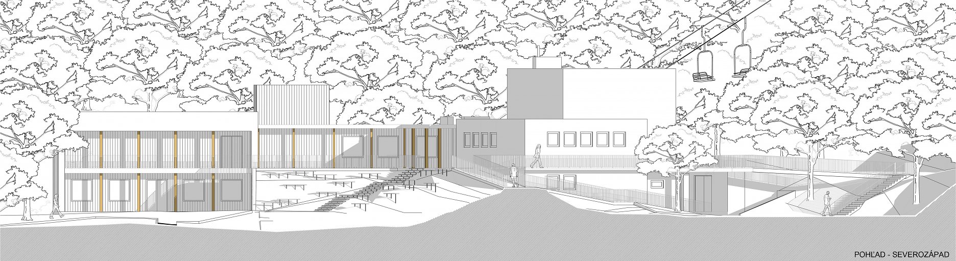 Najexponovanejší pohľad na objekt – severozápadný – od Drieňovskej lúky, jasne naznačuje jeden z ťažiskových zámerov návrhu, a to snahu o čiastočné optické eliminovanie rušivej fasády 1. nadzemného podlažia. Navŕšenie terénu k tejto fasáde (s jeho dostatočným odsadením, aby bolo zabezpečené dostatočné presvetlenie a prevetranie interiéru servisu a predajne športových potrieb) vytvára kulisovú „masu zelene“, ktorá opticky zmenšuje veľký objem objektu a zo severozápadnej strany ho čiastočne zakrýva. Táto terénna úprava zároveň vytvára komornejší prírodný amfiteáter, ktorý prináša veľa možností pre rozmanité kultúrne podujatia. Pod amfiteátrom sú umiestnené stojiská pre bicykle, rovnako aj existujúca studňa, ktorá je naďalej prístupná. Stojiská pre bicykle sú umiestnená tak, aby boli na viditeľnom mieste priamo z terasy reštaurácie a zároveň môžu slúžiť pre odklad bicyklov pre servis.