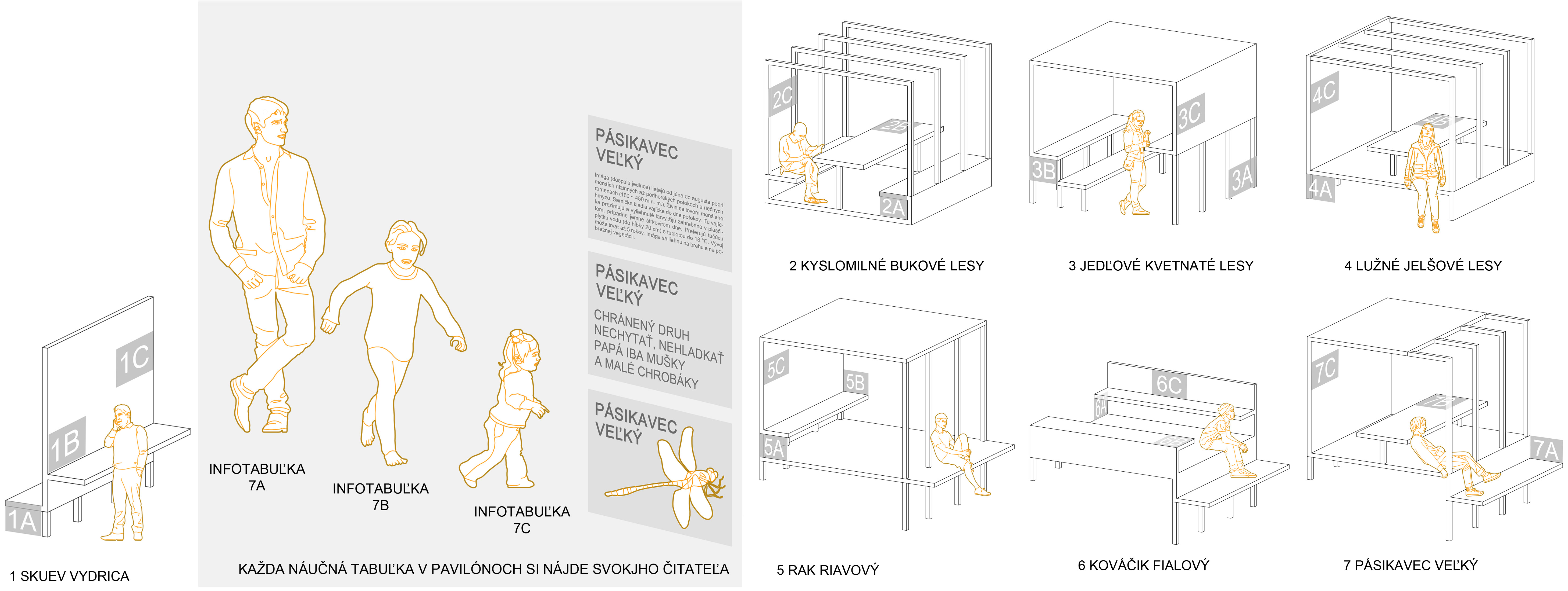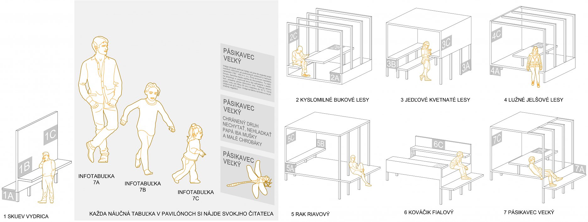 Systém pavilónov je založený na jednoduchých exteriérových priestoroch, ktoré poskytujú rôzne formy stolovania/oddychovania s výhľadmi na zaujímavé lokality. Sú venované jednotlivým chráneným druhom lokálnej fauny a flóry tak, aby dokázali zaujať všetky vekové skupiny – v najnižších miestach (v zornom poli najmenších detí) sú umiestnené zjednodušené ilustrácie, vo vyššej polohe (pre čerstvo školopovinné deti, ktoré vedia čítať) sú doplnené o pár zaujímavostí a základných informácií, zatiaľ čo tabuľky v najvyššej polohe obsahujú podrobnejší popis ich života a spôsobov ochrany.