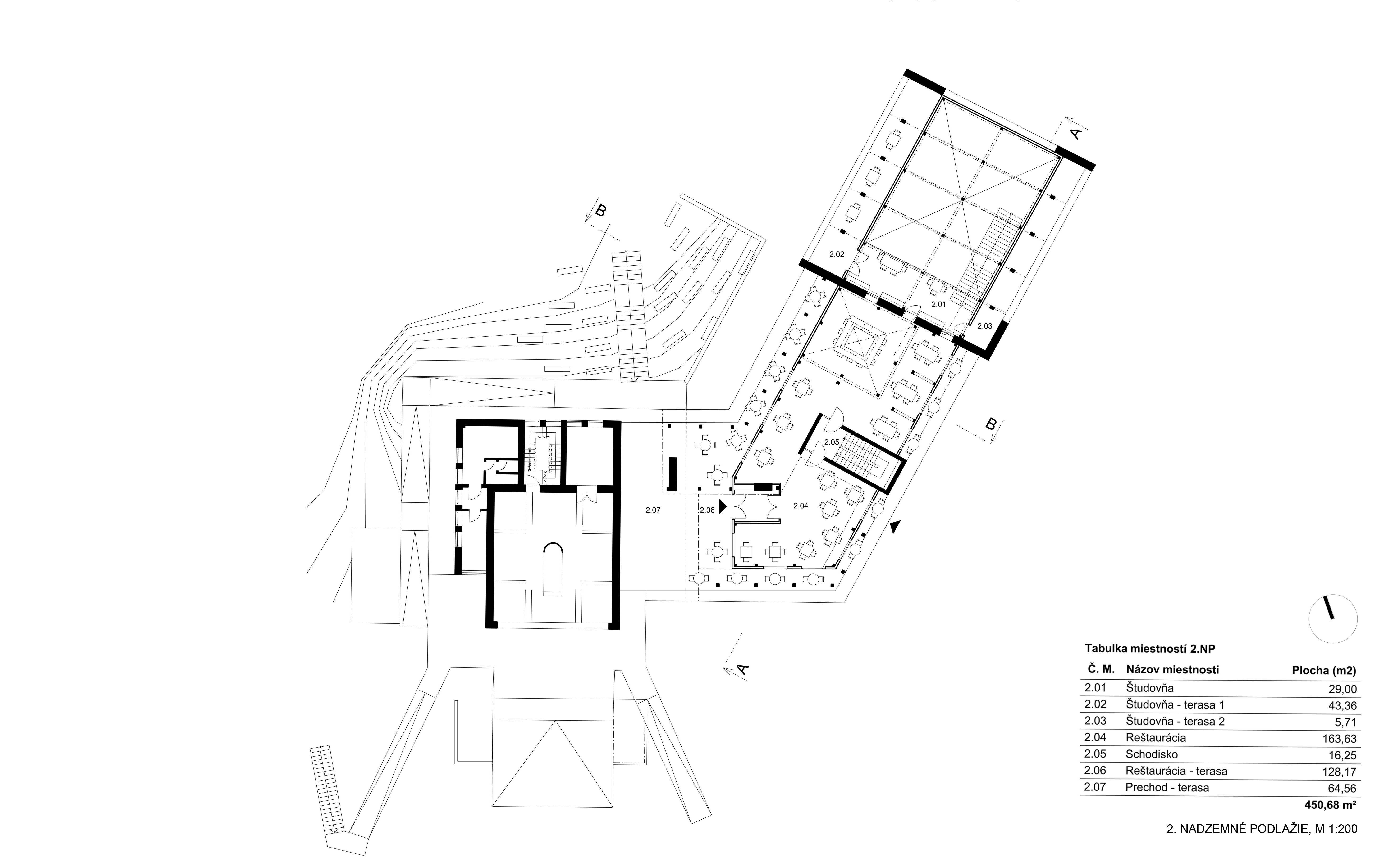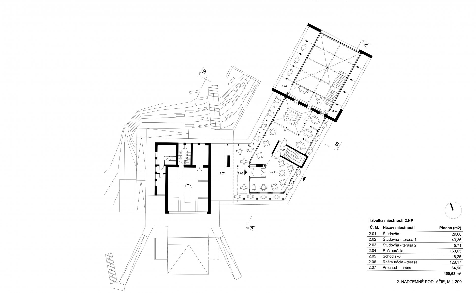 Do segmentu, ktorý v minulosti prepájal tento dominantný dvojpodlažný galerijný priestor s budovou údolnej stanice lanovky, vstupuje otvorom v úrovni druhého nadzemného podlažia. V týchto miestach - vzhľadom na potenciál kontaktu s prírodným okolím a atraktívnymi výhľadmi - je ponad Drieňovskú lúku navrhnuté reštauračné sedenie, ktoré takto kopíruje niekdajšiu polohu reštauračnej terasy so stolmi a sedením.
