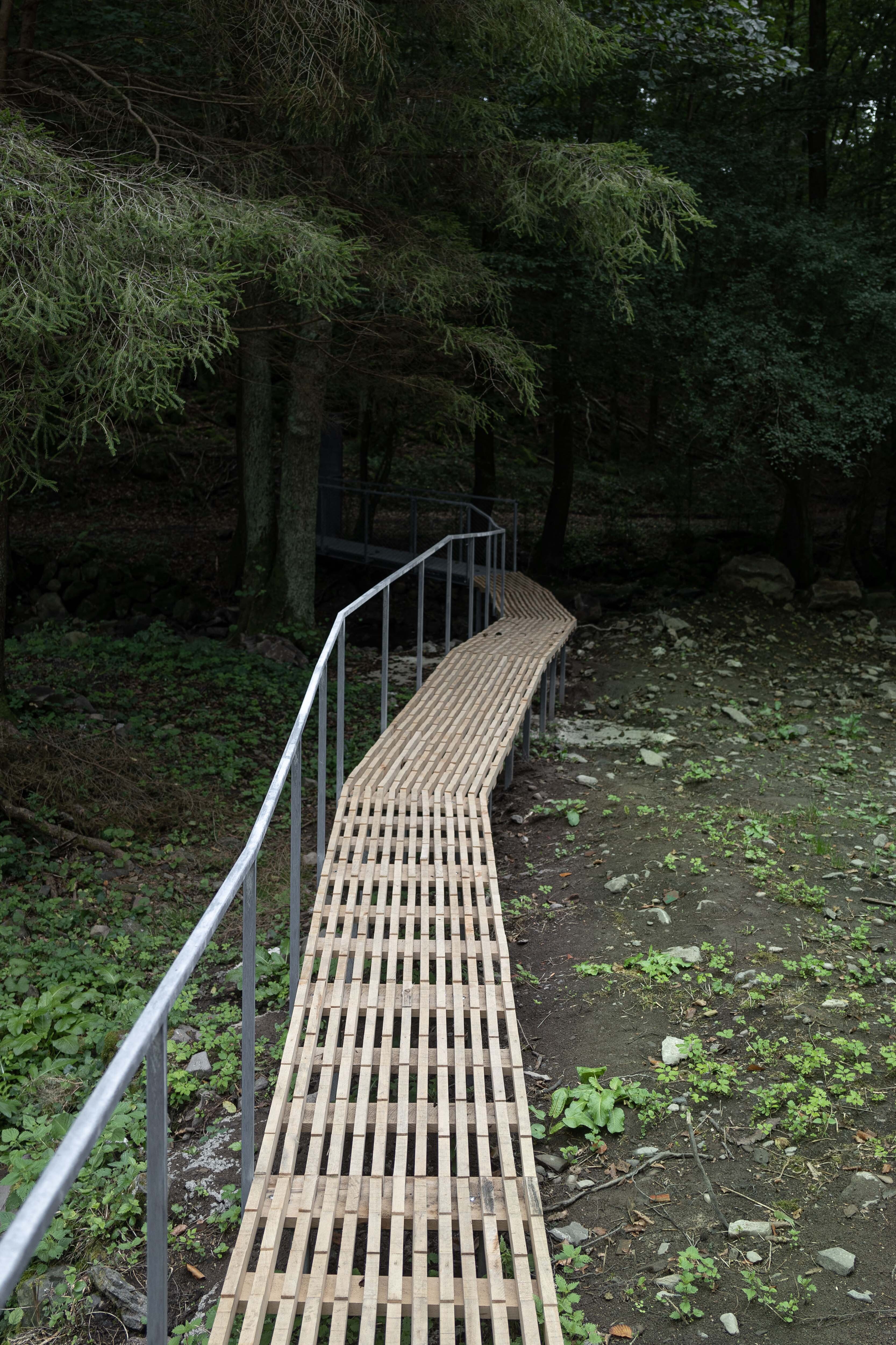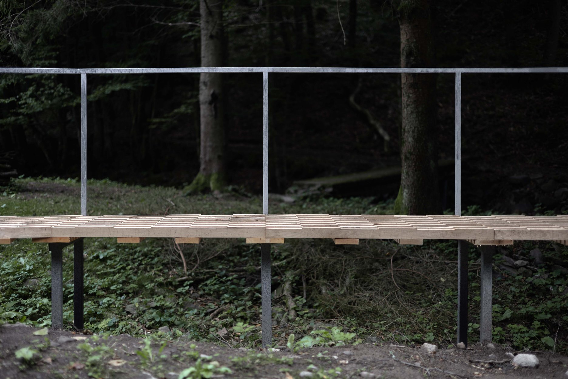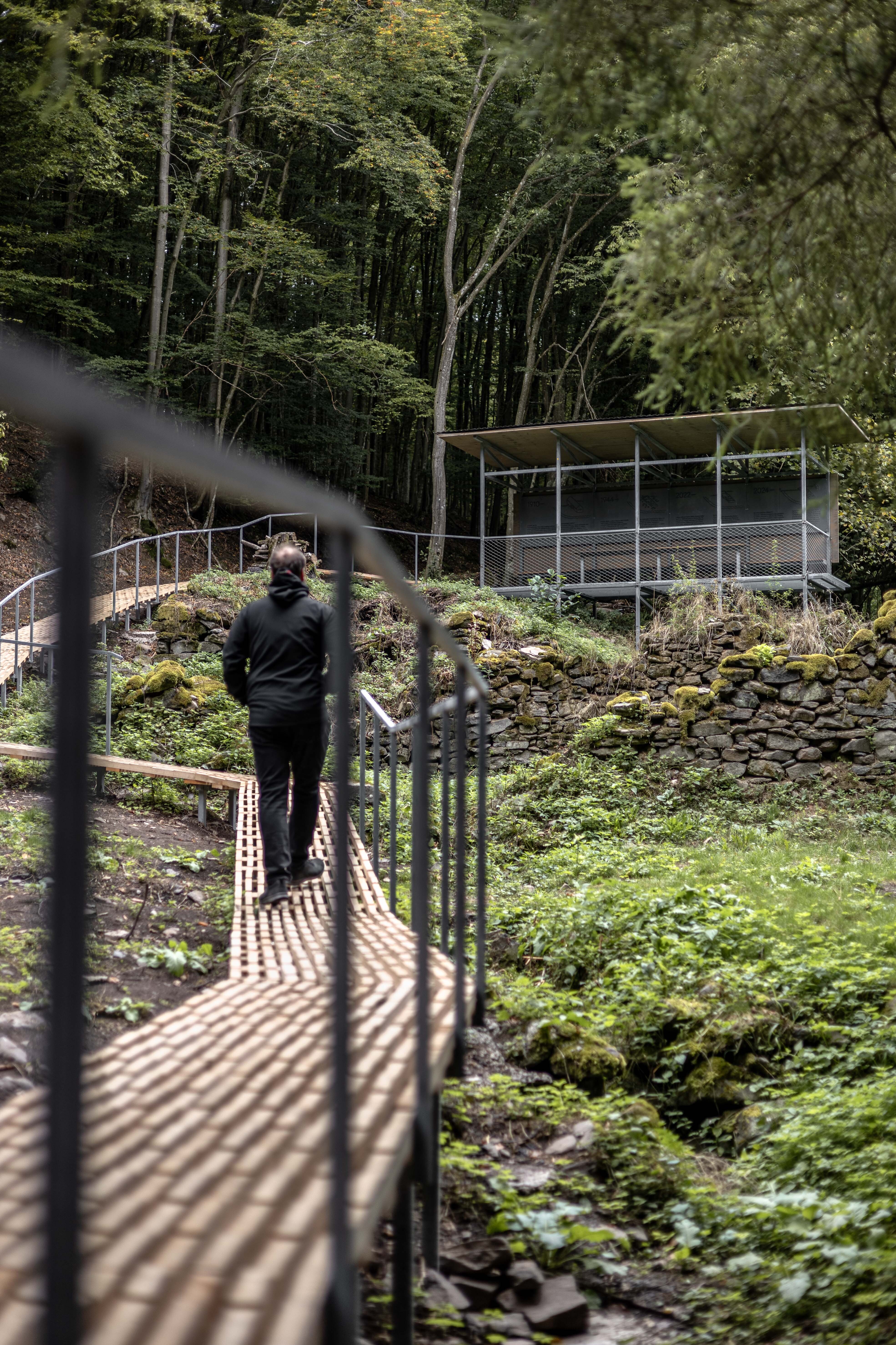 Vyhliadka na konci chodníka upriamuje pozornosť na samotné zrúcaniny mlyna, pričom sa návštevníkovi otvára výhľad na celú dolinu. Umožňujeme mu vnímať kontexty prístupovej cesty, potoka a pôvodného mlynského náhona.