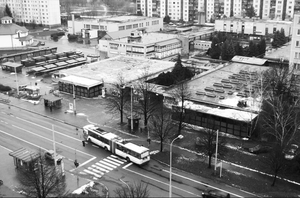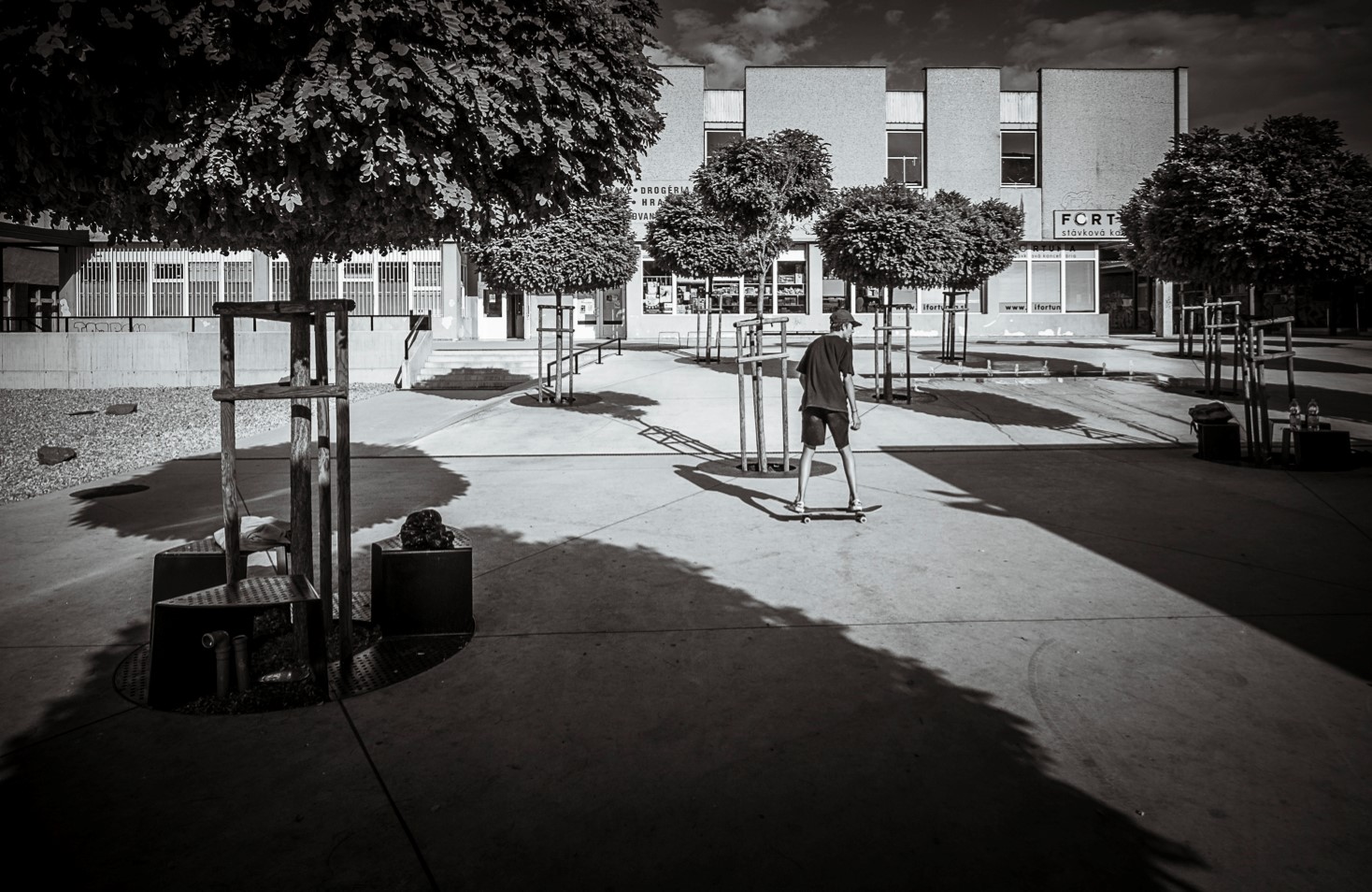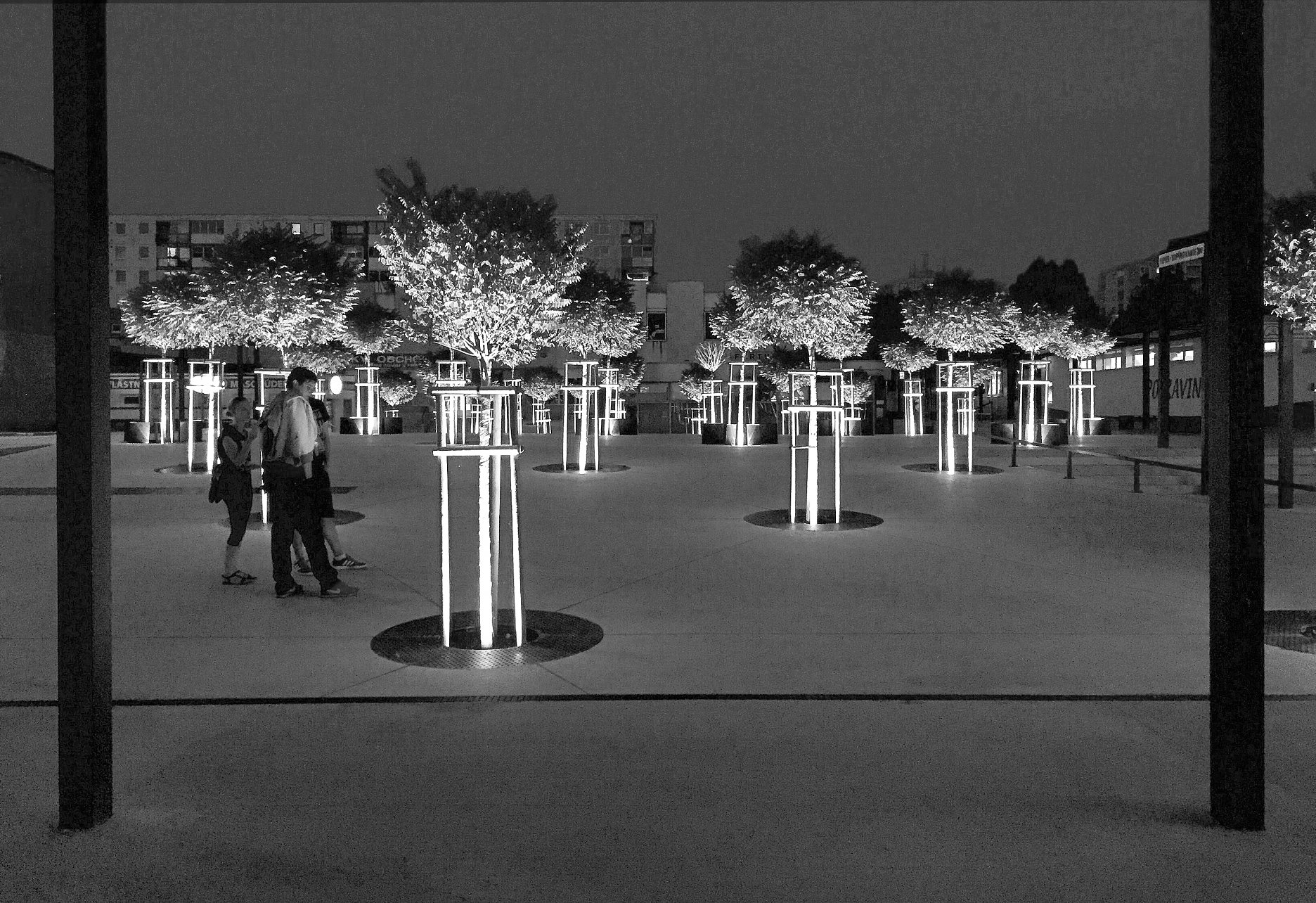Veľkorysé urbanistické gesto - vloženie „zvlneného koberca“ je súčastne hlavným výtvarným motívom, ovládajúcim celý vnútorný priestor nákupného strediska Centrum. Zvlnená geometria koberca - „nová topografia“ vytvára prehľadnú schému a hierarchizuje priestor „namestia“. Spevnená plocha je pozadím, na ktorom sa uplatňujú jednotlivé vrstvy: svietidlá, zeleň, drobná architektúra.