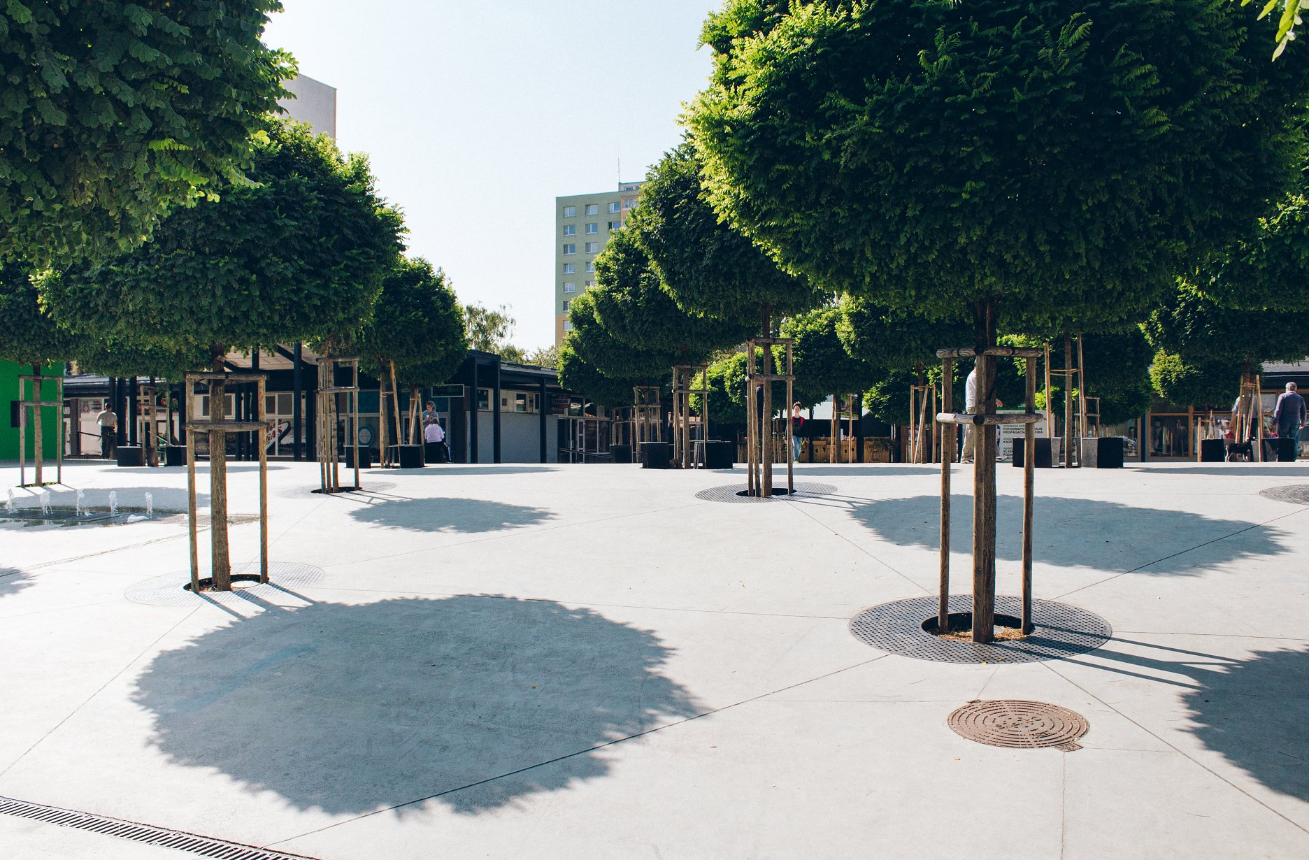 Dôležitým zásahom je prehodnotenie polohy i charakteru pôvodnej fontány. Vodný prvok, je realizovaný v podobe troch elementov, v rôznych častiach námestia. Tieto prvky su zabudované do plochy námestia. Prúd vody strieka z trysiek ukrytých pod oceľovými pochôdznymi roštami do výšky trištvrte metra. Keďže centrálny priestor vnímame ako námestie, prehodnotili sme stvárnenie zelene. Zeleň je v našom riešení usporiadaná v pravidelnom rastri 6x6x6 m. Toto riešenie zabezpečuje prehľadnosť a priechodnosť vnútorného priestoru a jeho prirodzené rozdelenie na zóny, rovnako ako výtvarnú jednoznačnosť nového urbanistického riešenia. Vo väzbe na zeleň sú lokalizované na pevno zabudované lavičky integrované do ochrannej mreže k stromom slúžiace pre oddych a posedenie nakupujúcich i čakajúcich. Tieto sedacie prvky sú doplnené o typové lavičky pri hlavných peších ťahoch.