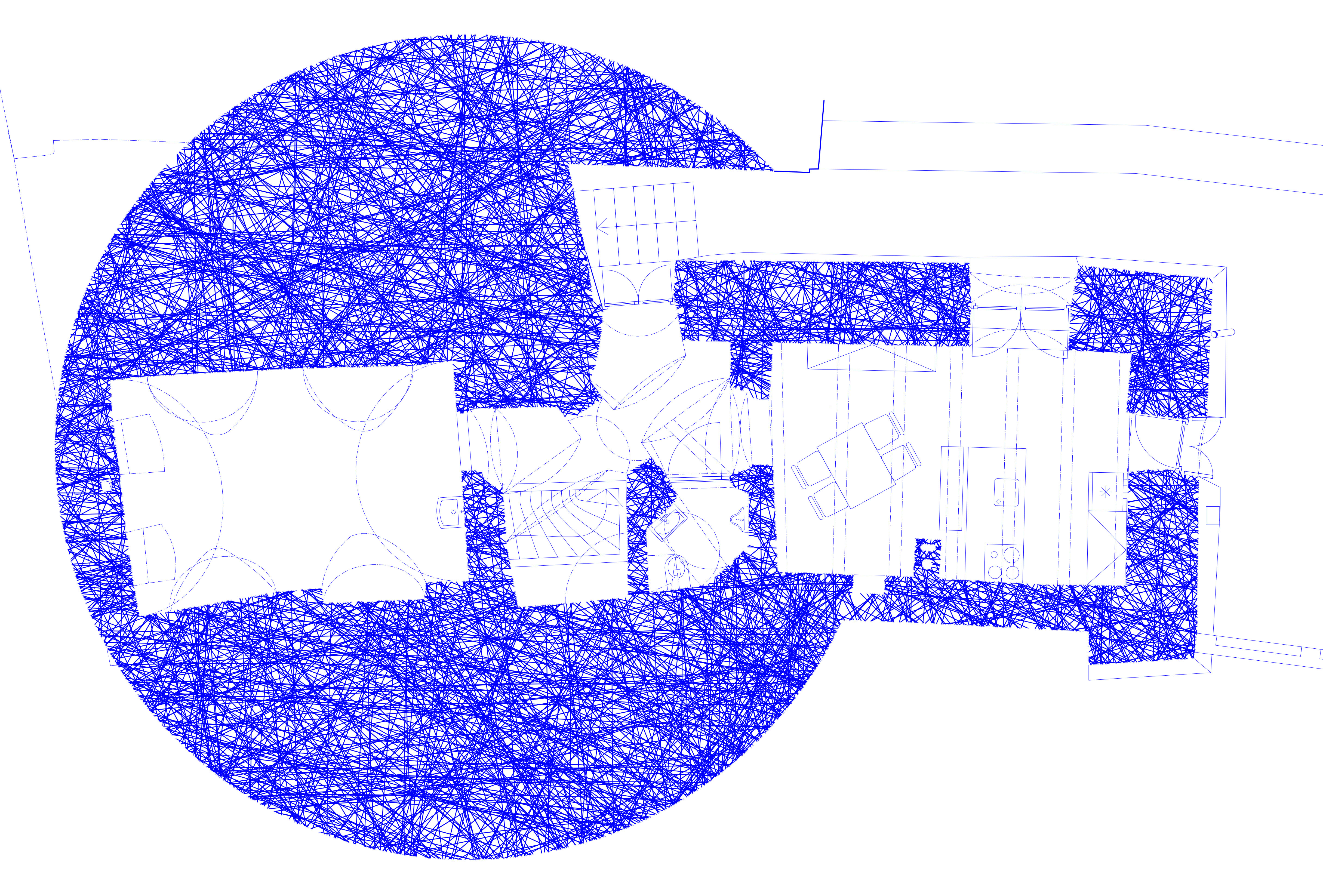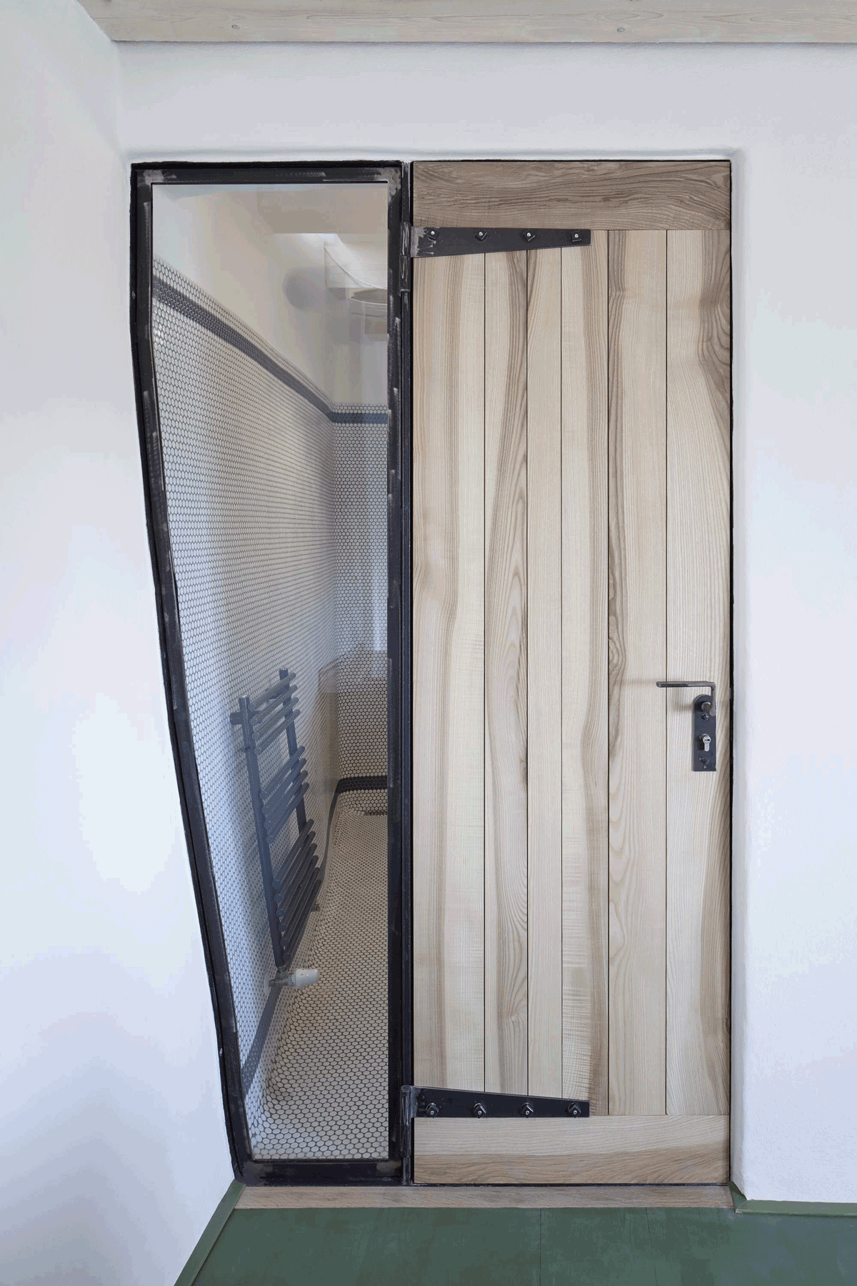Keďže v dome nenájdete jedinú rovnú stenu alebo pravouhlý otvor, všetky nové prvky bolo potrebné vyrobiť na mieru. Zariadenie odzrkadľuje cit autorov pre detail a kvalitu remeselnej práce. Zaujímavosťou je, že architekti mali najprv riešiť len interiér. “Původně byl naším zadáním pouze projekt interiéru. Postupně nám ale došlo, že se nedá řešit interiér a exteriér odděleně, že prostor a tvary se přelévají a vytváří nedělitelný celek.”