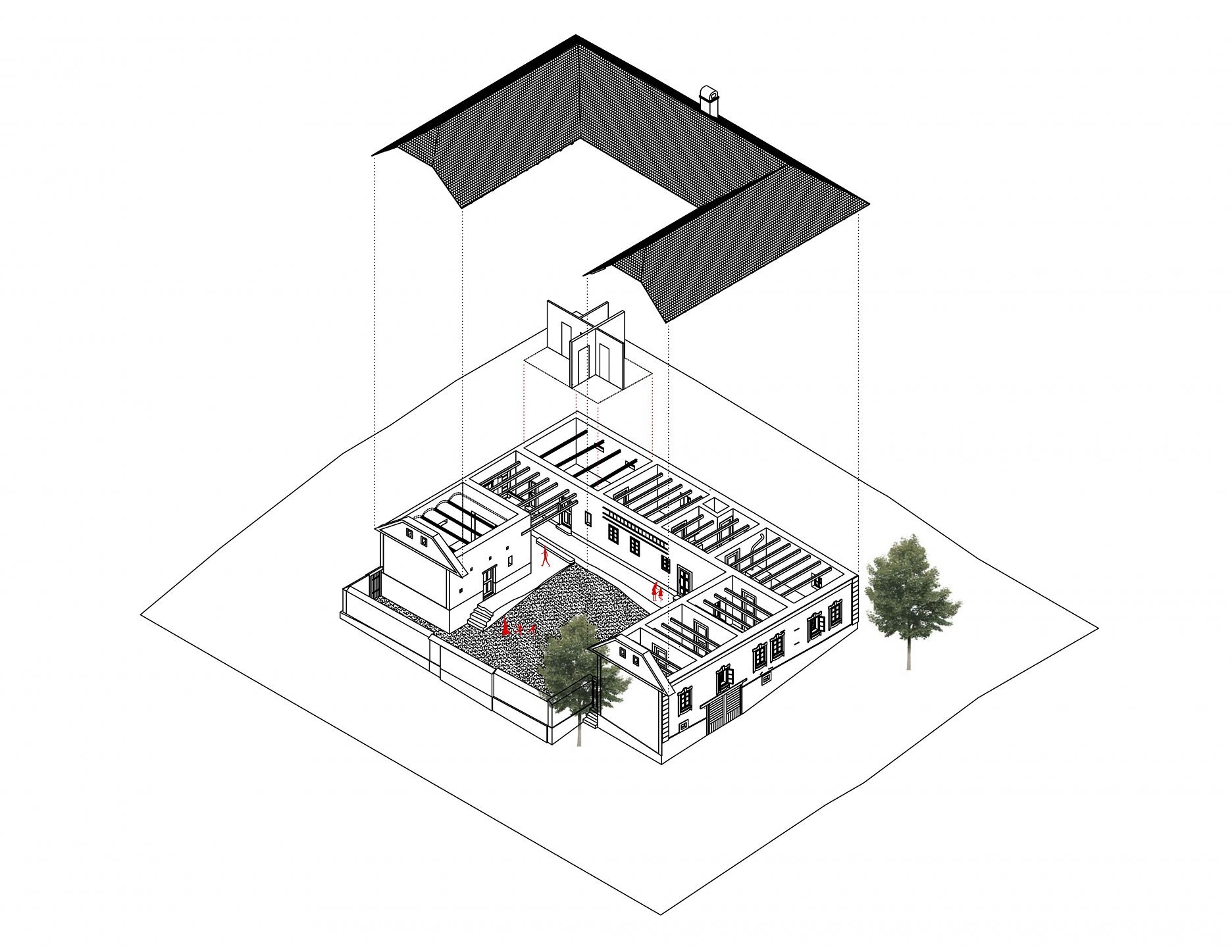 Do objektu je vložená nová funkcia umeleckej rezidencie a nové dispozičné prvky - ateliér a hygiena, ktoré v objekte nikdy predtým neboli prítomné. Tieto sú vkladané do miest, ktoré pôvodne slúžili odlišným funkciám - do maštale a šopy. Aj tieto uvedené funkcie sa v pôvodnom objekte menili a putovali.