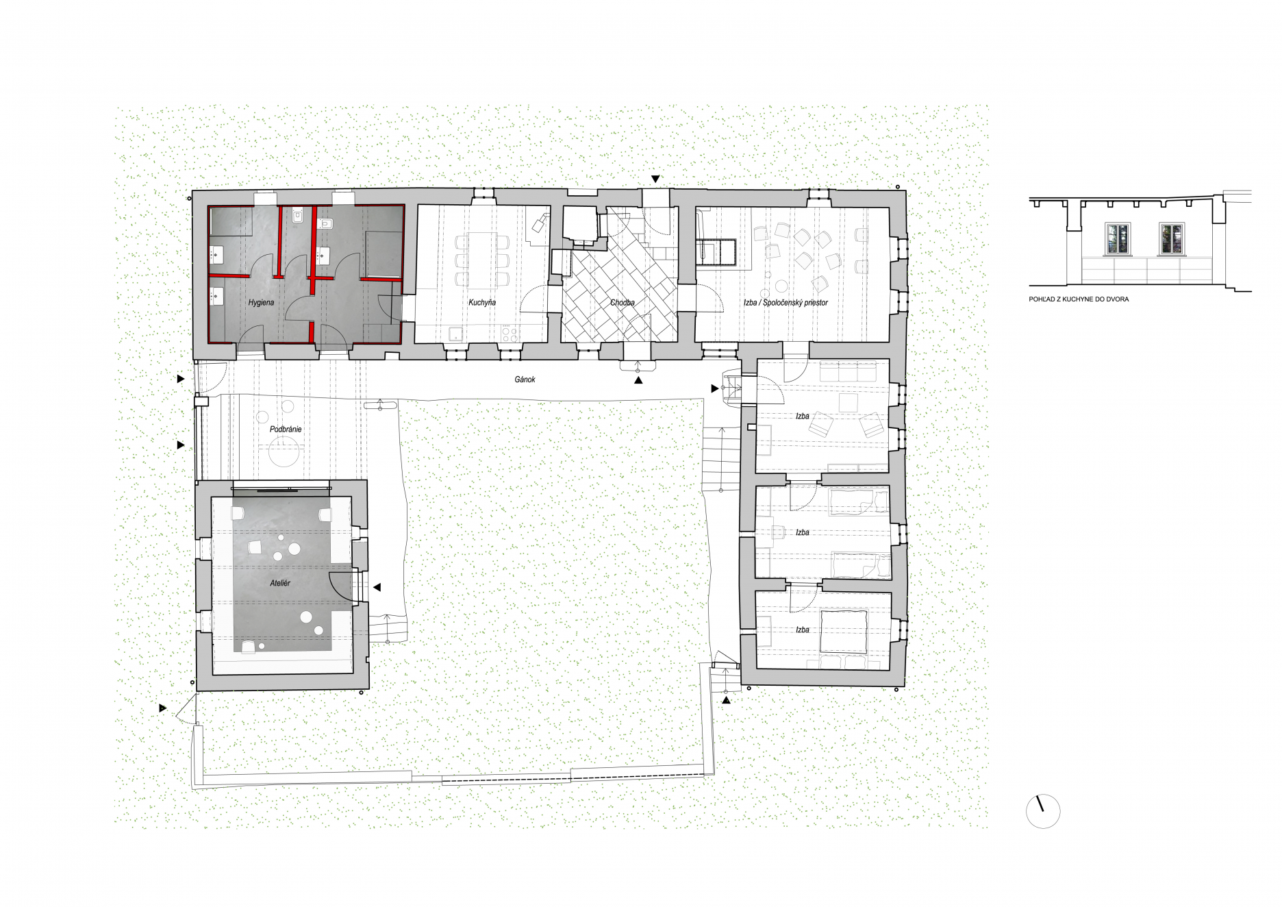 V centrálnej polohe dispozície sa nachádza zo severnej strany prístupná chodba, z ktorej sa vstupuje do veľkej obytnej miestnosti s pecou a tromi menšími izbami na „výškach“. Tieto budú slúžiť ako malý ateliér a dve spálne. Veľká miestnosť má variabilné využitie ako ateliér, spoločenská miestnosť, výstavný priestor a pod. Na druhej strane - smerom na západ, sa vstupuje do kuchyne. Na konci dispozície v západnej časti je umiestnená hygiena, slúžiaca rezidentom aj verejnosti, ktorá sa bude zúčastňovať umeleckých eventov. Hygiena je prístupná z obytnej časti - z interiéru, cez kuchyňu alebo samostatnými vstupmi z exteriérového podbránia. Na tejto úrovni, na trochu nižšej nivelete je v samostatnej časti situovaný ateliér. Je prístupný pôvodným vstupom z dvora do maštale, ale aj novým, veľkým prepojením s podbráním. Tento exteriérový priestor okrem primárnej komunikačnej funkcie, ktorú pôvodne plnil, bude slúžiť aj na umeleckú tvorbu a výstavy v krytom exteriéri.