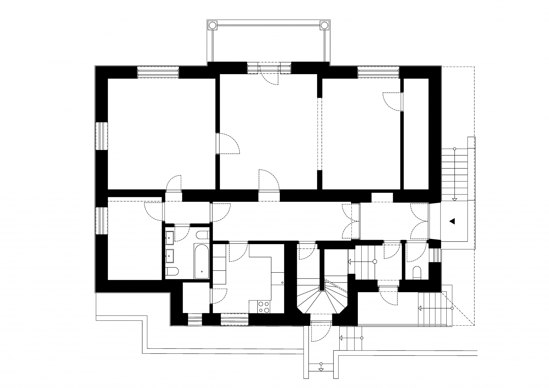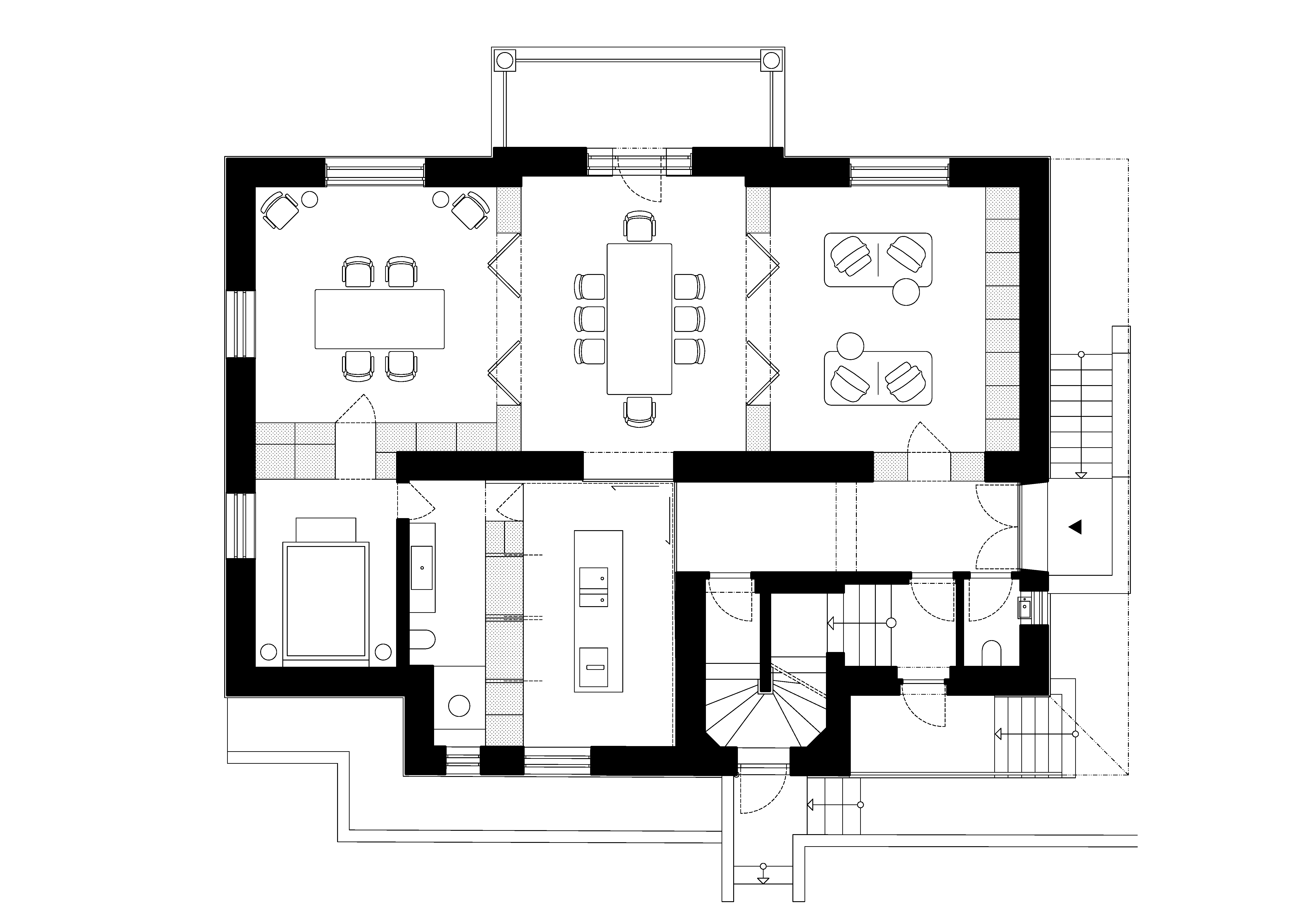 Zámerom pôdorysných úprav bolo maximalizovať úžitkovú plochu priestorov, s dôrazným prihliadaním na zachovanie pôvodných kvalít, jednou z ktorých je impozantná enfiláda. Skladacie dvere enfilády ponúkajú rôzne možnosti tvarovania priestoru, od úplne otvorenej konfigurácie, kedy sa miestnosti menia ne jeden veľký spoločenský priestor, až po uzavreté samostatné miestnosti.