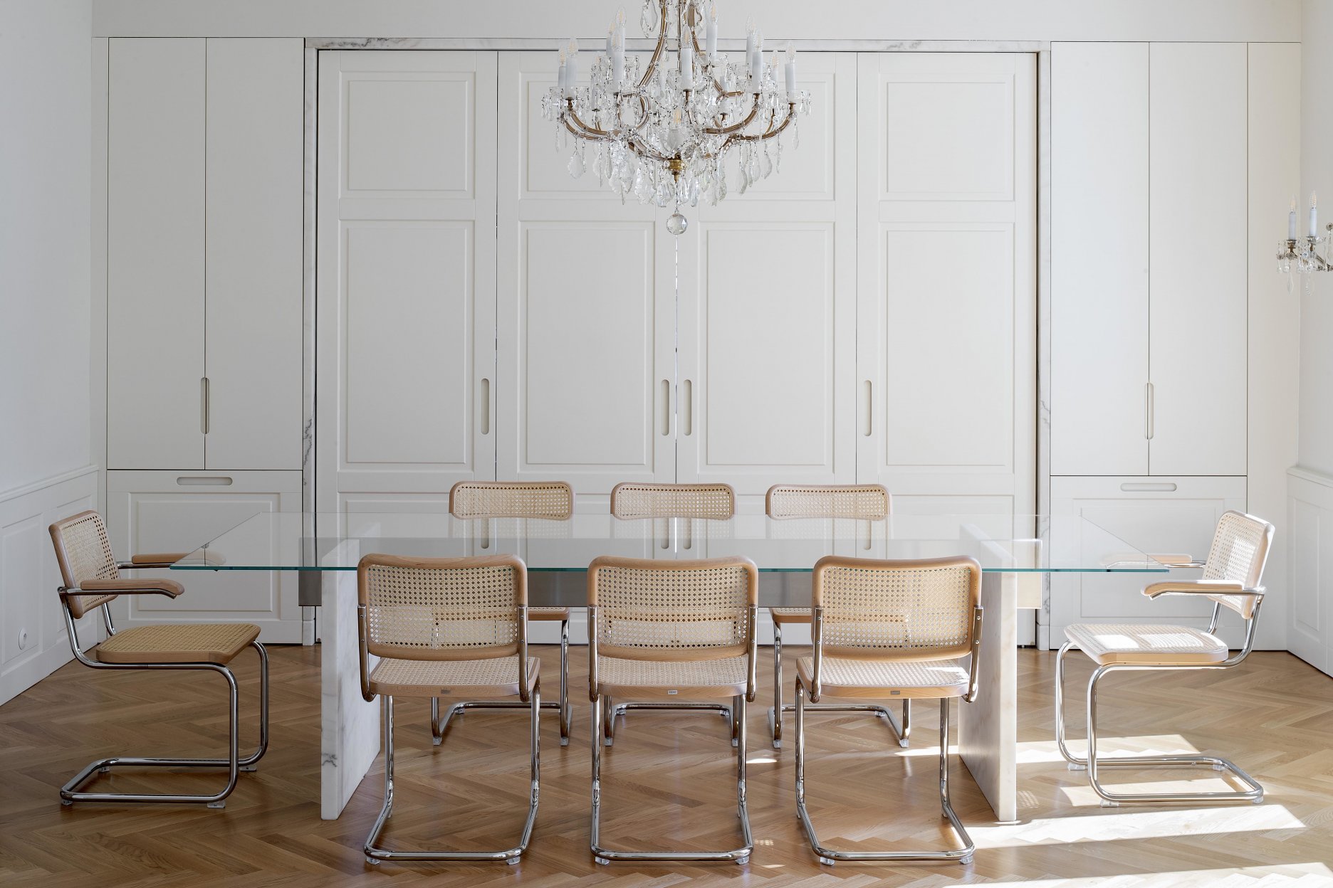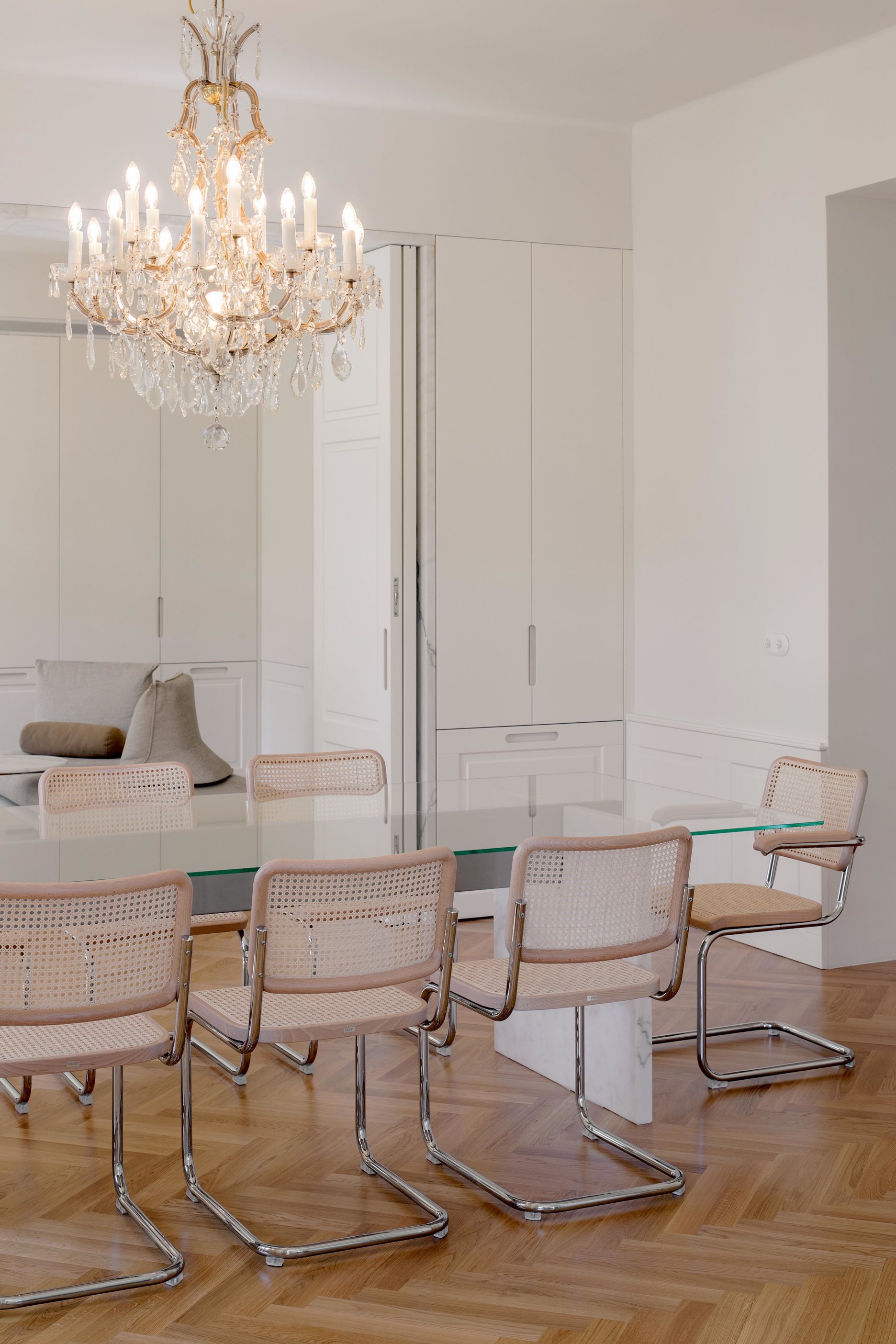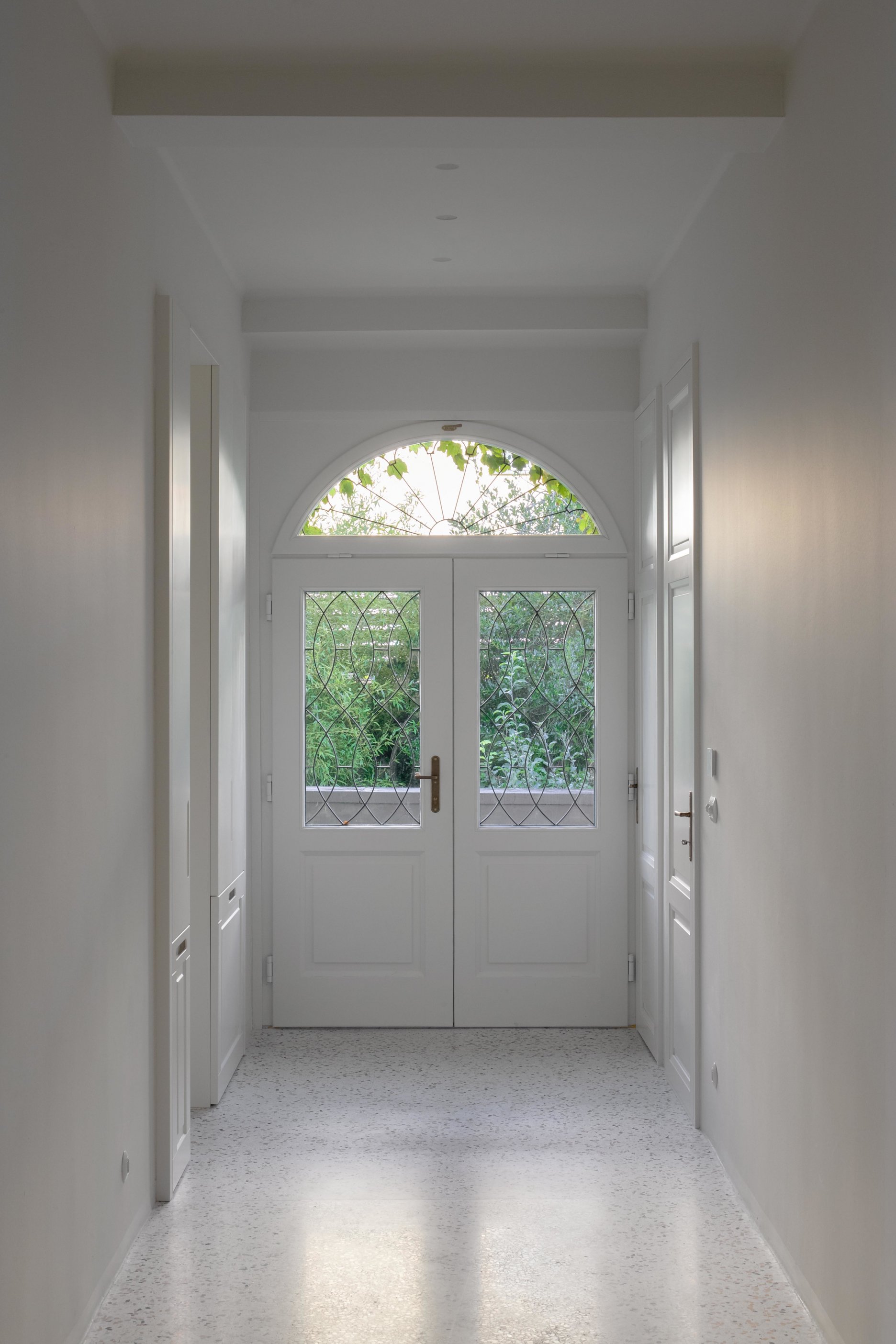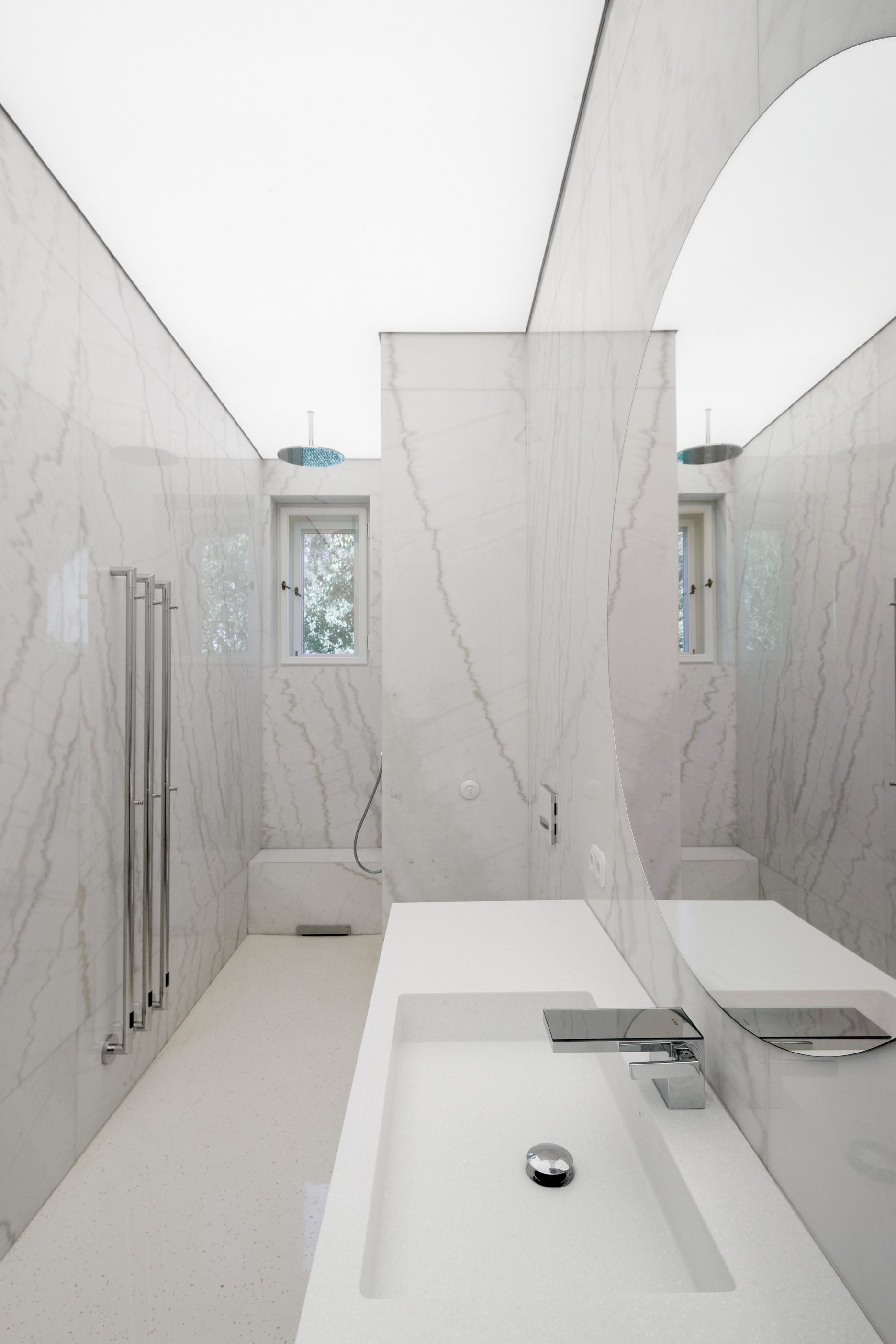 Všetky prvky boli citlivo navrhované s dôrazom na materialitu, funkčnosť a detail. Dôraz na materiálovú celistvosť návrhu možno ukázať na použití kryštalického mramoru Crystal White v rôznych prevedeniach naprieč celým interiérom - v kúpeľni ako veľkoformátové leštené platne, v kartáčovanej podobe je použitý na zárubniach enfilády, jeho drť sa nachádza v terrazzovej podlahe a tvorí aj dosky a nohy drobného nábytku.