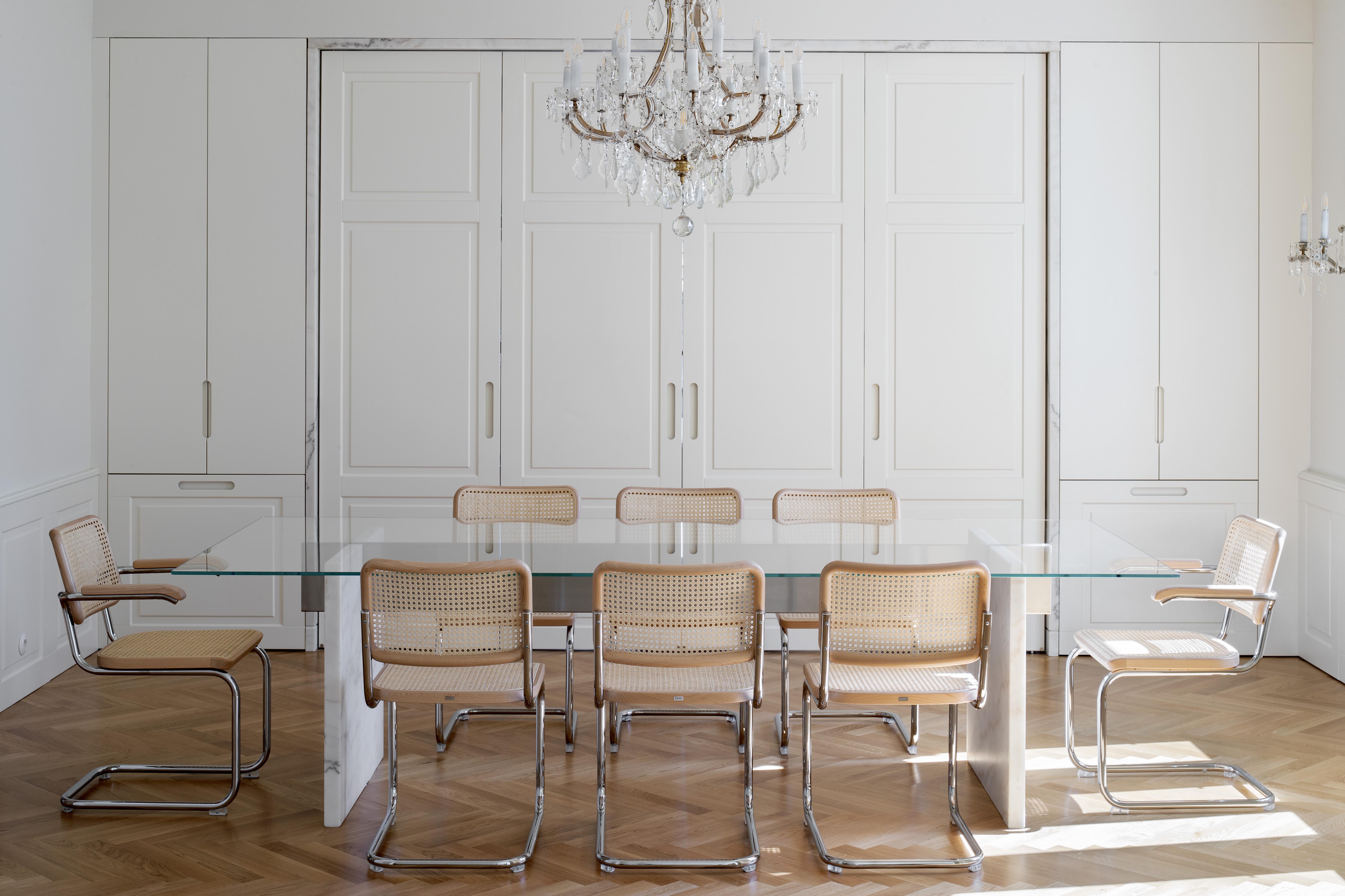 Pre zavesenie zárubne z kefovaného mramoru s hrúbkou 4 cm boli do priestoru vložené dva oceľové nosníky, ktoré nesú váhu celej zárubne. Mramor použitý na vytvorenie jednej zárubne váži približne 600 kg. Zárubňa je preto uložená nezávisle na nábytok. Do zárubne sú z vnútornej strany vložené veľké štvorkrídlové dvere, a z vonkajšej strany nábytkové skrine určené pre ukladanie porcelánu. Na statickom riešení celého projektu spolupracoval doc. Ing. Jaroslav Sandanus PhD.
