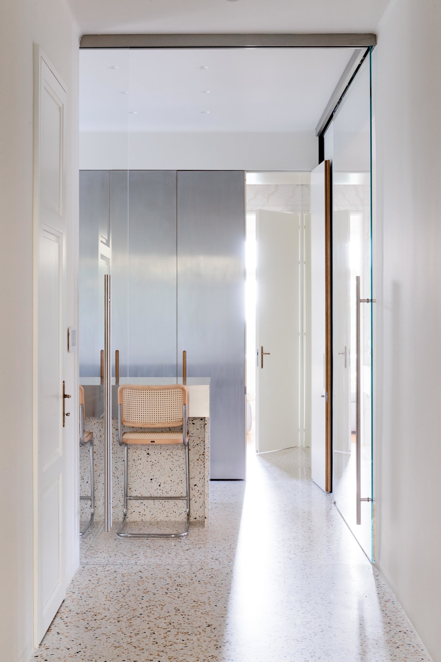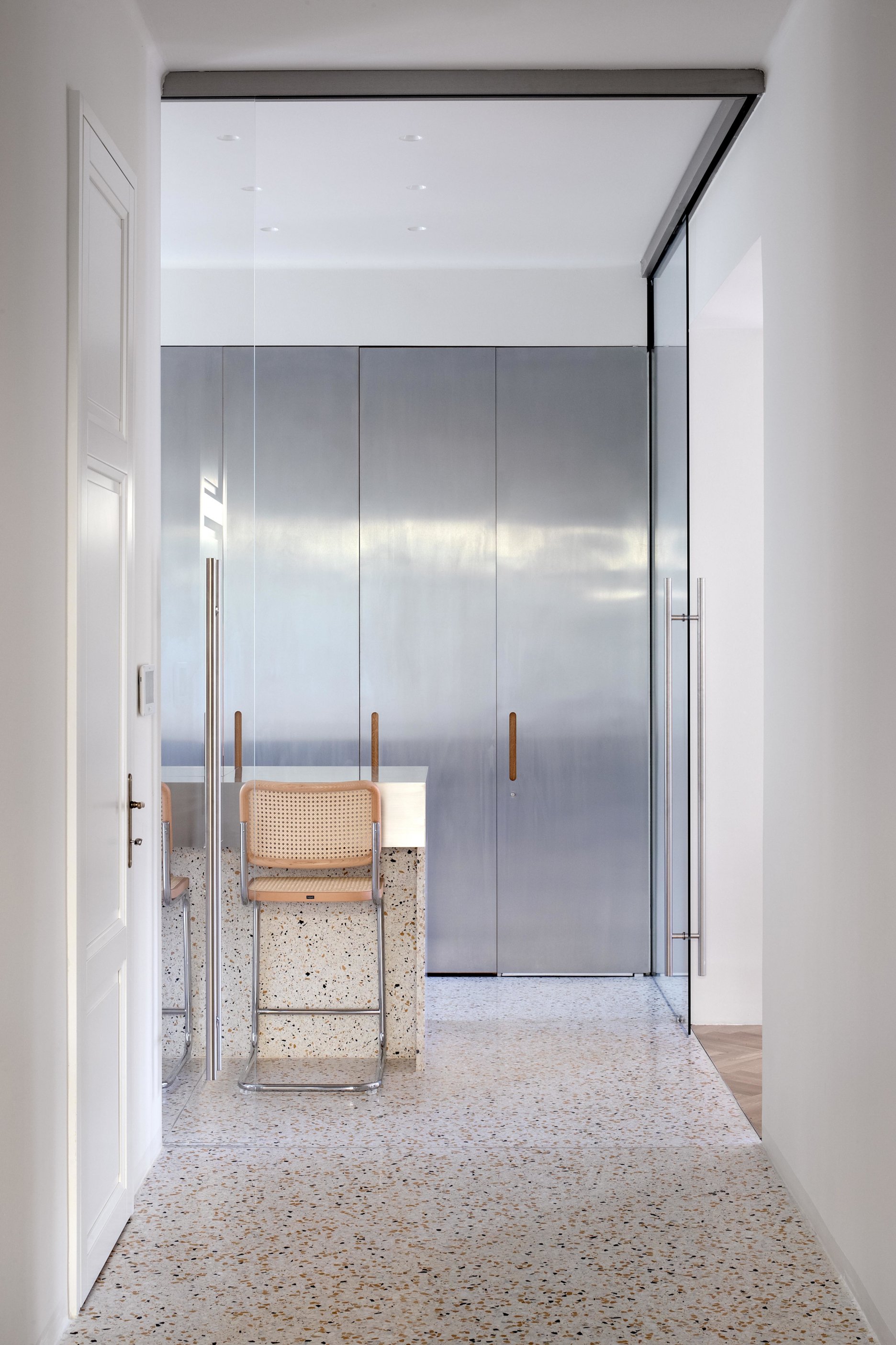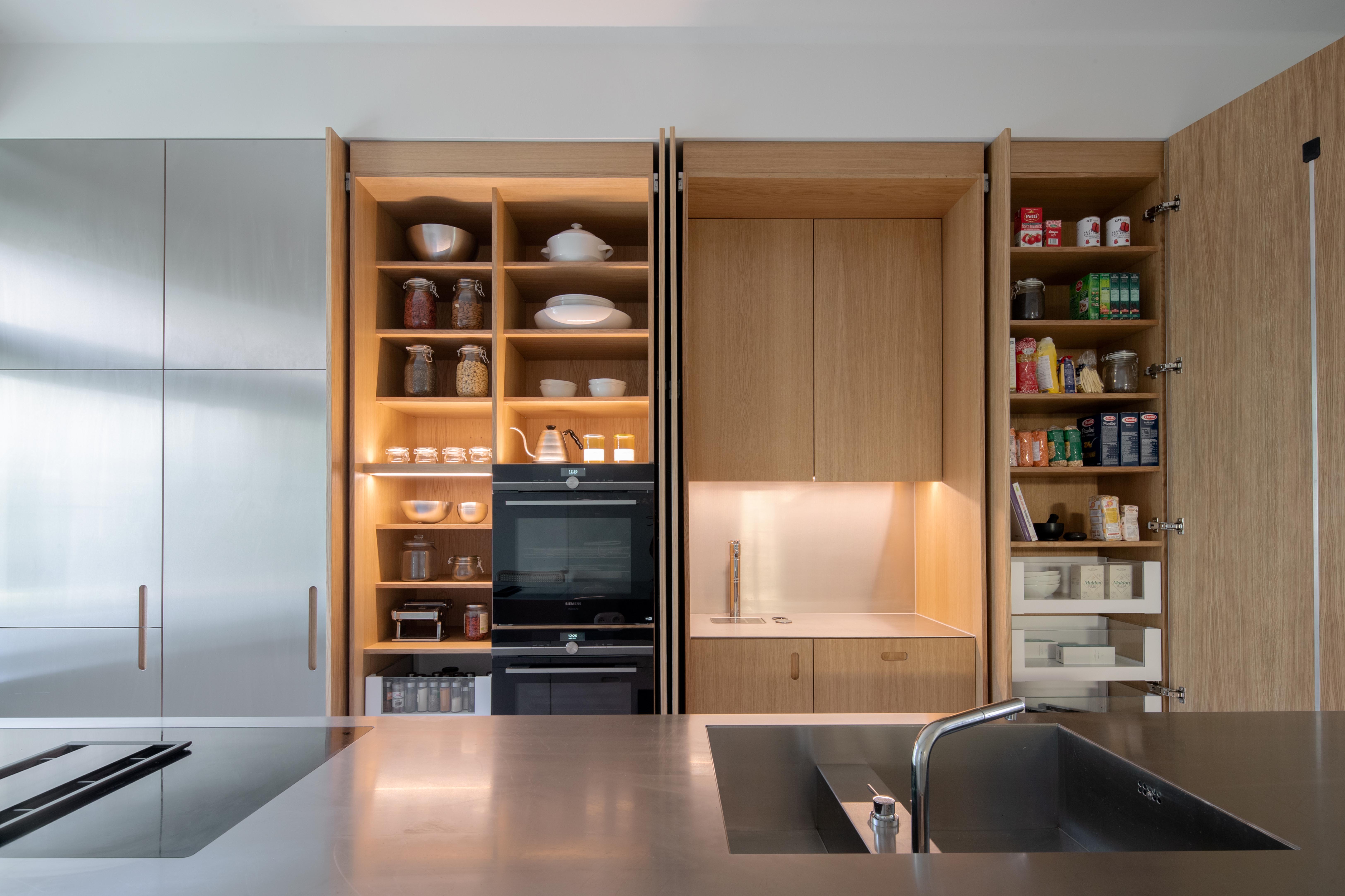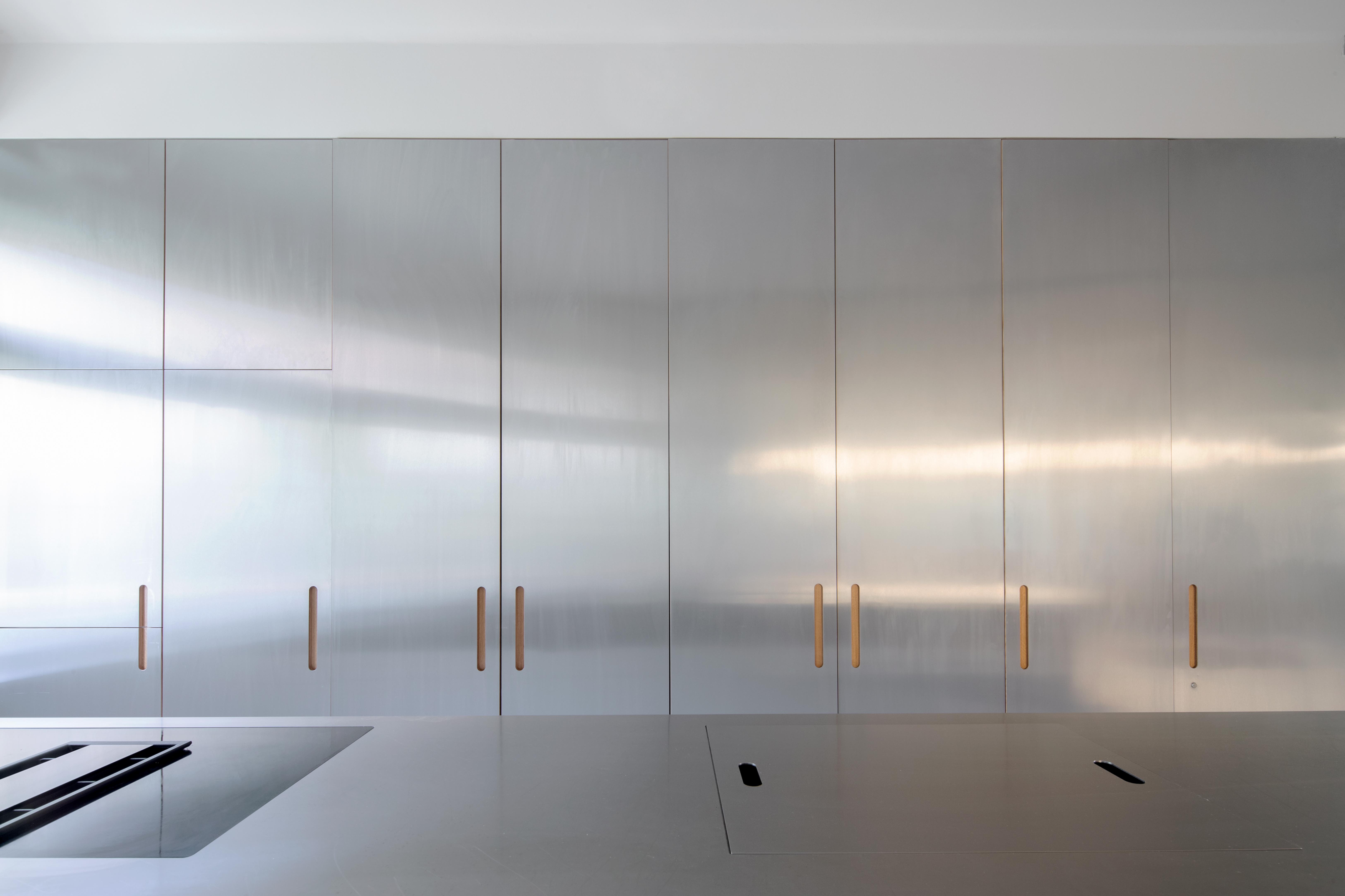 Kuchyňa je priamo prístupná zo vstupnej haly s možnosťou uzavretia pomocou dvoch veľkých, sklenených, posuvných dverí. V tom prípade pôsobí kuchyňa ako laboratórium na varenie, ergonomicky usporiadané okolo jedného nerezového, kuchynského ostrova so všetkým príslušenstvom na dosah.