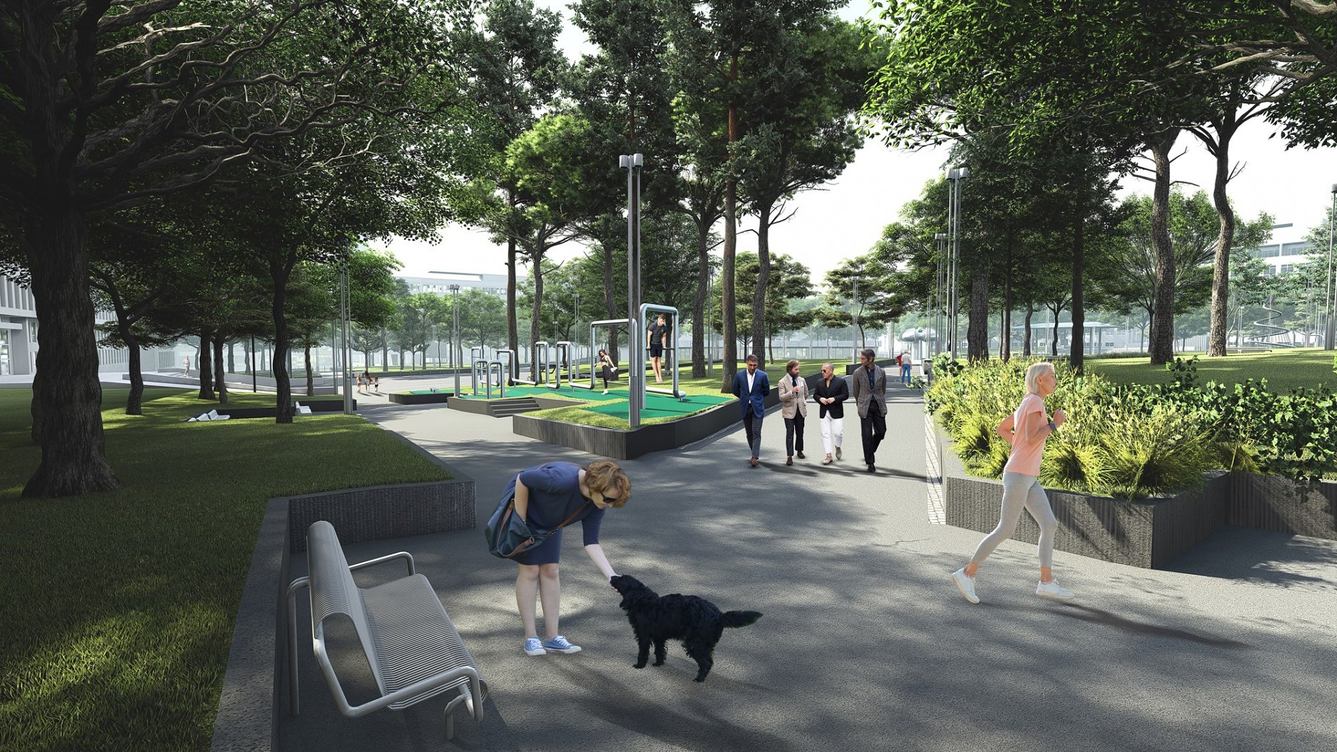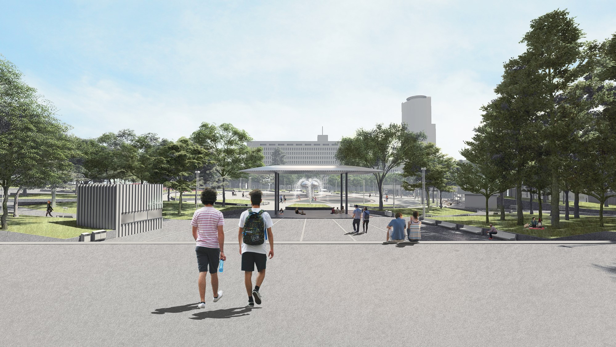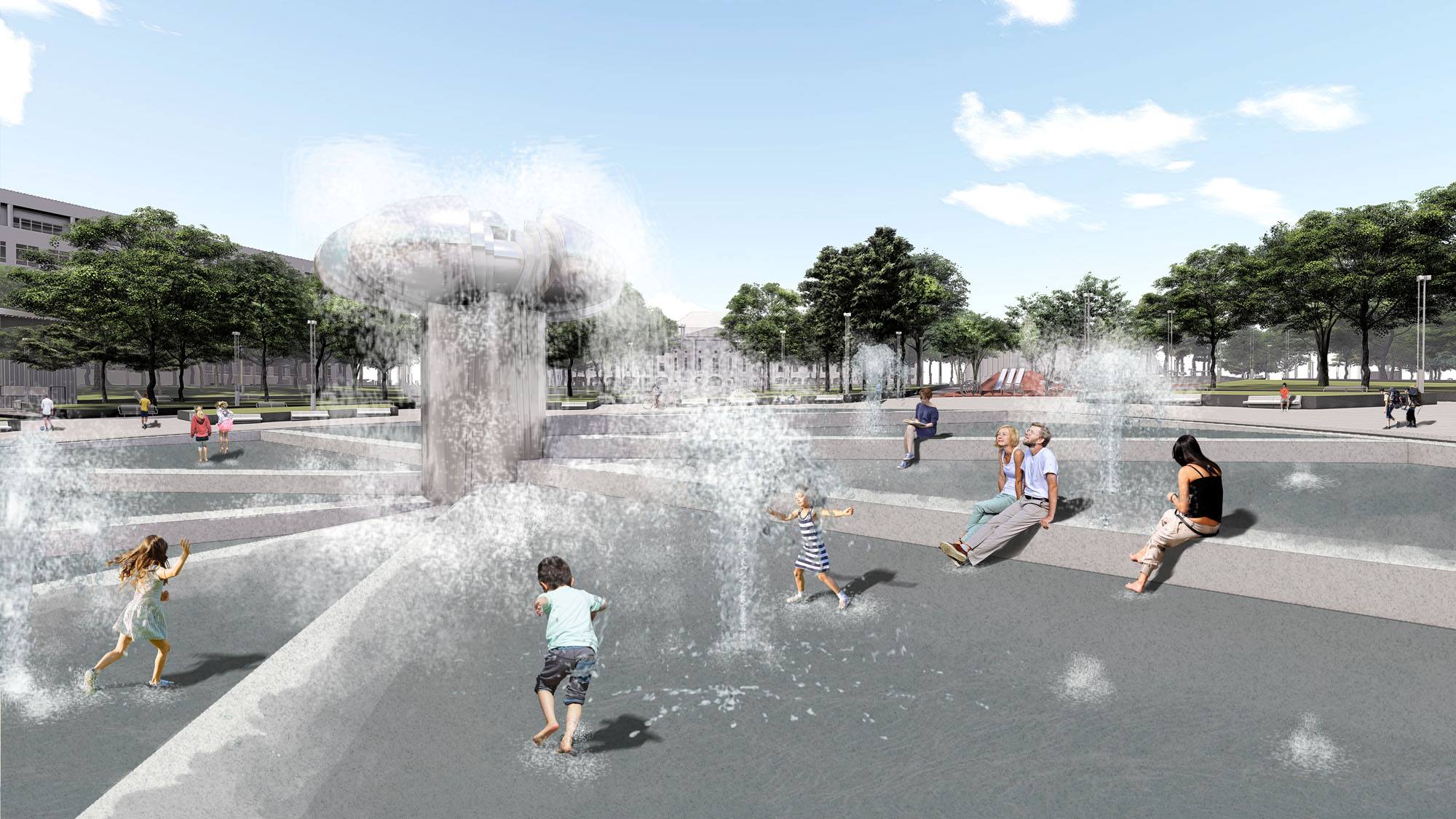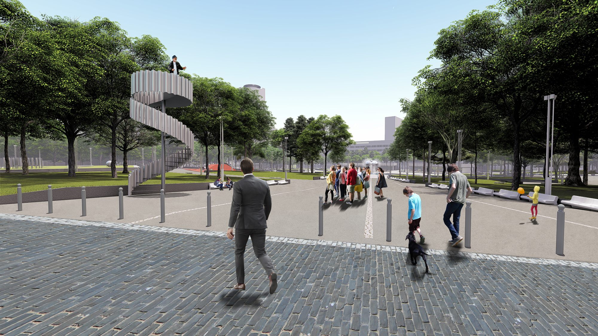 Zobytnenie námestia je samozrejmý základ. Okrem jedinečnosti z hľadiska fyzických rozmerov a väzieb sa očakáva aj nejaká ideová nadstavba. Určitá romantická vrstva, odkaz na históriu na nejaké hodnoty. Kompozícia sústredných kruhov je doplnená o ďalší - kruh vzrastlých stromov v okolí fontány. Pred hlavnou osou úradu vlády je ponechaný priestor pre verejné zhromaždenia a umiestnenie umeleckého diela, symbolu slobody. Po celej ploche námestia rozmietnené objekty, nazývame ich folies, ktoré poskytujú zázemie pre rôzne aktivity. Zároveň tvoria orientačné body, programovo rámcujú okolitý priestor.