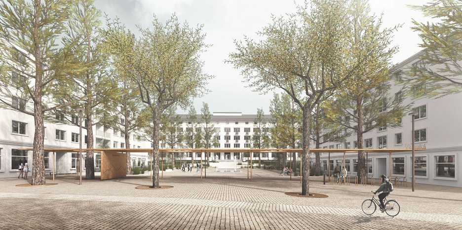 - Návrh posilňuje pomer zelene oproti existujúcemu stavu, čím vytvára komornejší priestor námestia a viac ho orientuje na dominantný objekt s OcÚ.