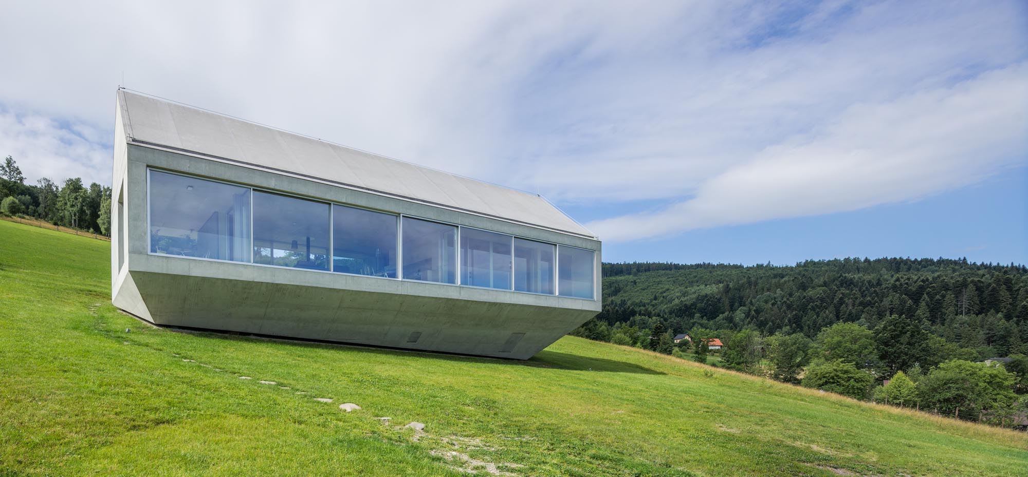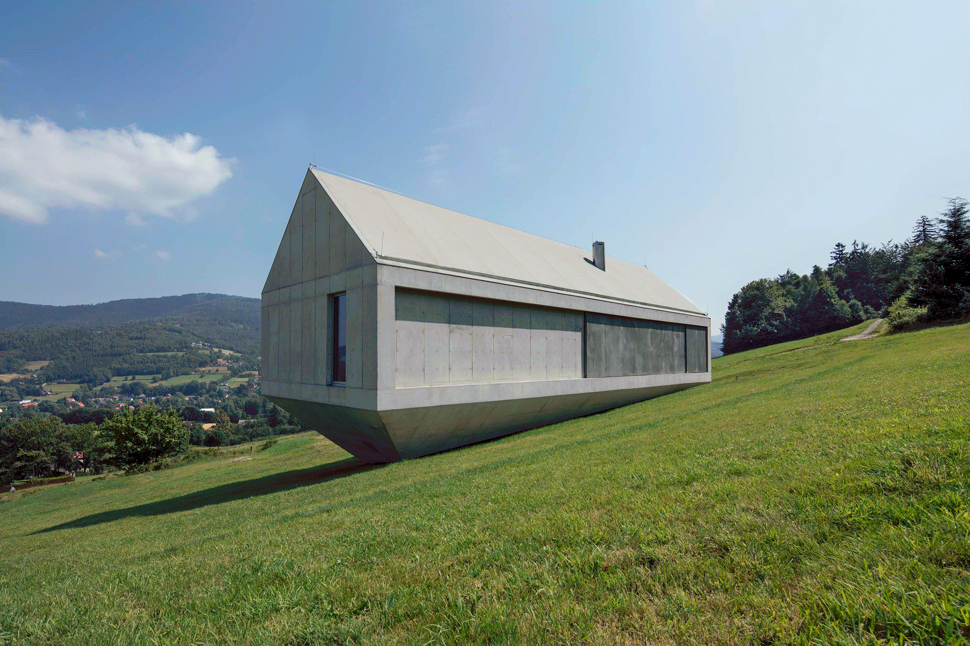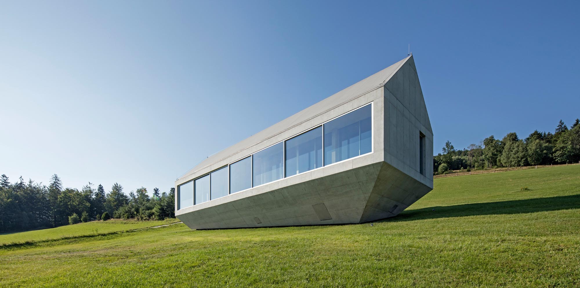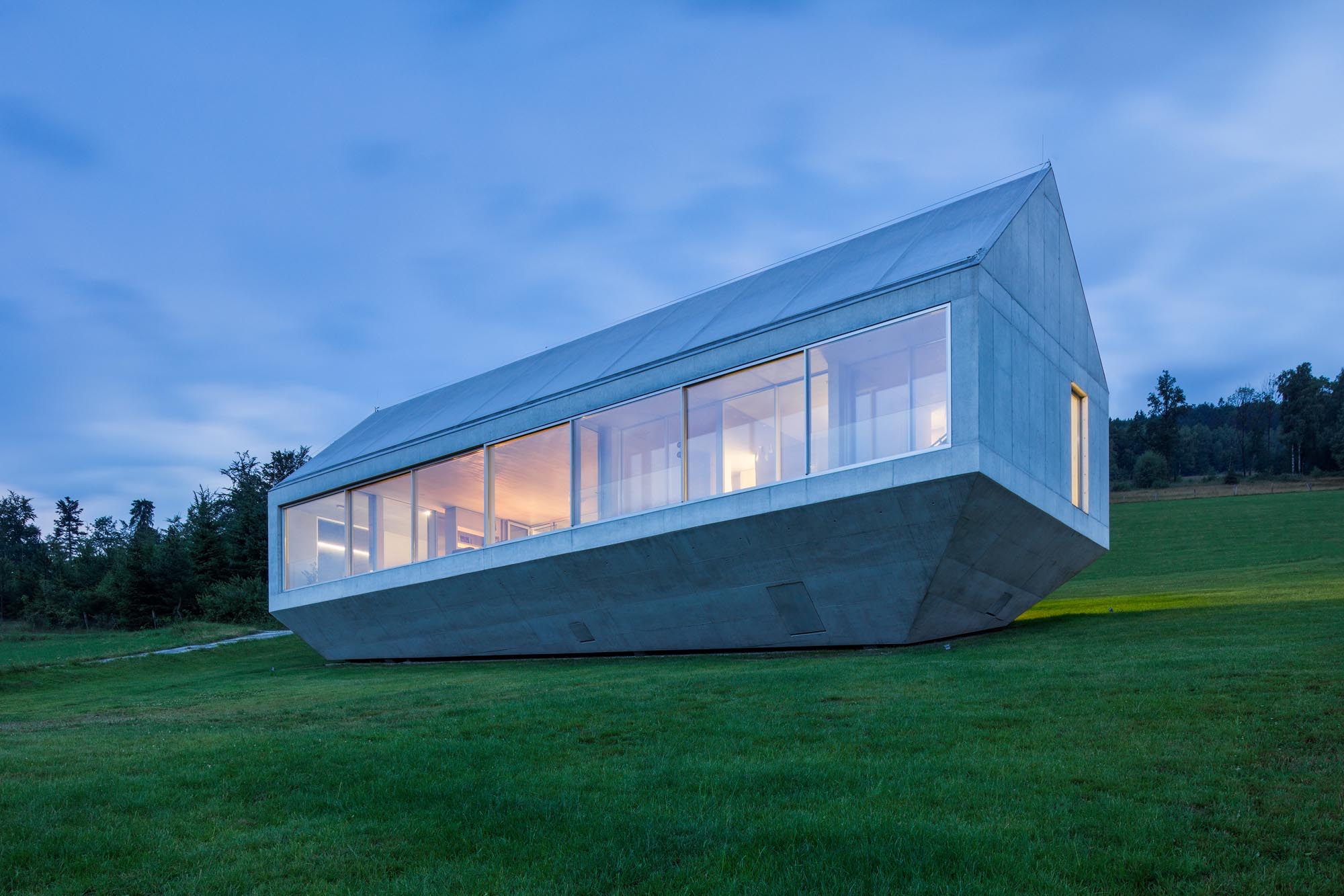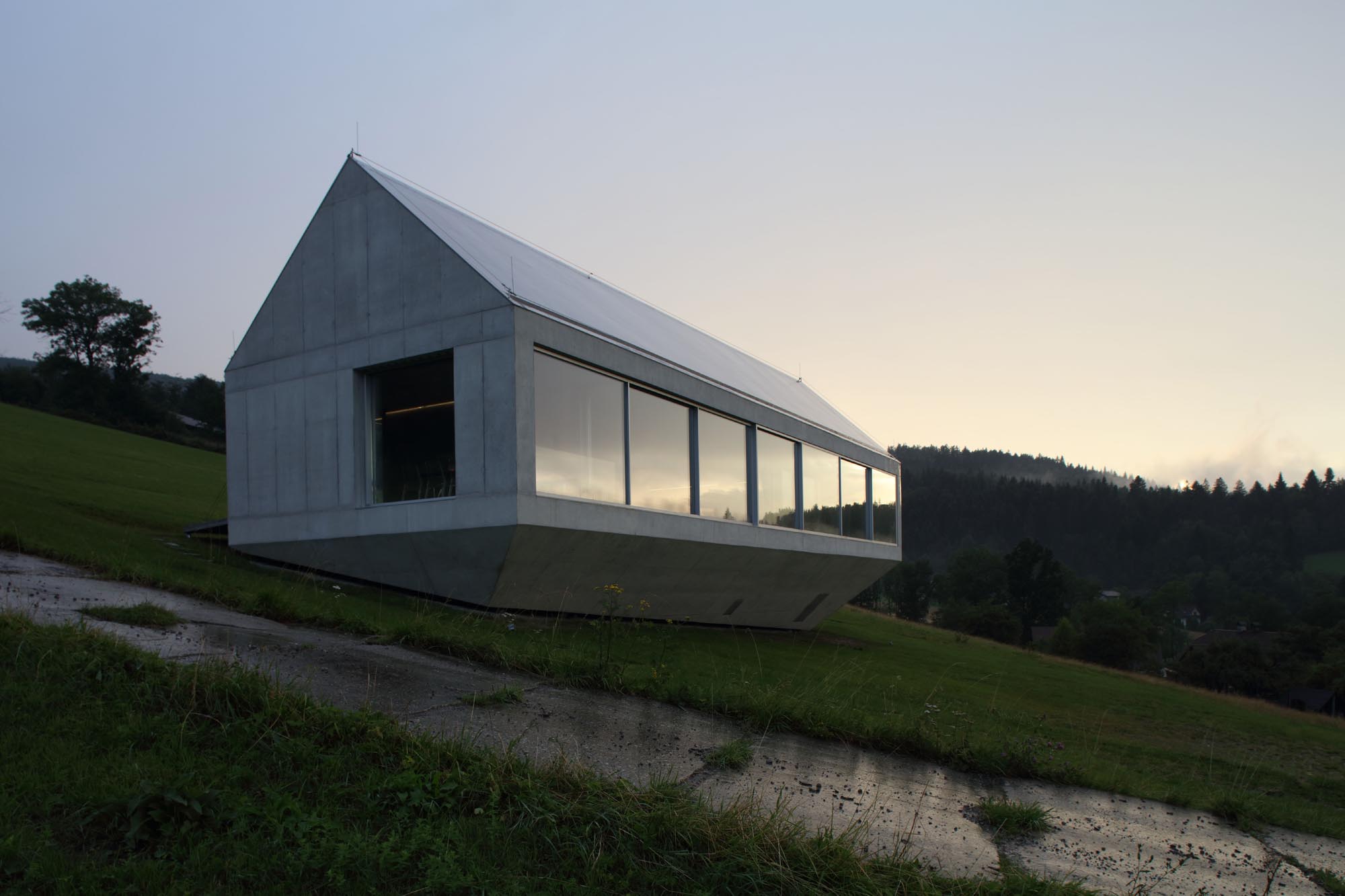Hornatá krajina rovnako ako aj miestna stavebná regulácia si vynútili sedlovú strechu. Dom si za vzor vzal archetyp stodoly stojacej na troch tenkých stenách. Jednoliata hmota vznikla zrkadlením šikmých rovín strechy pod podlahu obytnej časti. Dom vďaka svojmu tvaru začal pripomínať archu plávajúcu nad terénom. Architekti v snahe nenarušiť tento dojem minimálne zasahovali do okolitej prírodnej scenérie. Oplotením sa stal dočasný elektrický oplotok pre kone a prístupovým chodníkom pár plochých kameňov. Stavba mala od začiatku obmedzený rozpočet, z čoho vyplýva jej racionálna konštrukcia. Aj z tohto dôvodu sa architekti rozhodli izolovať ju zvnútra. Pohľadový betón sa z vonkajšej strany stal konečnou povrchovou úpravou. Ako optimálna tepelná izolácia sa ukázala striekaná izolačná pena, ktorá slúži tiež ako parozábrana.