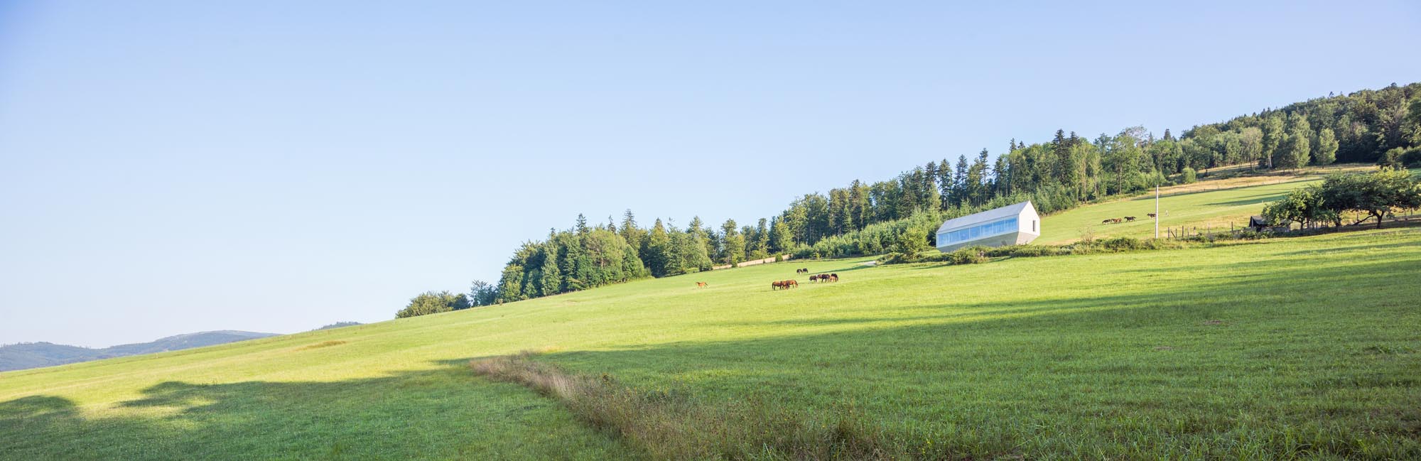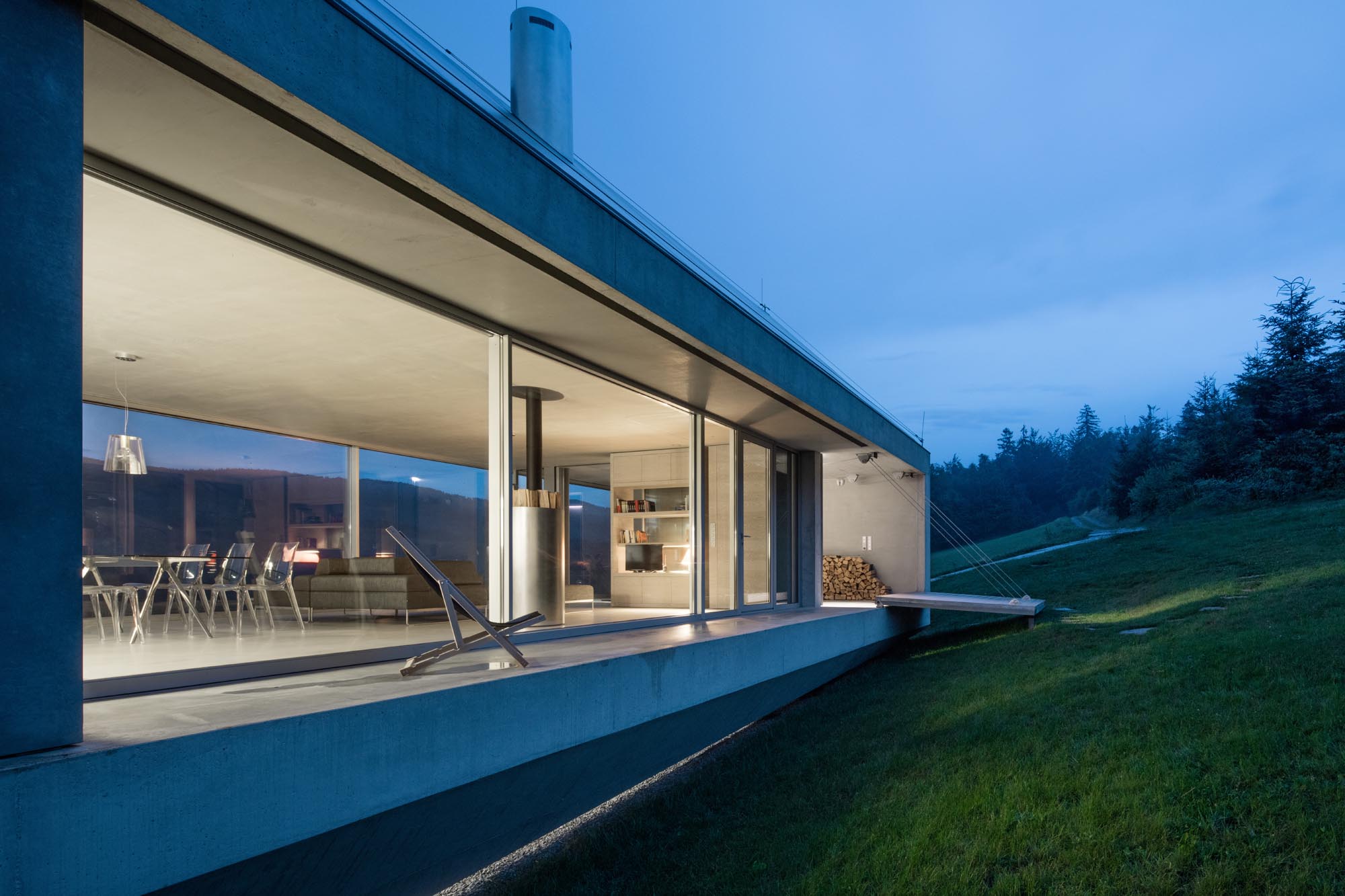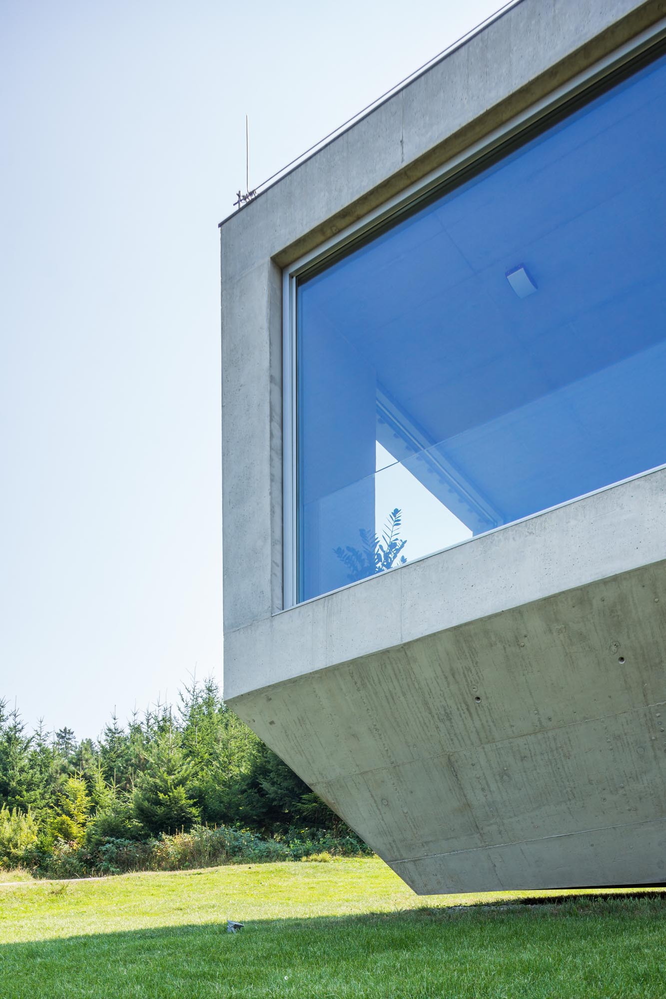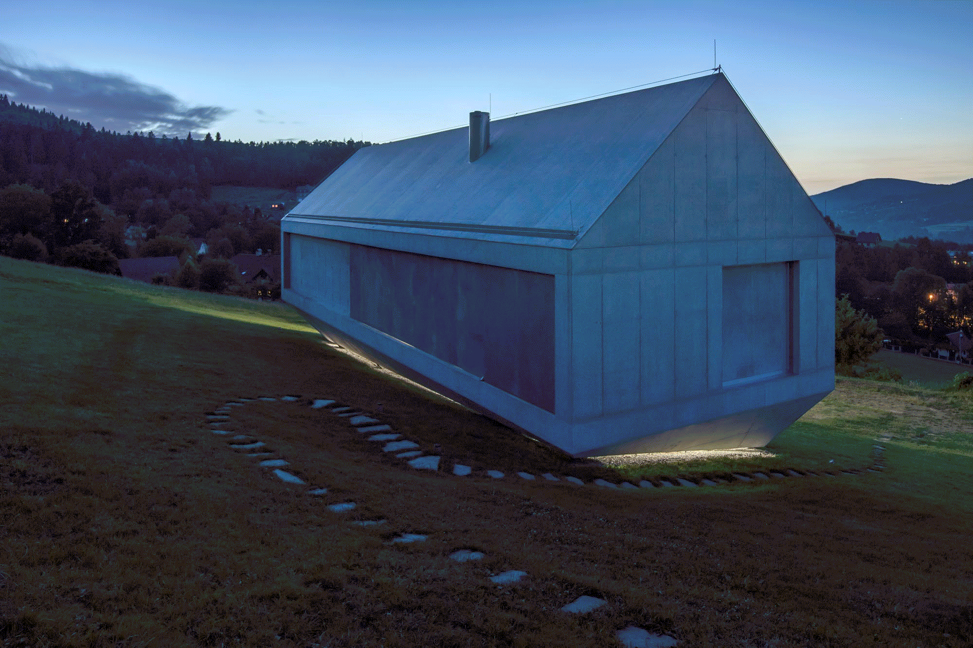 Hornatá krajina rovnako ako aj miestna stavebná regulácia si vynútili sedlovú strechu. Dom si za vzor vzal archetyp stodoly stojacej na troch tenkých stenách. Jednoliata hmota vznikla zrkadlením šikmých rovín strechy pod podlahu obytnej časti. Dom vďaka svojmu tvaru začal pripomínať archu plávajúcu nad terénom. Architekti v snahe nenarušiť tento dojem minimálne zasahovali do okolitej prírodnej scenérie. Oplotením sa stal dočasný elektrický oplotok pre kone a prístupovým chodníkom pár plochých kameňov. Stavba mala od začiatku obmedzený rozpočet, z čoho vyplýva jej racionálna konštrukcia. Aj z tohto dôvodu sa architekti rozhodli izolovať ju zvnútra. Pohľadový betón sa z vonkajšej strany stal konečnou povrchovou úpravou. Ako optimálna tepelná izolácia sa ukázala striekaná izolačná pena, ktorá slúži tiež ako parozábrana.