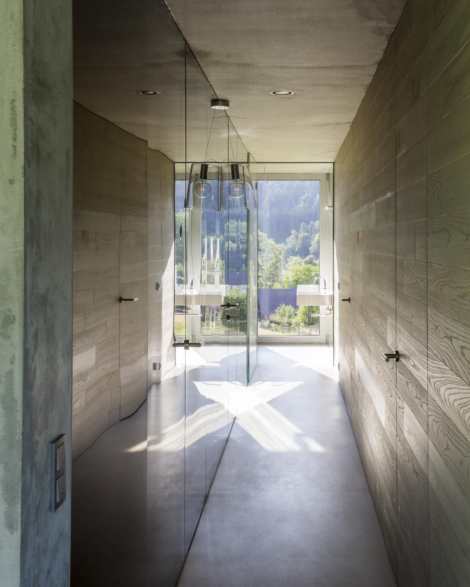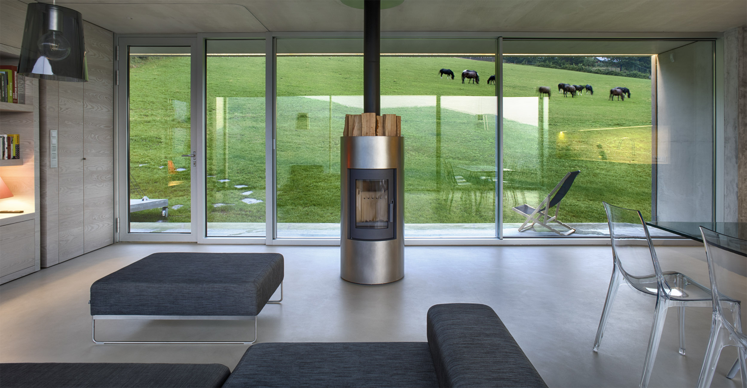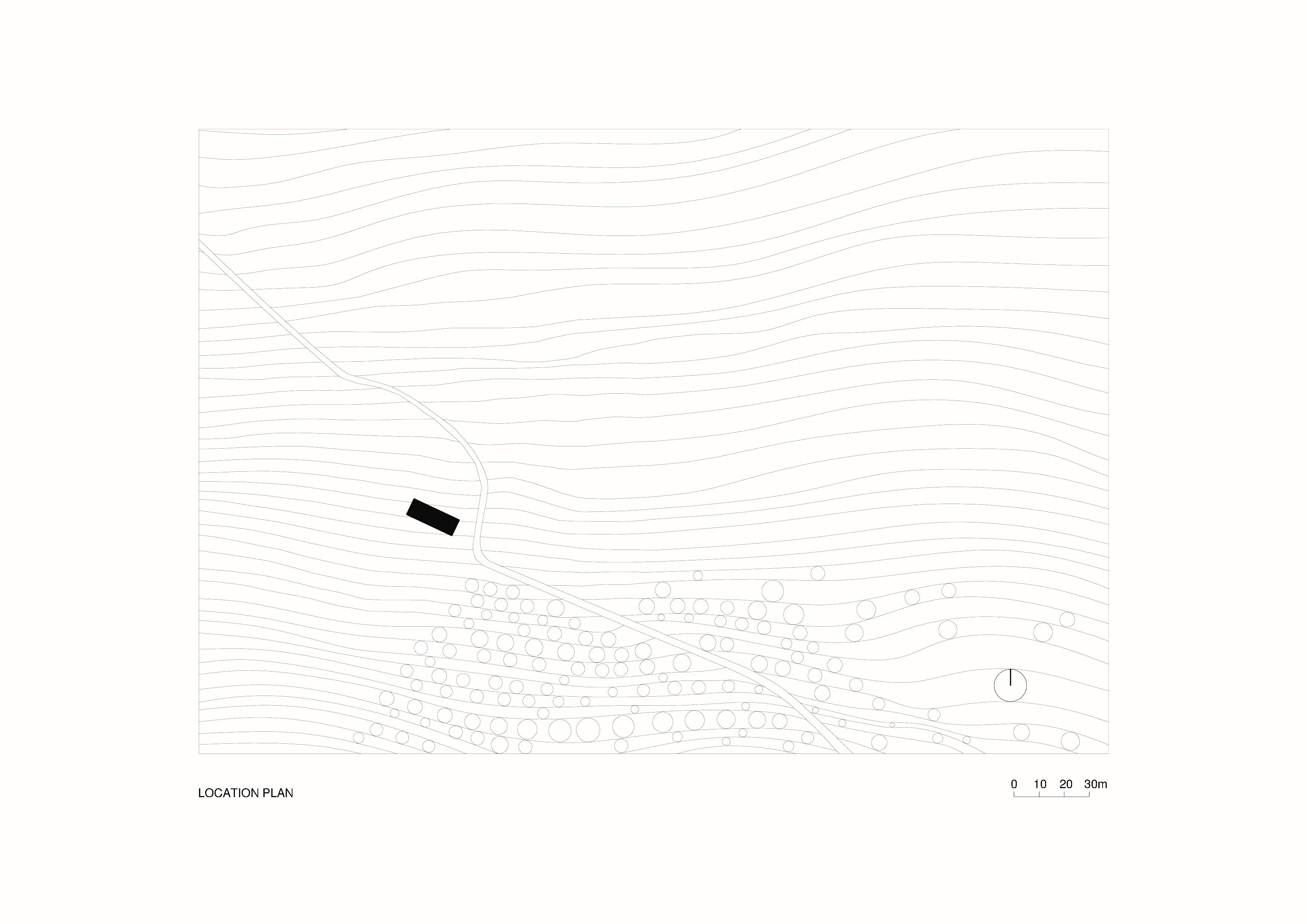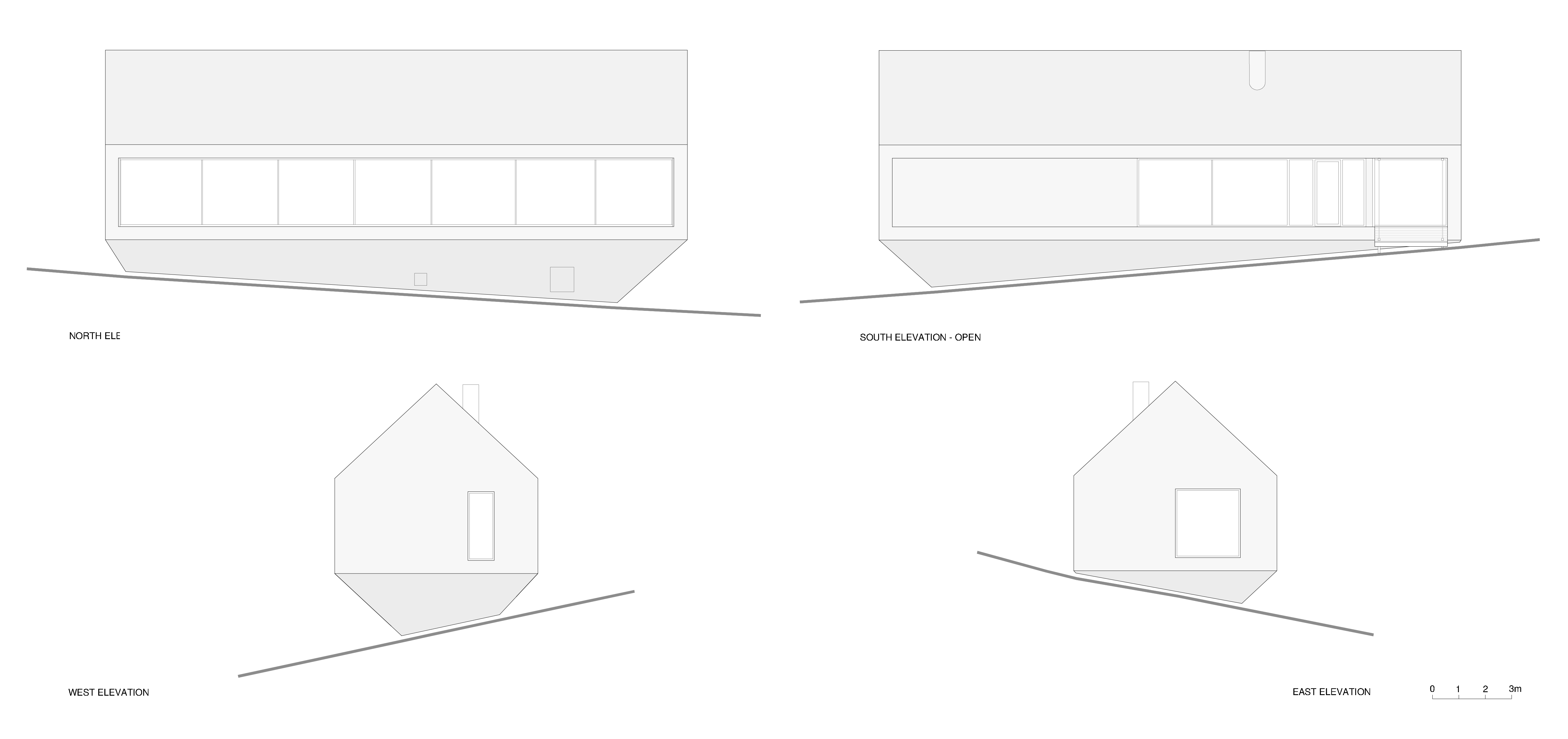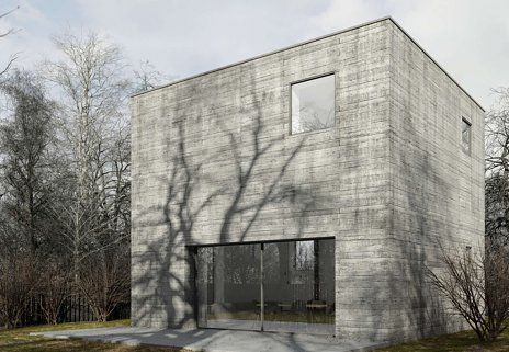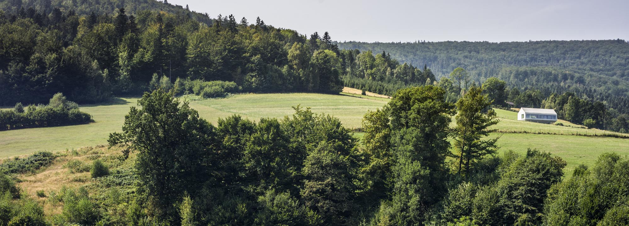 Hornatá krajina rovnako ako aj miestna stavebná regulácia si vynútili sedlovú strechu. Dom si za vzor vzal archetyp stodoly stojacej na troch tenkých stenách. Jednoliata hmota vznikla zrkadlením šikmých rovín strechy pod podlahu obytnej časti. Dom vďaka svojmu tvaru začal pripomínať archu plávajúcu nad terénom. Architekti v snahe nenarušiť tento dojem minimálne zasahovali do okolitej prírodnej scenérie. Oplotením sa stal dočasný elektrický oplotok pre kone a prístupovým chodníkom pár plochých kameňov. Stavba mala od začiatku obmedzený rozpočet, z čoho vyplýva jej racionálna konštrukcia. Aj z tohto dôvodu sa architekti rozhodli izolovať ju zvnútra. Pohľadový betón sa z vonkajšej strany stal konečnou povrchovou úpravou. Ako optimálna tepelná izolácia sa ukázala striekaná izolačná pena, ktorá slúži tiež ako parozábrana.