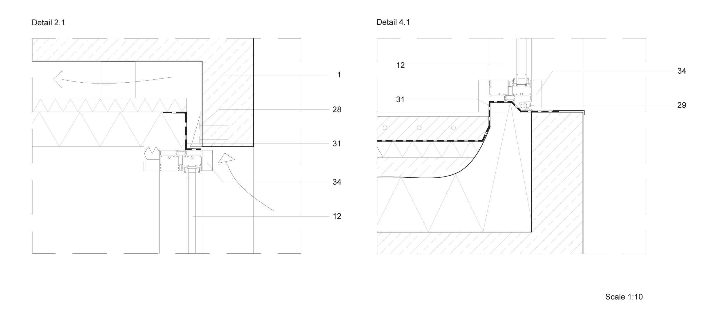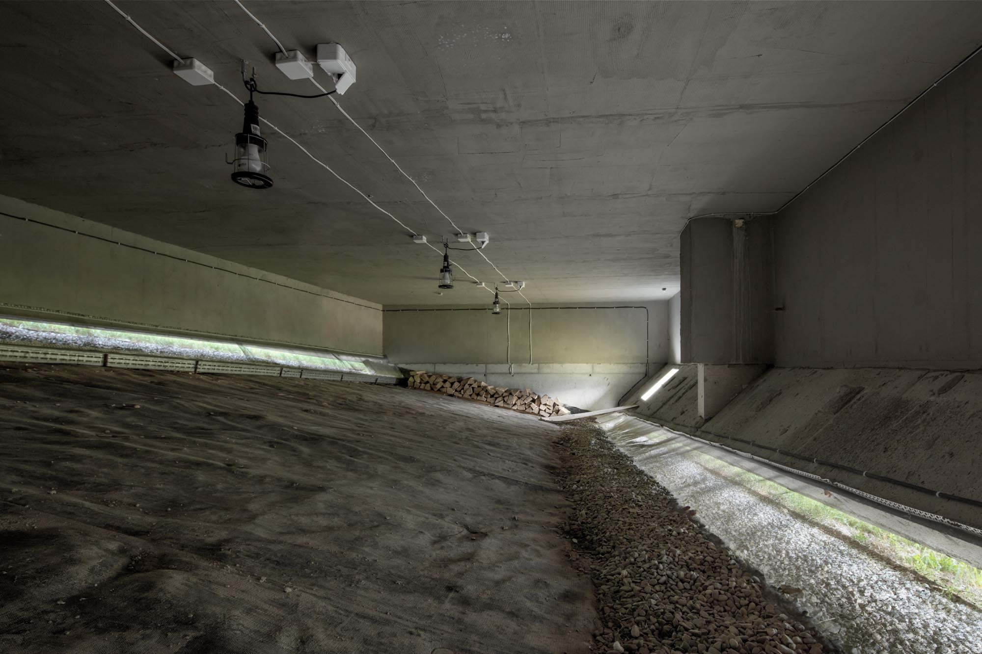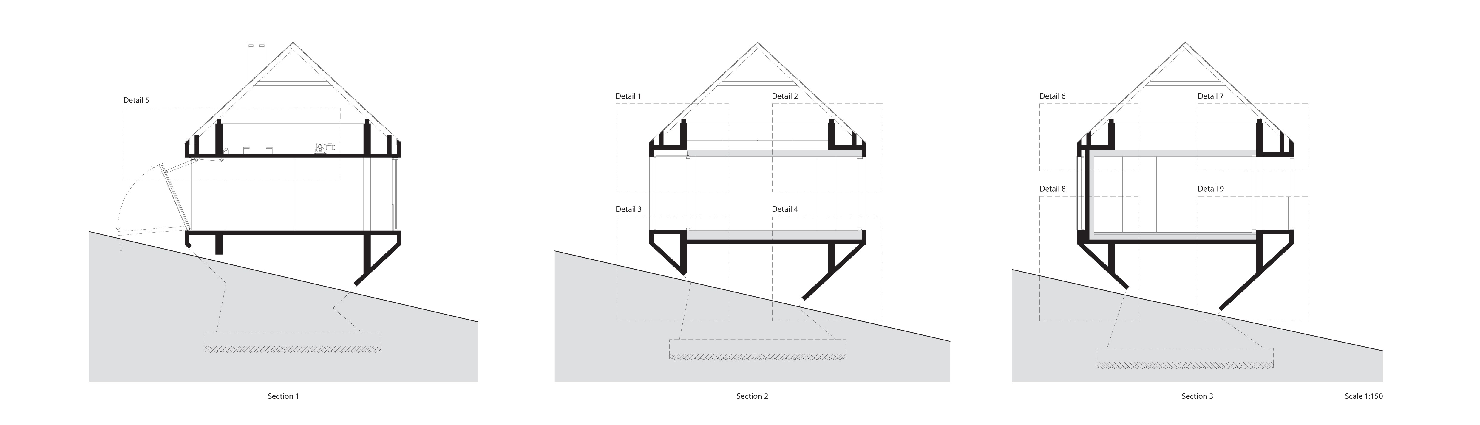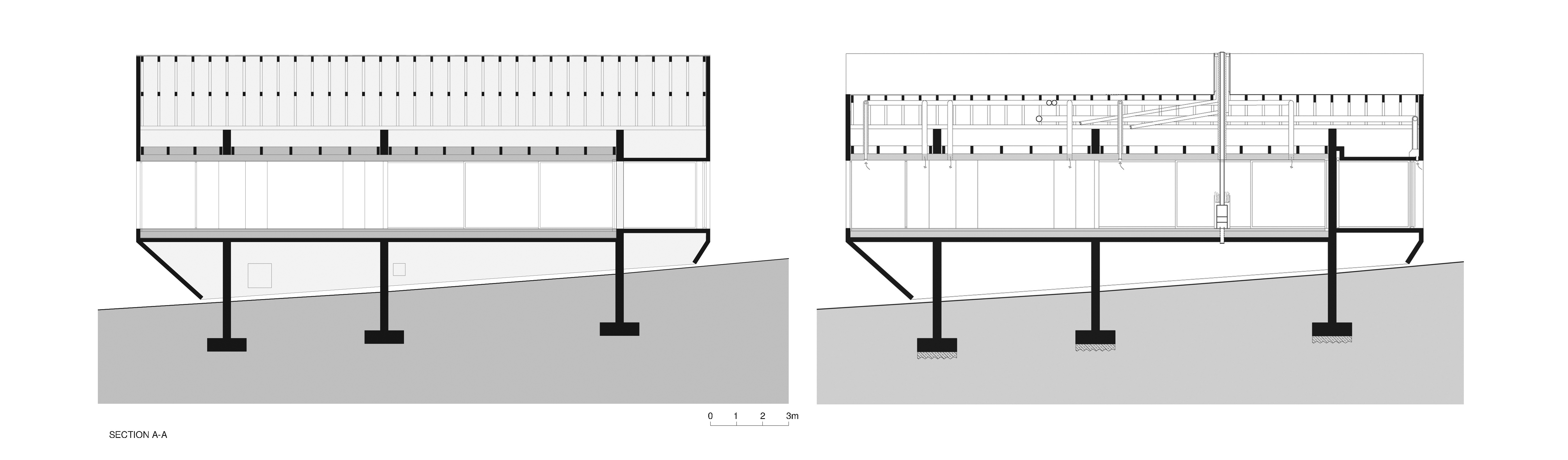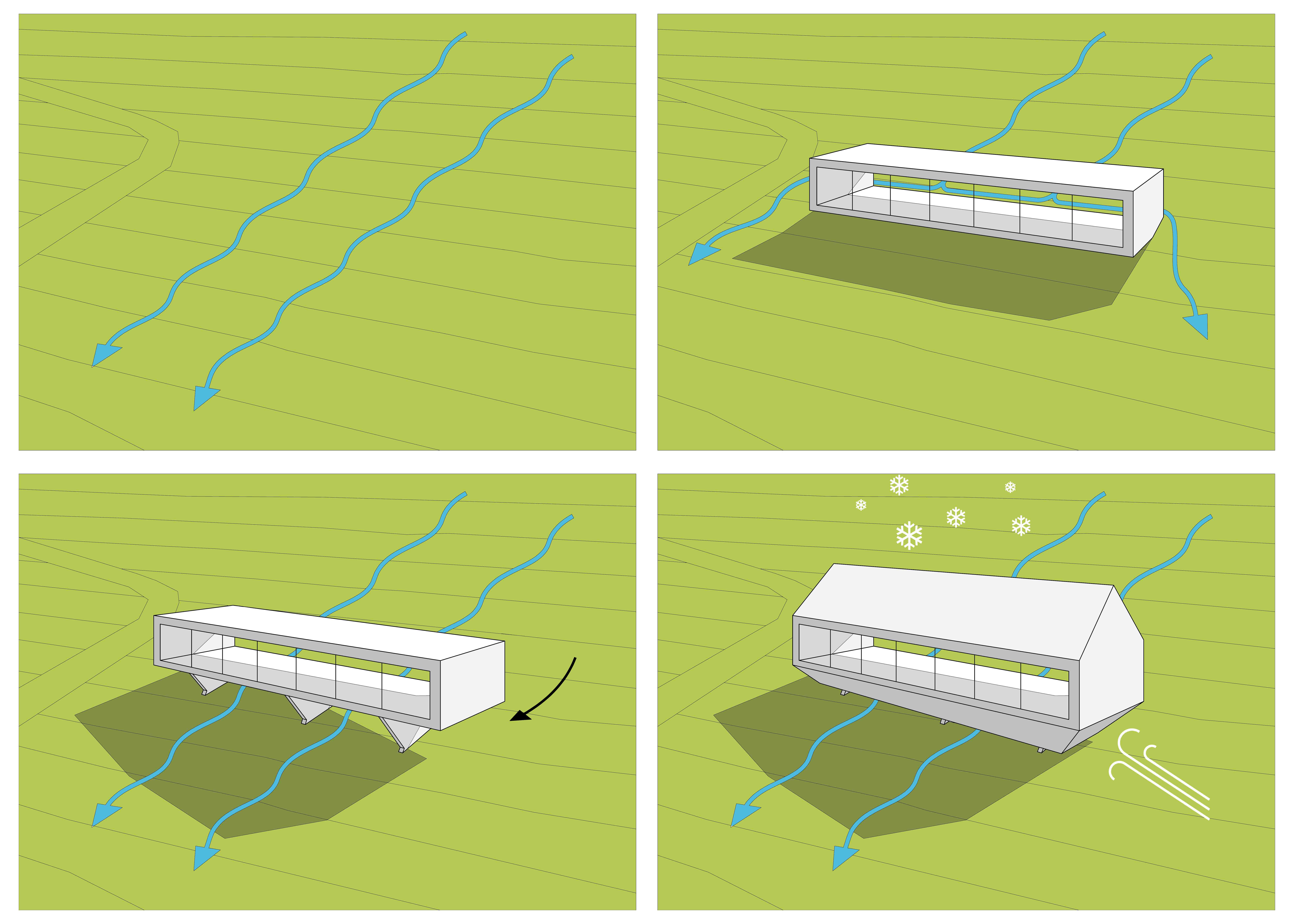 Umiestnenie domu na strmom svahu v sebe nieslo vysoké riziko zosuvu pôdy a nahromadeniu vody, ku ktorému dochádza kvôli výrubom čoraz častejšie. Aby sa zamedzilo pohybu podložia, umožňuje dom voľné stekanie nahromadenej vody popod obytný priestor.