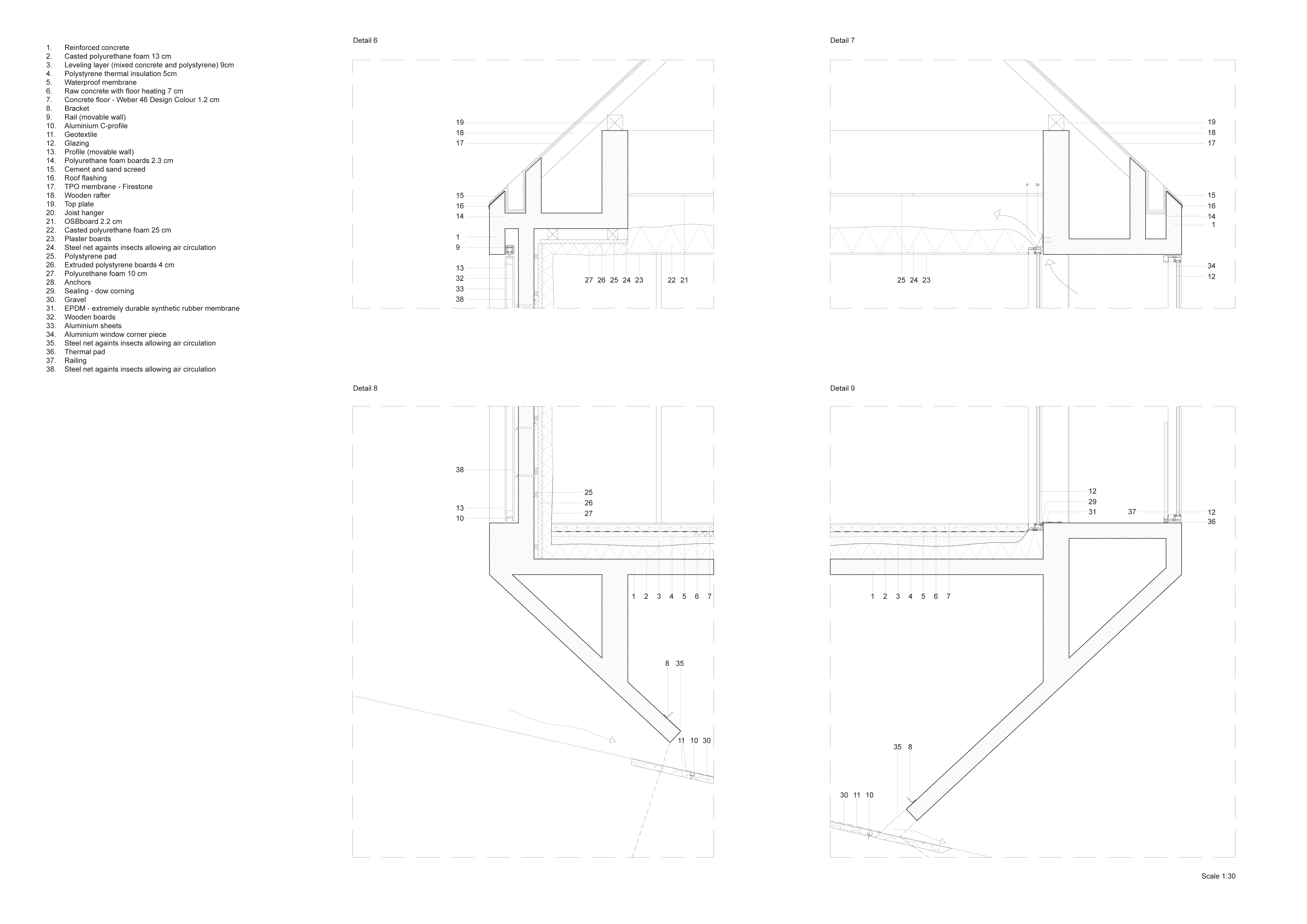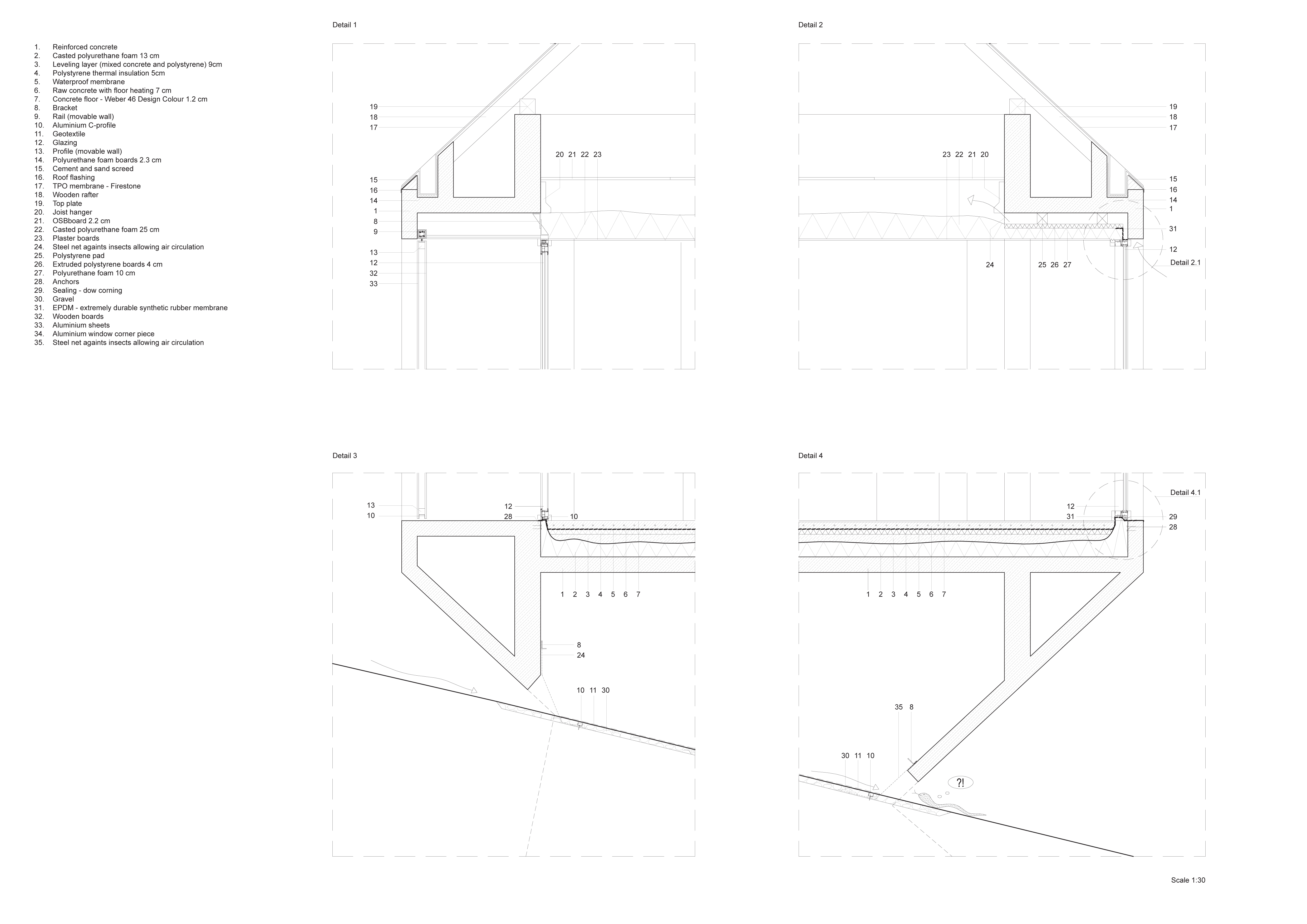 Pretože sa parcela nachádza v mimo intravilánu, do popredia sa dostala otázka bezpečnosti. Riešenie architekti našli v osadení stavby. Obytná časť tvaru kvádra sa zeme dotýka len jedeným rohom, zatiaľ čo zvyšok je postavený na skosenej podstave. Vďaka tomuto riešeniu je obytná časť zdvihnutá na bezpečnú úroveň. Veľké presklené plochy domu sú uzatvárateľné (podobné riešenie môžeme vidieť pri projektoch R. Konieczneho). Zaujímavým prvkom je aj "padací most", ktorý v sebe kombinuje funkciu schodov a okeníc.