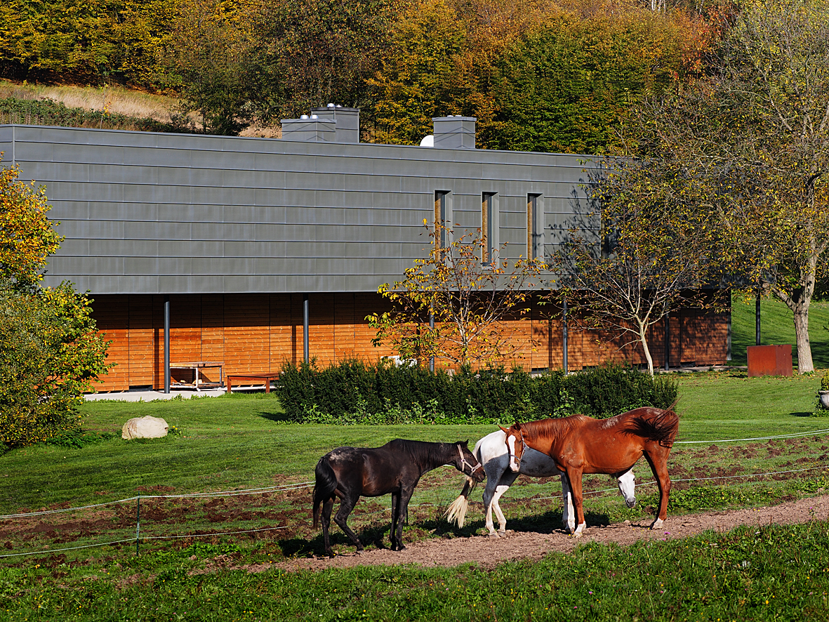 NŠ: Neviem si predstaviť že by architekt robil niečo a nemal stále prítomné svoje profesionálne povedomie. Keď robíš chliev, tiež sa ho v rámci možností snažíš urobiť dobre a rozmýšľaš nad tým že ako. Dosky z miestnej píly natreté starým olejom pozbíjané na mieste, ktoré chráni celý areál pred prevládajúcimi vetrami, závejmi, vytvárajúc kopírujúci svažitý terén. Rozpočet takmer nič, realizácia svojpomocou. Je dobre keď nemáš k dispozícii neobmedzene vysoký rozpočet, núti ťa to k striedmosti, ktorá sa dnes vytratila z nášho života.