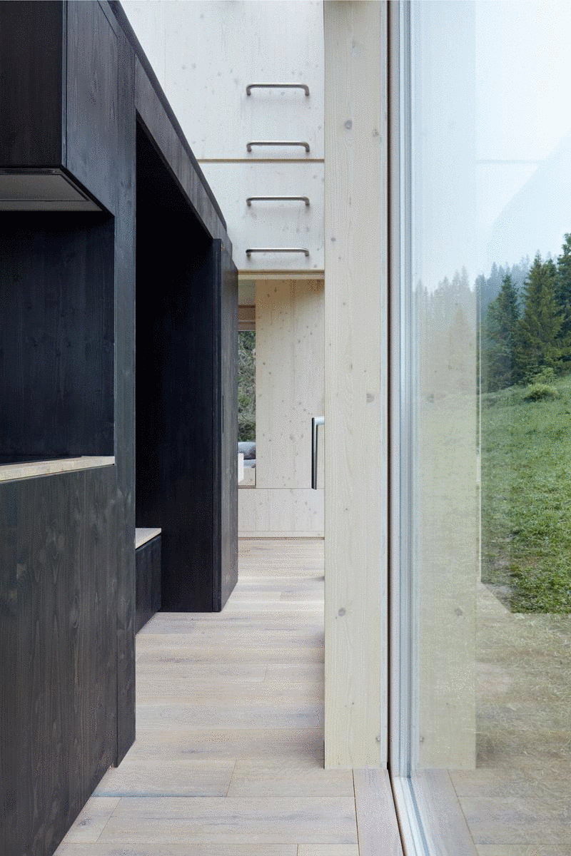 Otvory vo všetkých piatich fasádach, "rámujú" pohľady ako scénické hry prírody a premietajú ich do interiéru. Či už ide o otváravú stenu, ktorá fyzicky vpúšťa prírodu do interiéru, predné vykonzolované zasklenie, či kúpeľnovú stenu s mliečnym sklom, na ktorej sa odohráva tieňohra dotýkajúcich sa konárov a meniacich sa siluét lesa. Azda najzaujímavejšie je horizontálne presklenie skyboxu, v ktorom máte pri zaspávaní pocit, že ste vonku pod holým nebom.