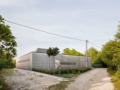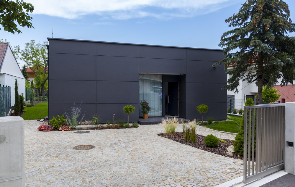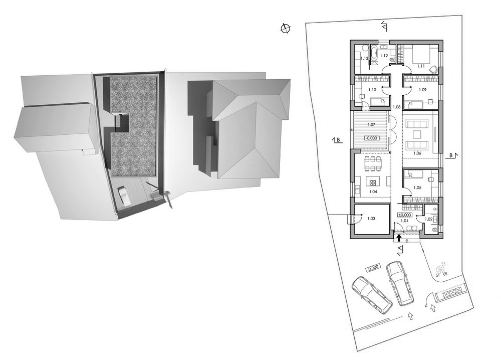 Dom sa nachádza v Bratislave, v starej časti mestskej štvrte Dúbravka. Úzka a dlhá parcela so severojužnou orientáciou a obaja susedia po stranách v bezprostrednej blízkosti. Zadanie znelo jasne – bungalov, 3 spálne, pracovňa, obytný priestor. Žiadna garáž, stačí odstavná plocha a sklad. Myšlienka átria sa stala logickým vyústením snahy o dosiahnutie základného intímneho exteriérového priestoru v inak stiesnenej situácii domu na parcele.
