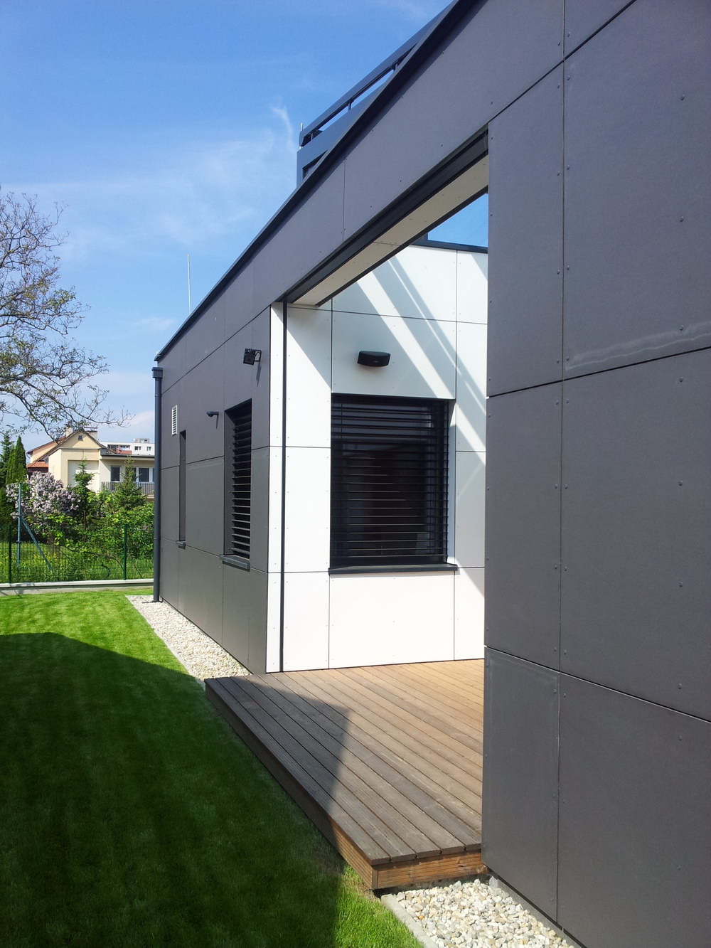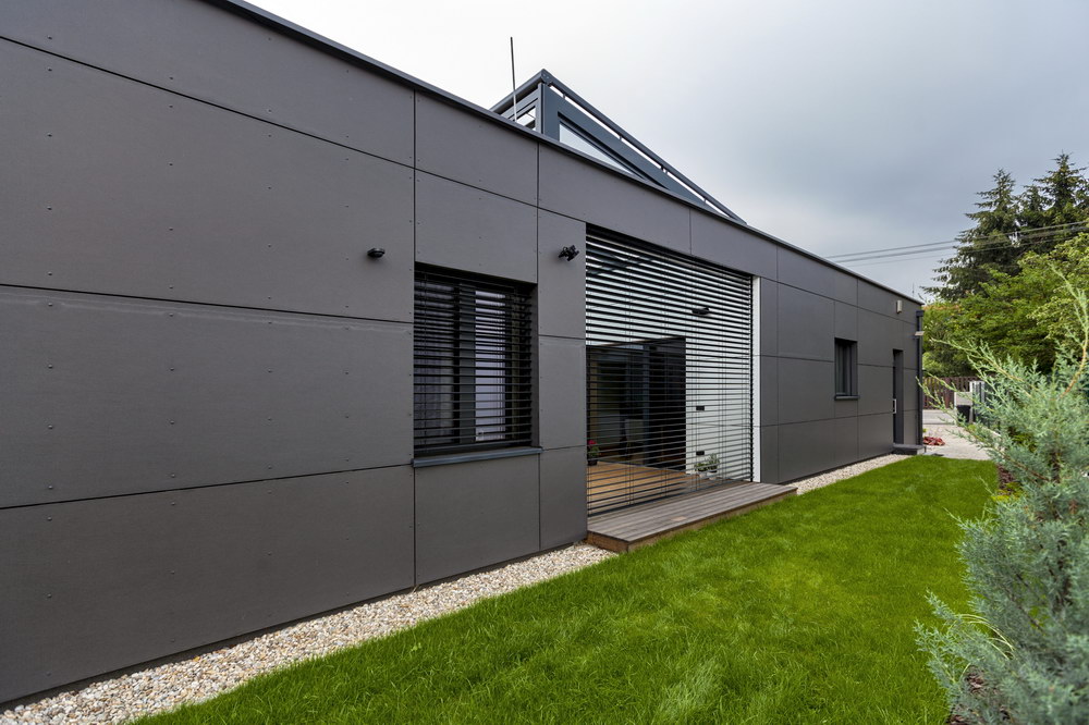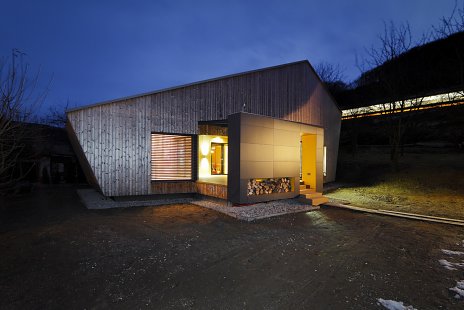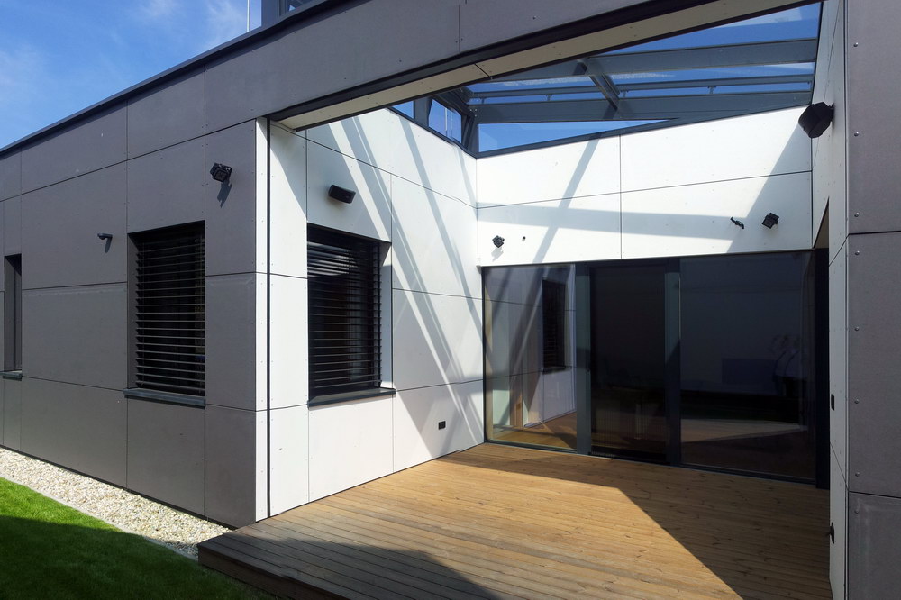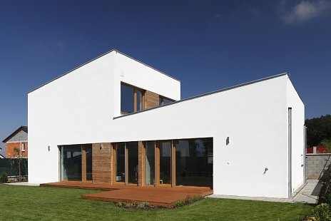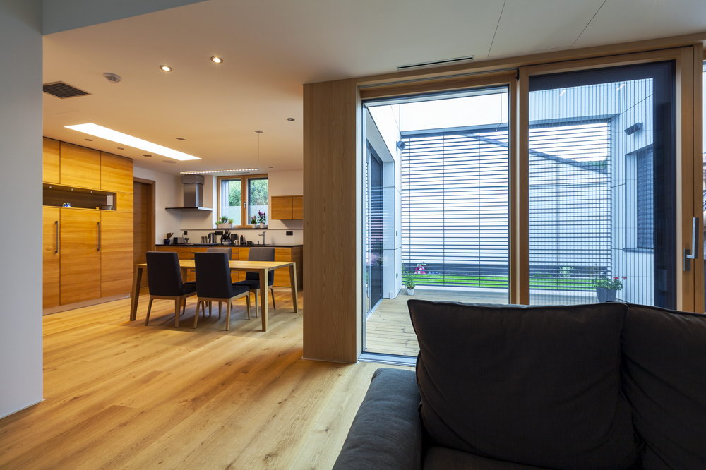 Priestor átria sa stal centrom dispozície, okolo ktorého sa odvíja celý priestorový koncept. Cez veľkoplošné zasklené steny a sklenené prestrešenie sa átrium stalo voliteľným rozšírením priestoru jedálne, obývačky a jednej zo spální. Dom je realizovaný ako montovaná drevostavba.