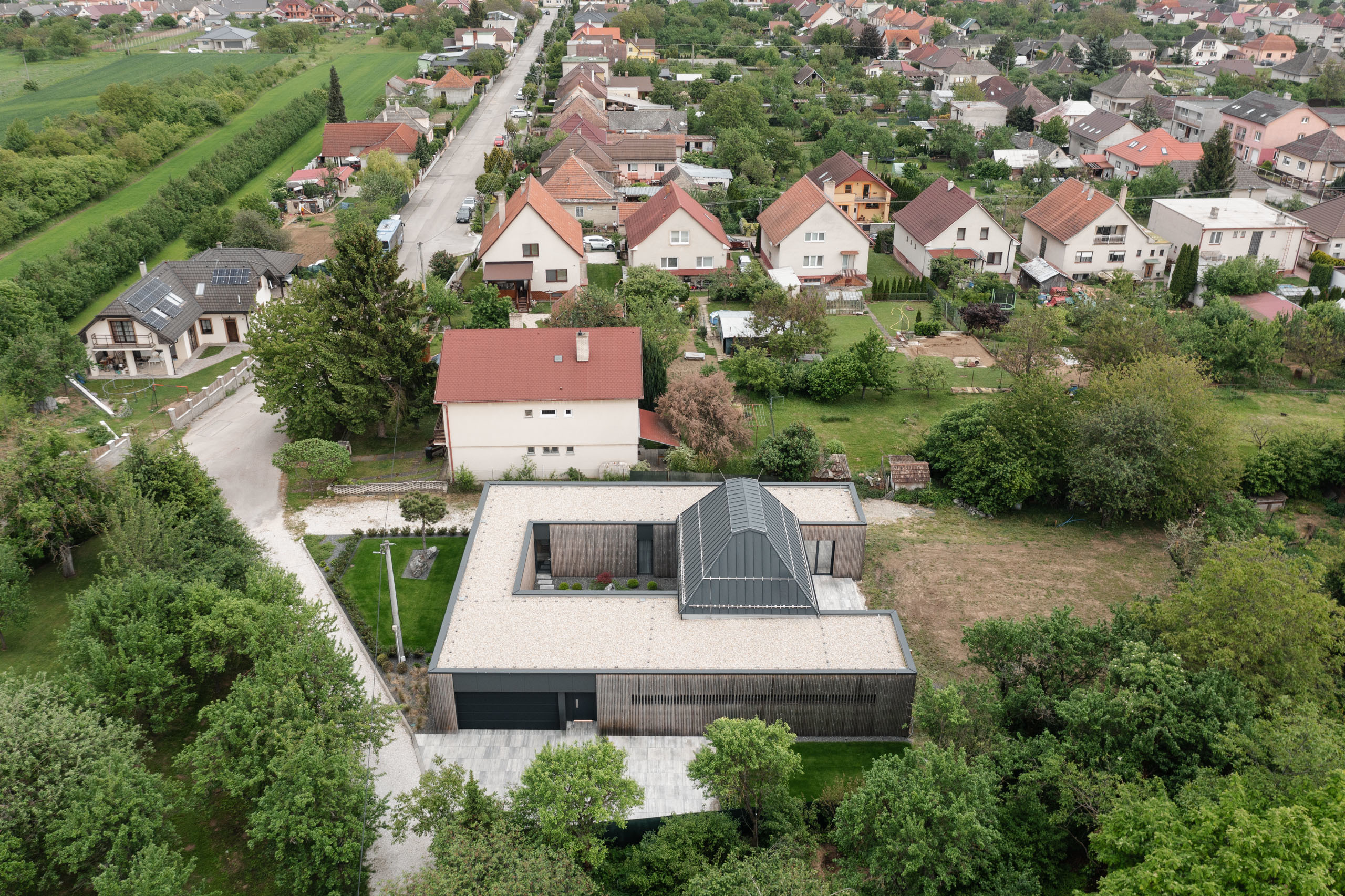 Realizovaný koncept jednoúrovňového bývania v priamom kontakte so záhradou a výrazne prevýšenou dennou zónou. Kryté stojisko pre dve autá a priľahlá obslužná časť domu sú definované uzavretým pôdorysom domu. Logické situovanie parkovania a skladových priestorov na neveľkom pozemku vytvára optickú bariéru zo strany ulice a nahrádza líniu klasického oplotenia.