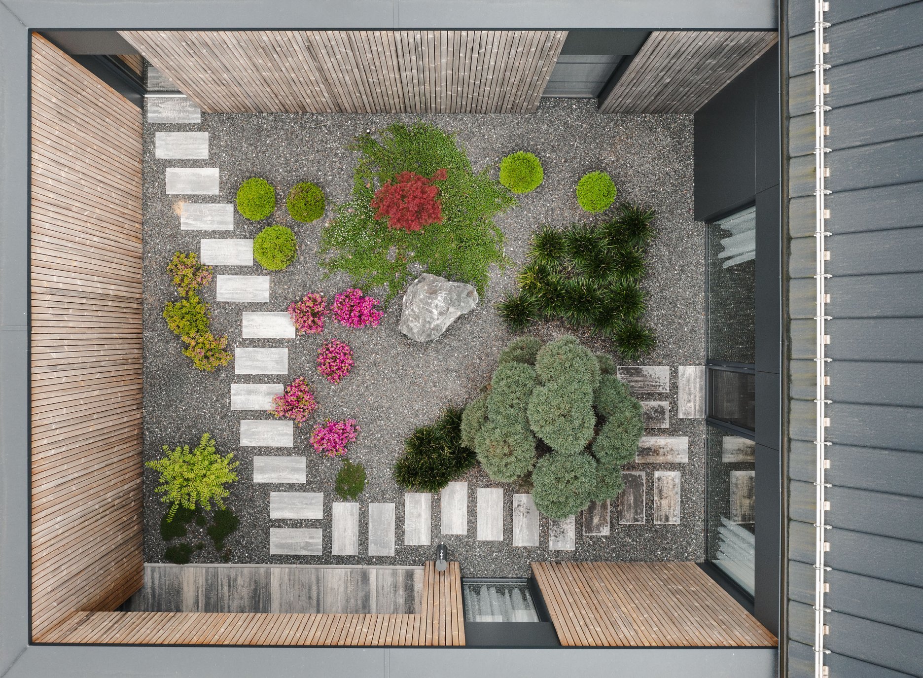Átriový koncept bol od začiatku favoritom priestorového riešenia. Napriek tomu nie je dom koncipovaný len sebastredne, ale v logickom pokračovaní dispozície má verejnú prístupovú časť bez oplotenia a terasu otvorenú do záhrady. Centrom priestorovej zostavy je átrium obkolesené krytým stojiskom pre 2 autá, nadväzujúcim skladom a ďalšími dvoma krídlami domu, ktoré obsahujú dennú (južné a východné krídlo) a nočnú časť (západné krídlo). Dispozičným centrom domu je obytná časť s kuchyňou a jedálňou. Priestor je prestrešený valbovou strechou s vloženou klenbou.