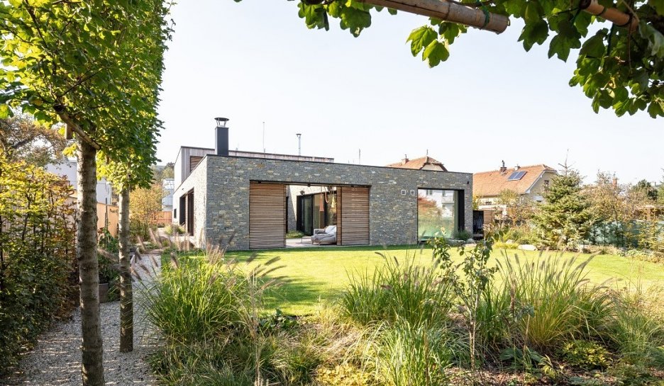 Obytné miestnosti na prízemí sa cez rozmerné presklenie otvárajú do záhrady. Poschodie je kľudovou zónou s vlastnou strešnou terasou.