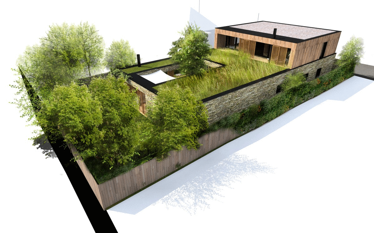 Rovinatý pozemok, rôznorodá okolitá zástavba, absencia súkromia... Pôdorys v tvare písmena "L" reaguje na okolitý kontext. Nárožie uzatvára blok letnej kuchyne. Vzniká átrium, ktoré je zo všetkých strán clonené pevným, alebo posuvným tienením. Vnútorný “dvor" sa tak v letných mesiacoch stáva stredobodom obytného priestoru.