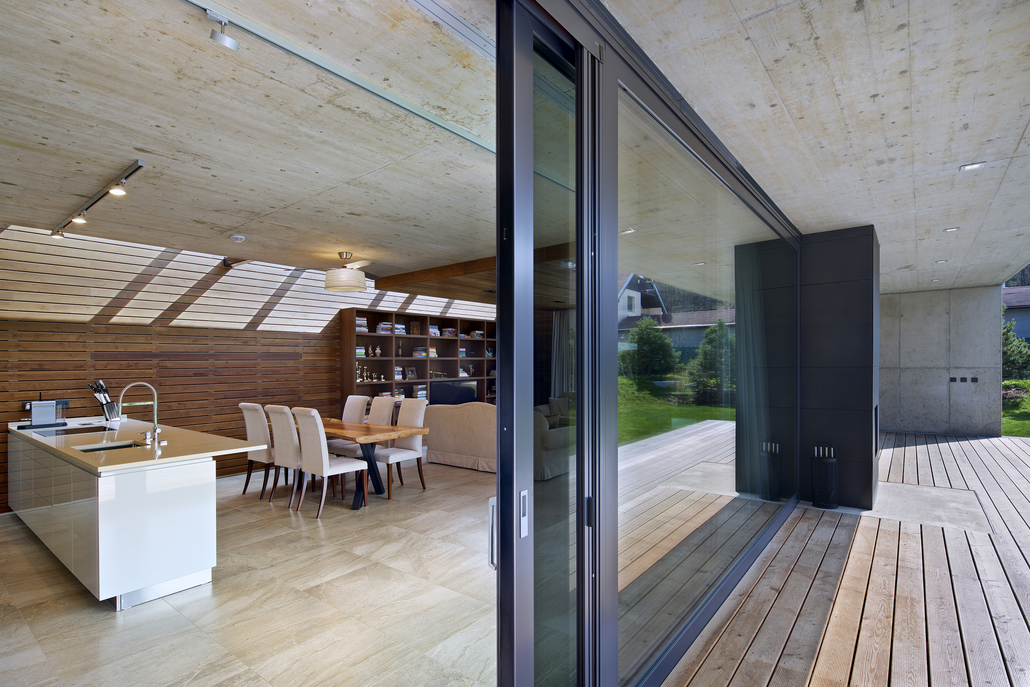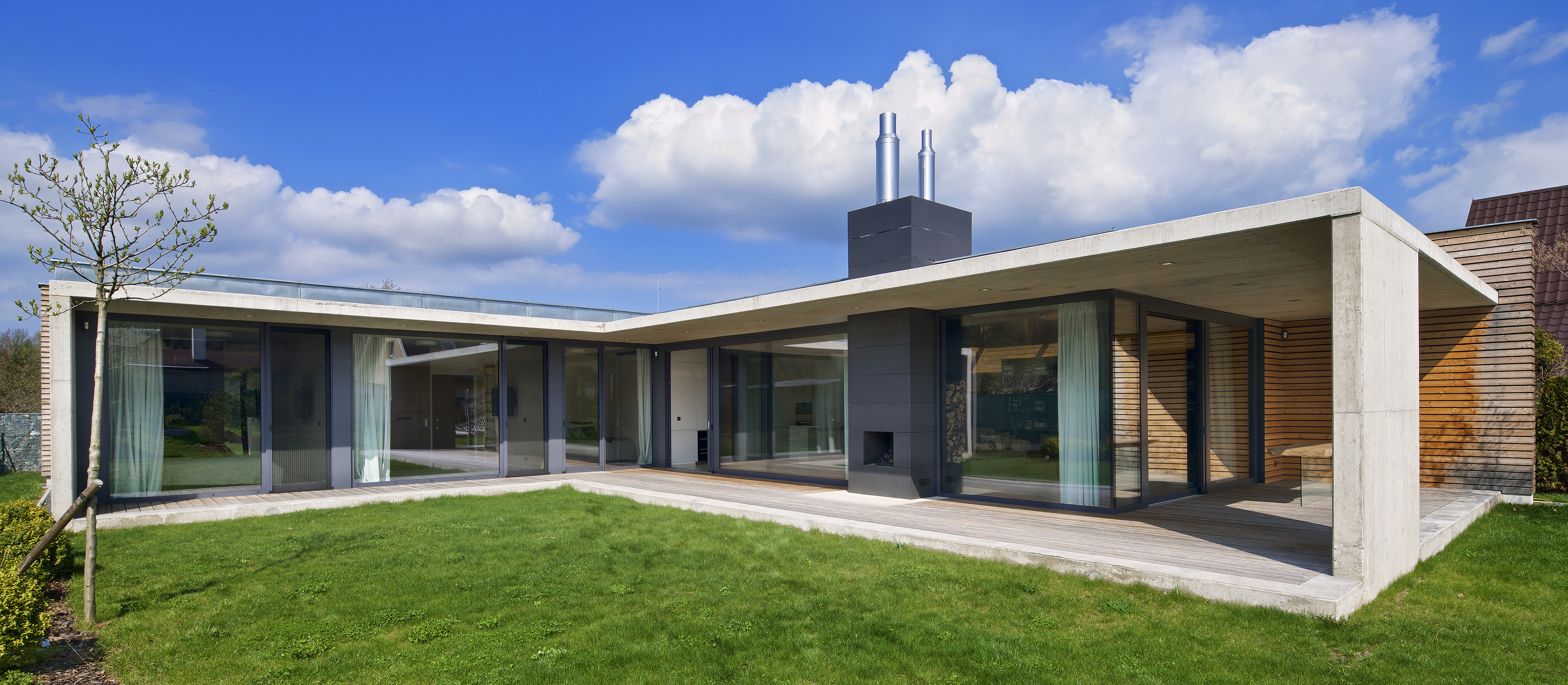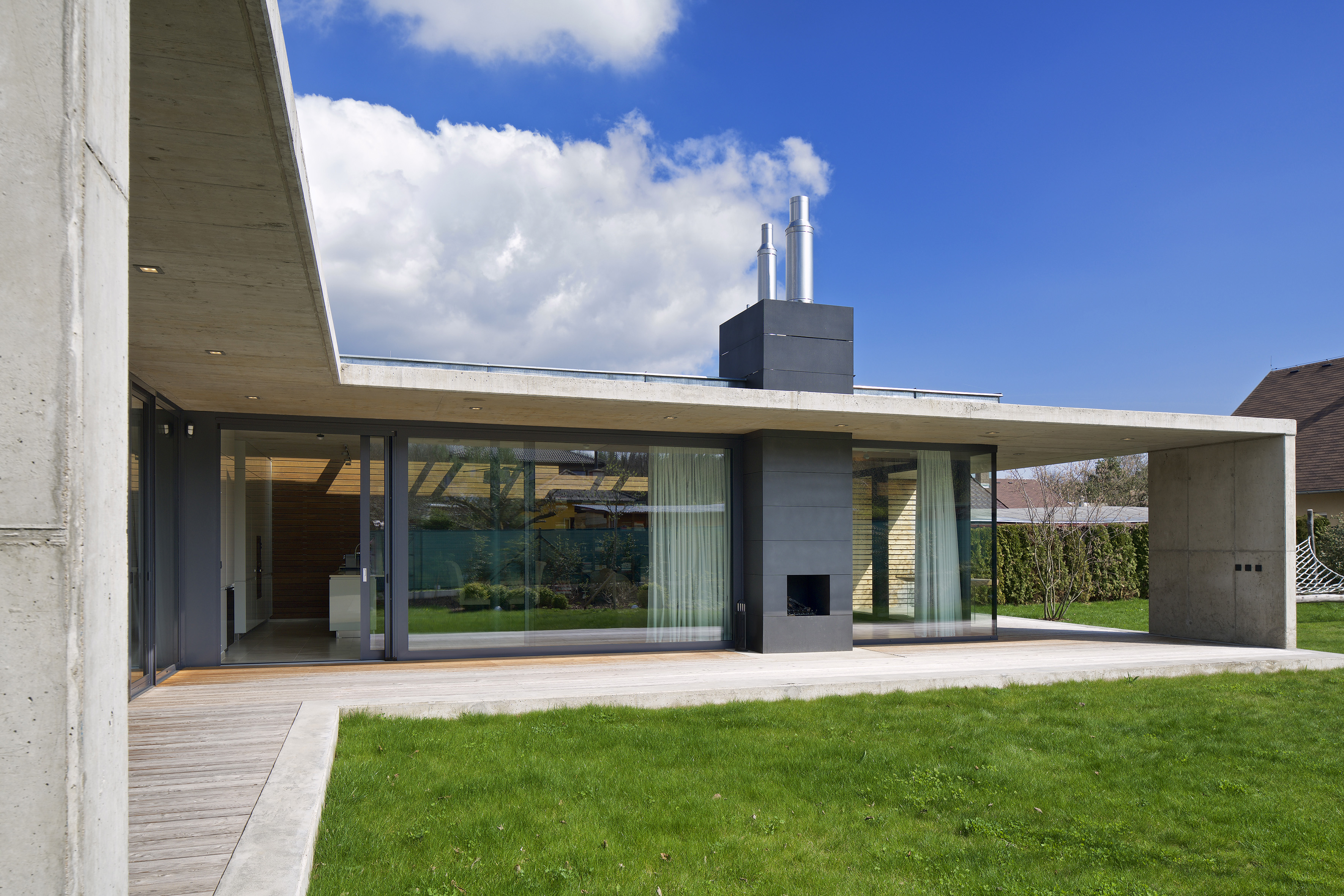 Cez posuvné zasklenie je z hlavného obytného priestoru a jednotlivých izieb prístupná krytá terasa, ktorá je orámovaná betónovou markízou. Tá tvorí prirodzené tienenie a chráni terasu pred dažďom. Dojem subtílnej horizontálnej linky je umocnený zužujúcou sa doskou markízy, ktorá je s prerušením tepelného mosta napojená na hrubšiu zateplenú stropnú dosku. Výraznú horizontálnu kompozíciu prízemnej stavby pretína vertikála tmavého komínového telesa.