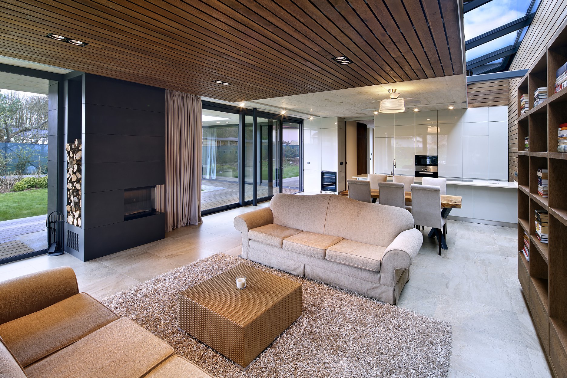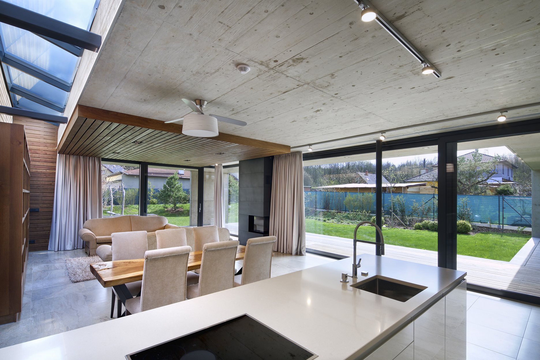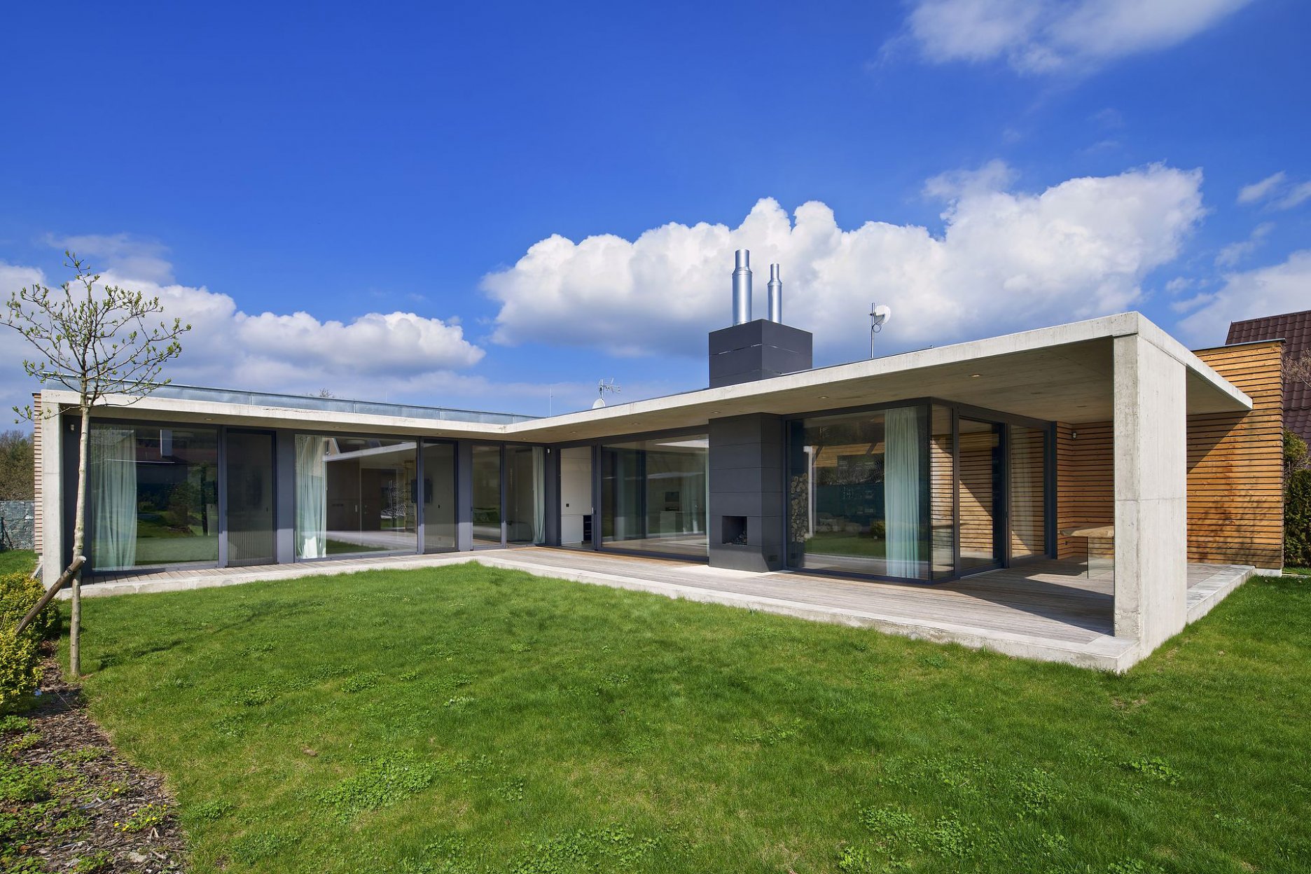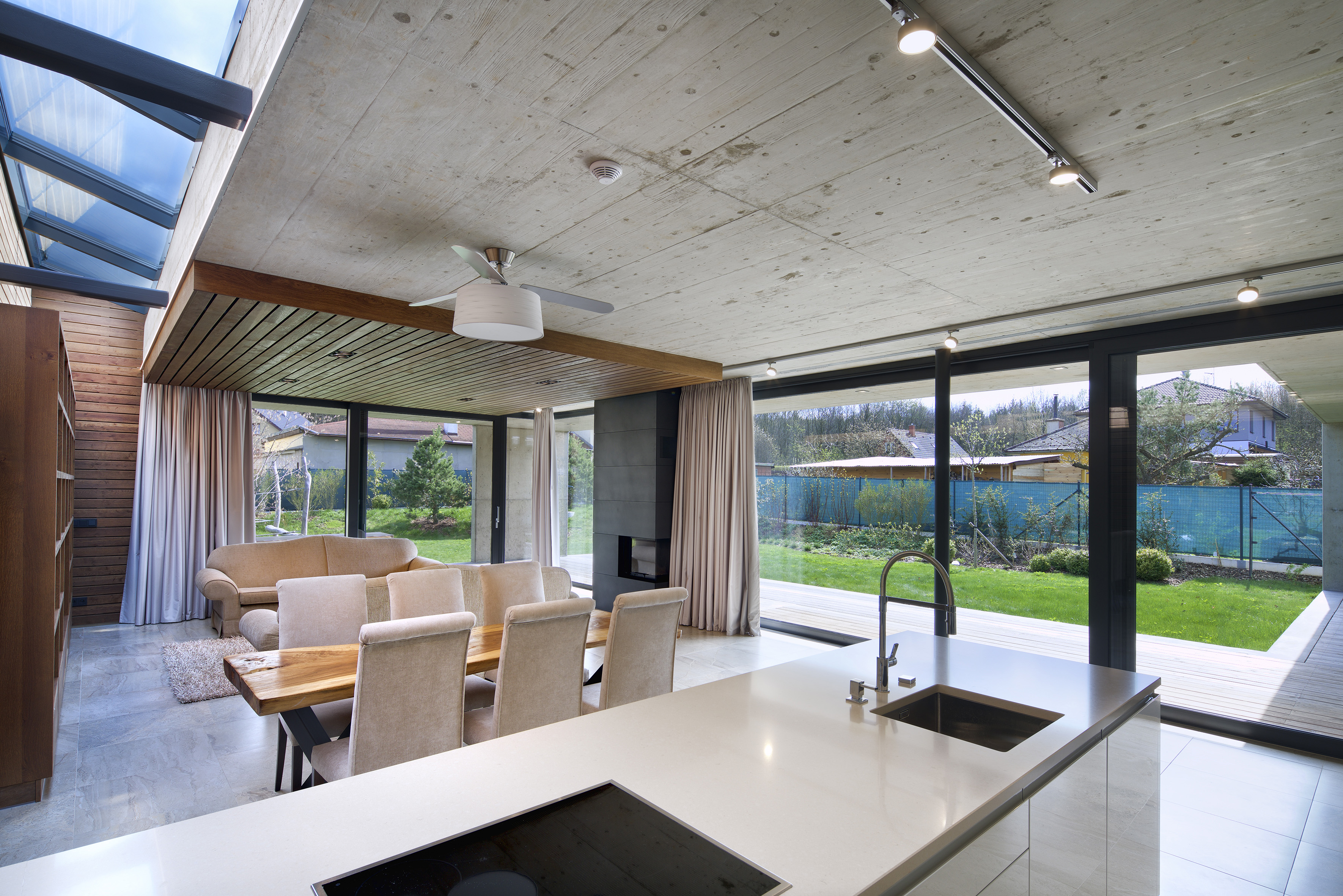Cez posuvné zasklenie je z hlavného obytného priestoru a jednotlivých izieb prístupná krytá terasa, ktorá je orámovaná betónovou markízou. Tá tvorí prirodzené tienenie a chráni terasu pred dažďom. Dojem subtílnej horizontálnej linky je umocnený zužujúcou sa doskou markízy, ktorá je s prerušením tepelného mosta napojená na hrubšiu zateplenú stropnú dosku. Výraznú horizontálnu kompozíciu prízemnej stavby pretína vertikála tmavého komínového telesa.