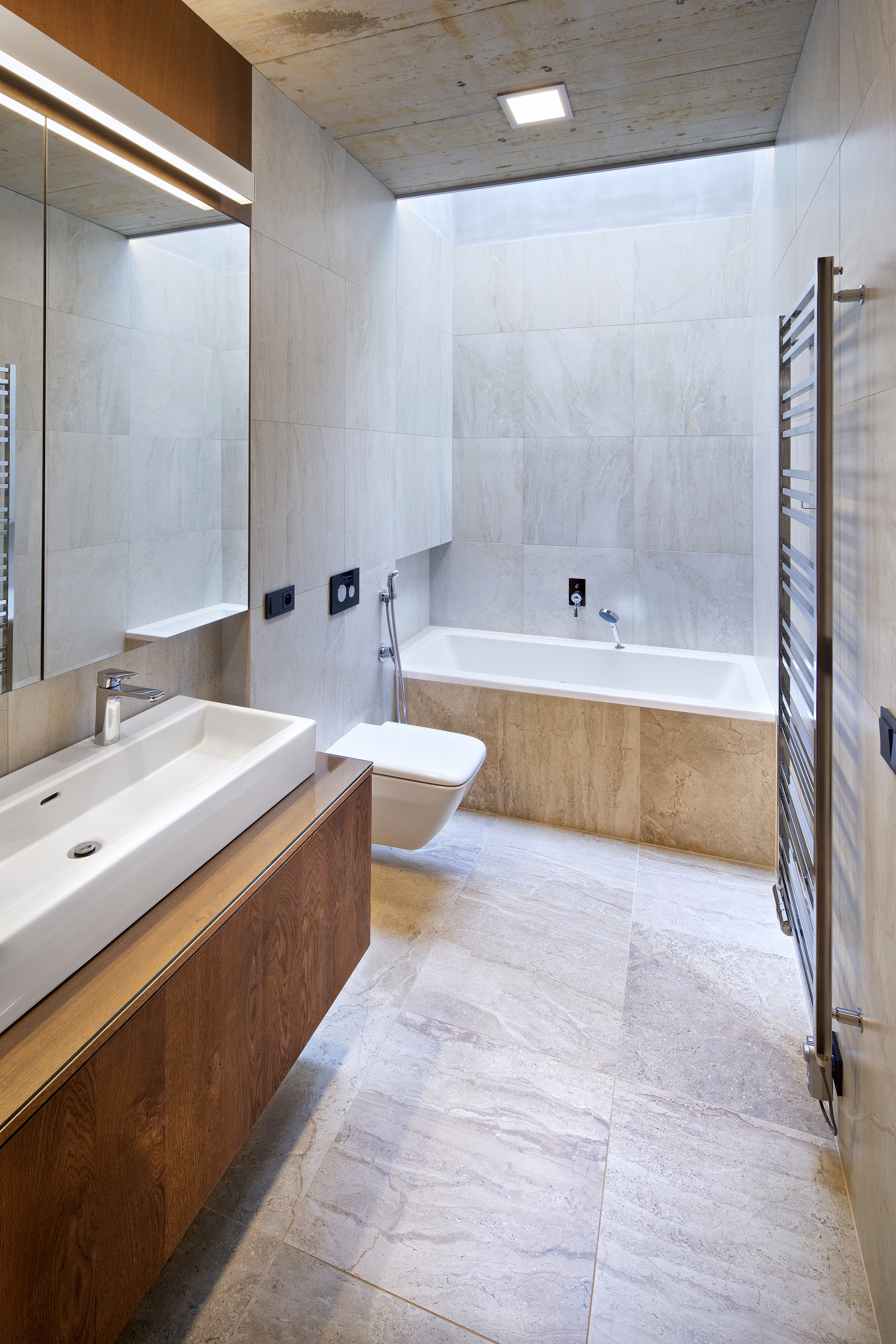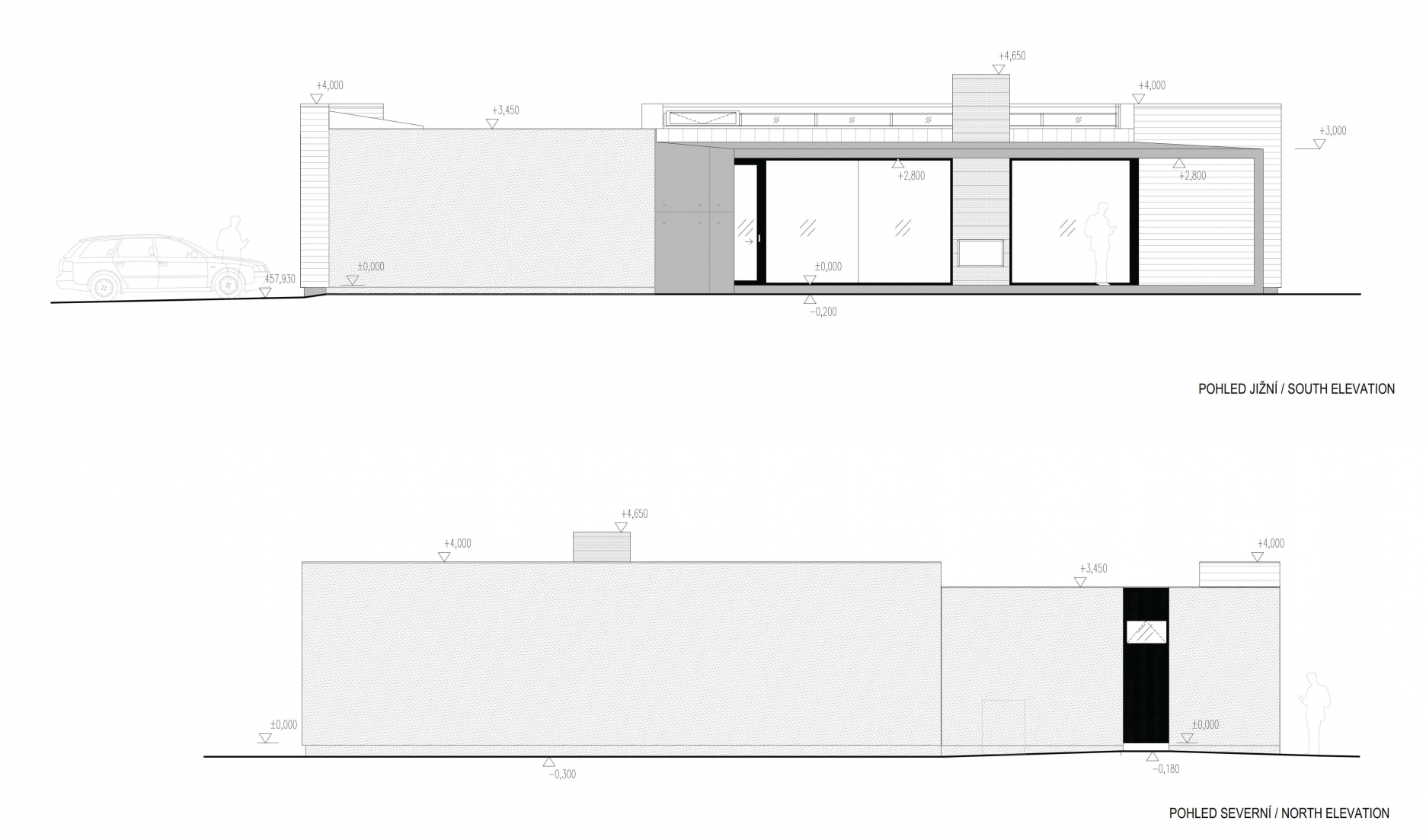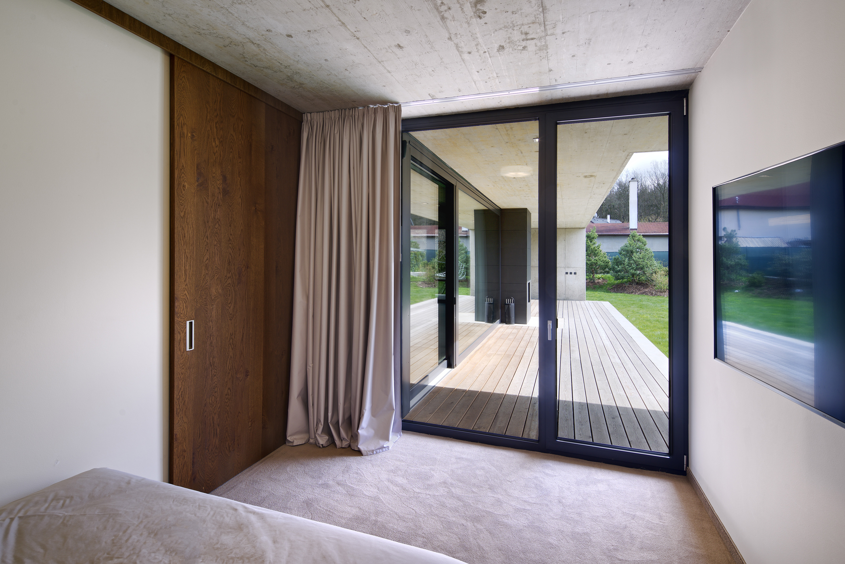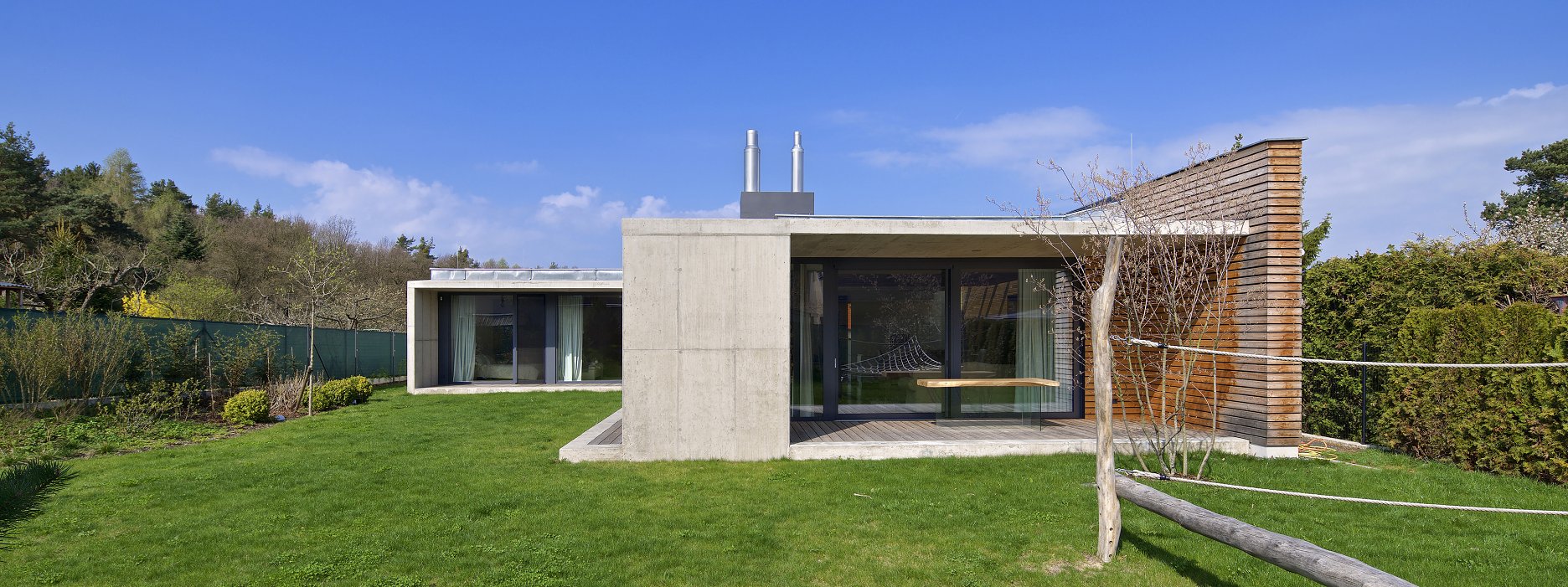 Zo strany exteriéru dopĺňa pohľadový betón smrekovcový obklad bez ďalšej povrchovej úpravy, sivá omietka a antracitové rámy zasklenia.