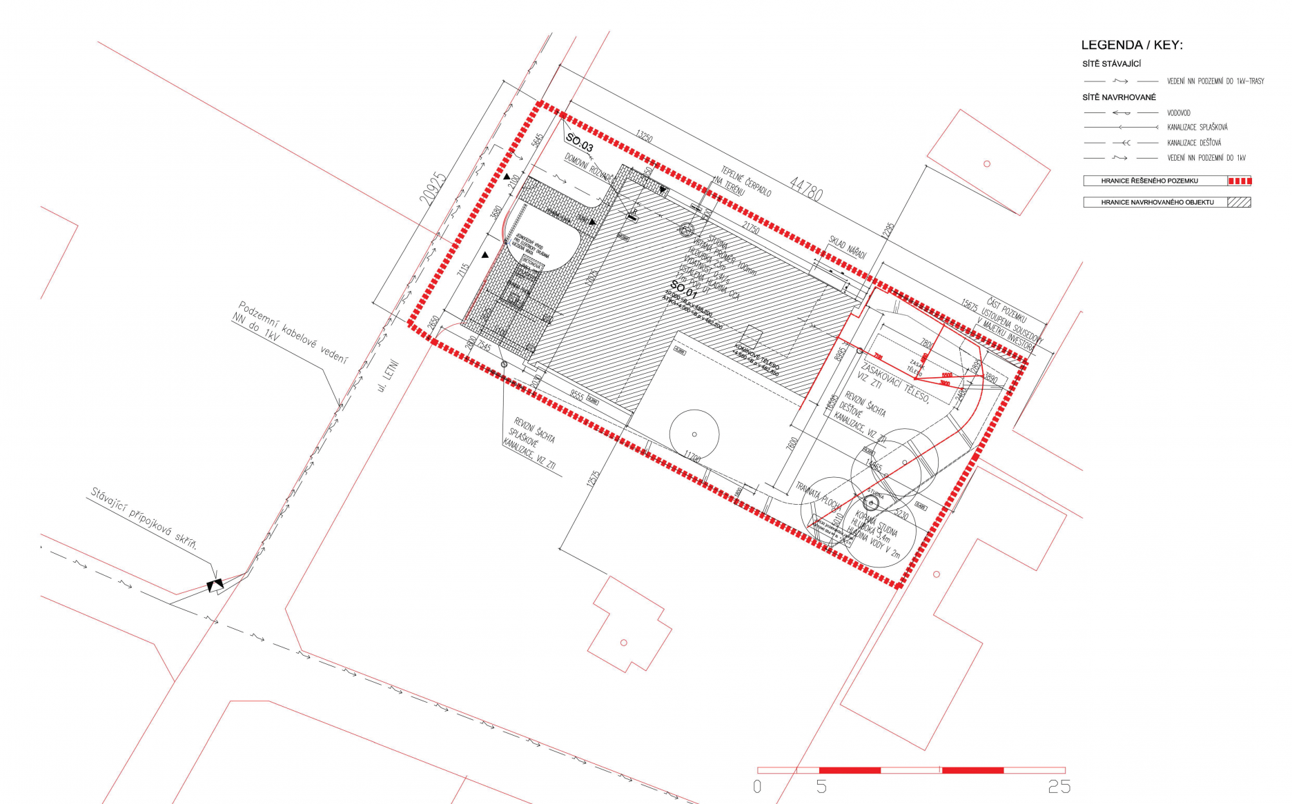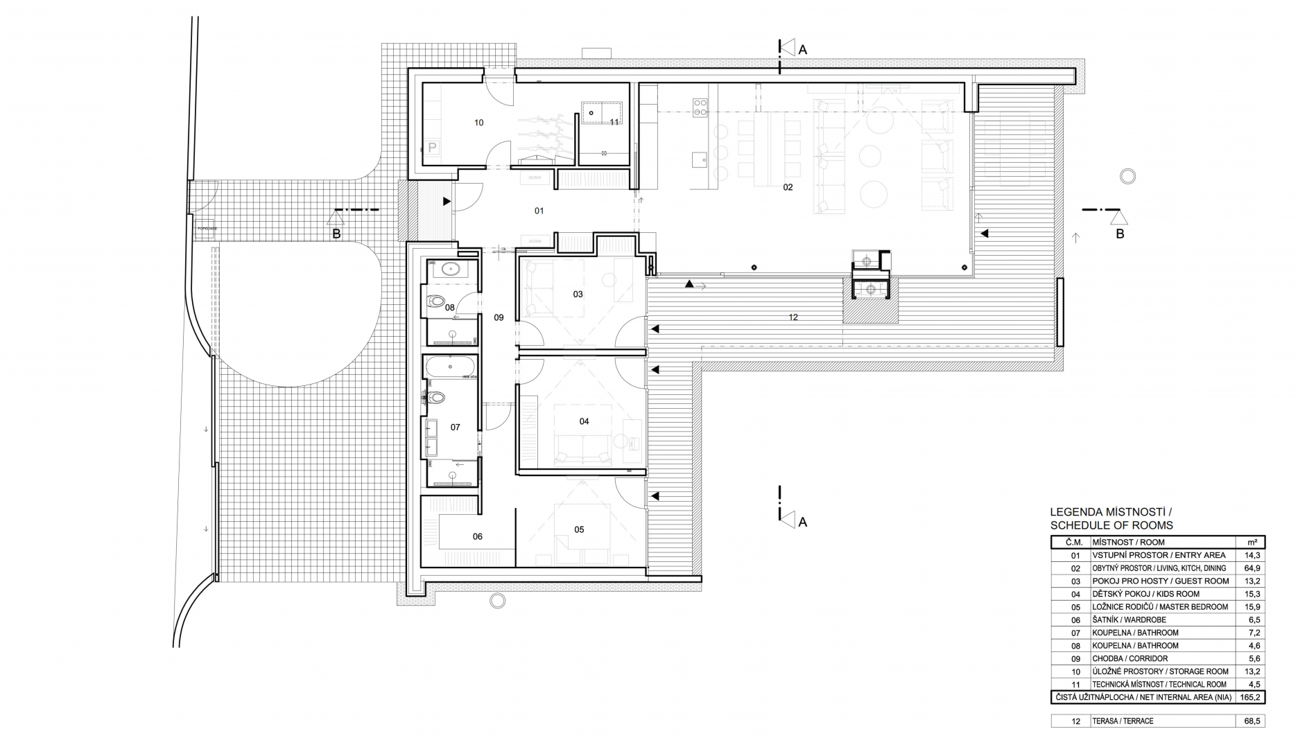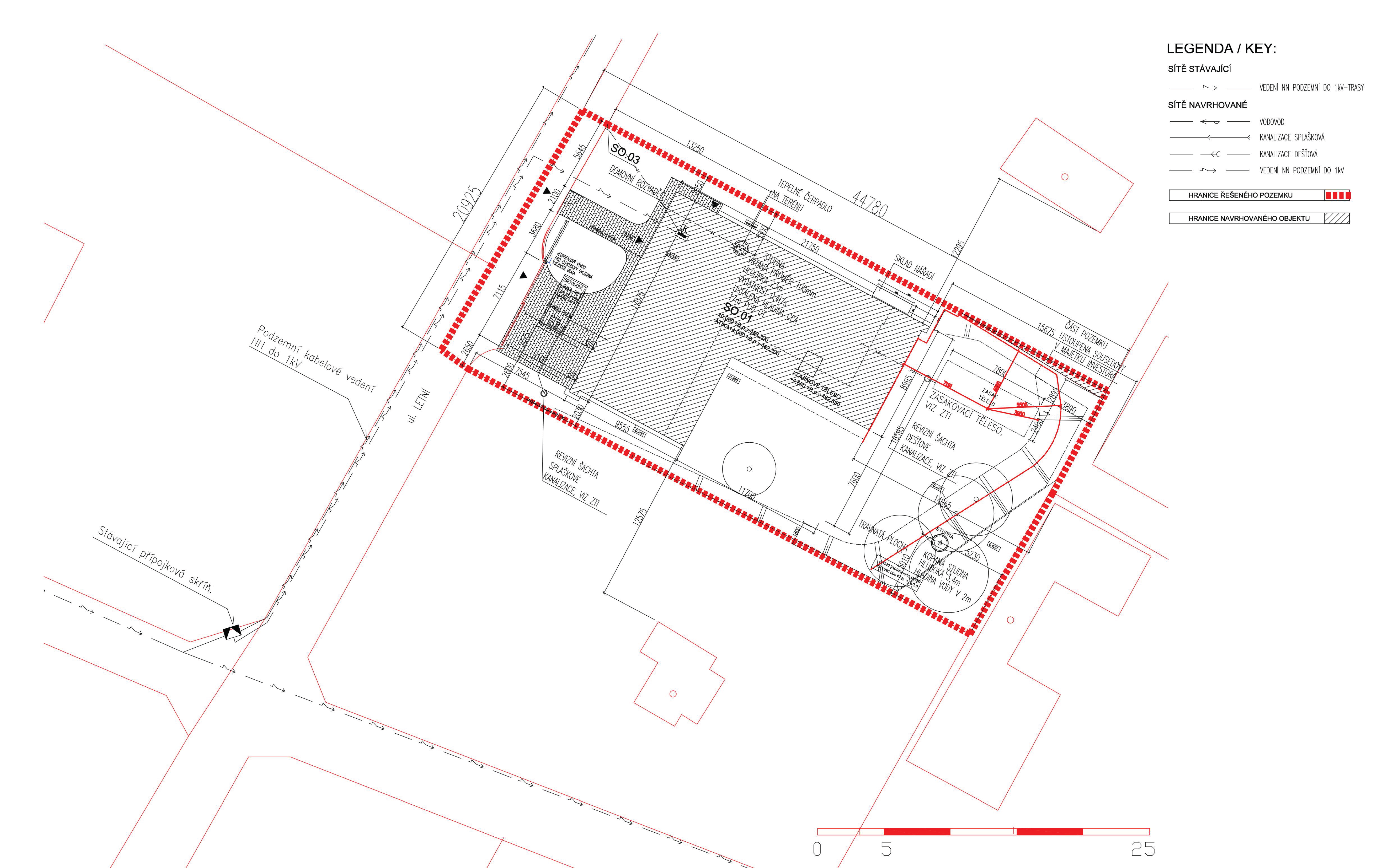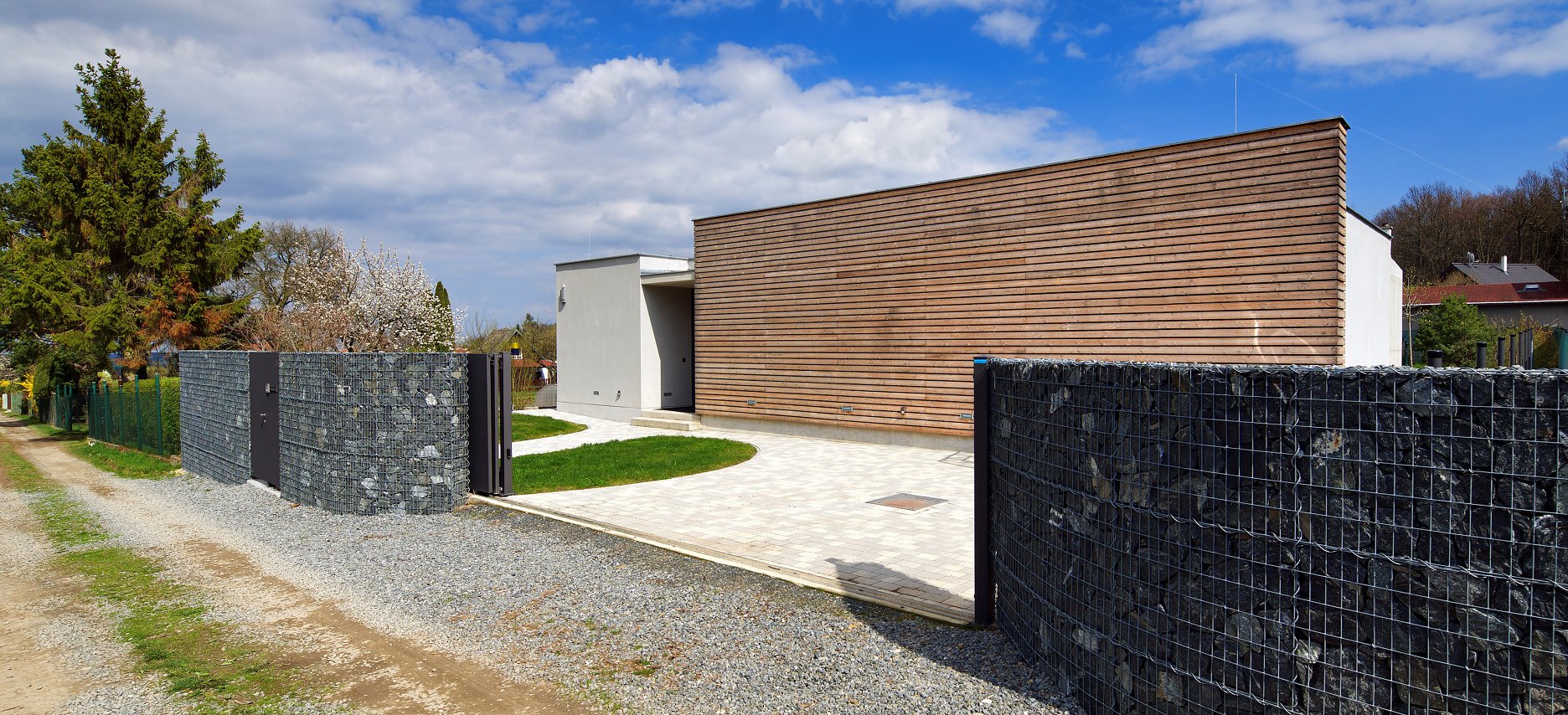 Jednopodlažný dom s pôdorysom v tvare písmena “L” je osadený na rovinatej parcele v okrajovej časti obce Mníšek pod Brdy (30 km južne od Prahy). Dom delí obdĺžnikovú parcelu na menšiu prístupovú časť orientovanú do ulice a väčšiu rekreačnú časť so záhradou.