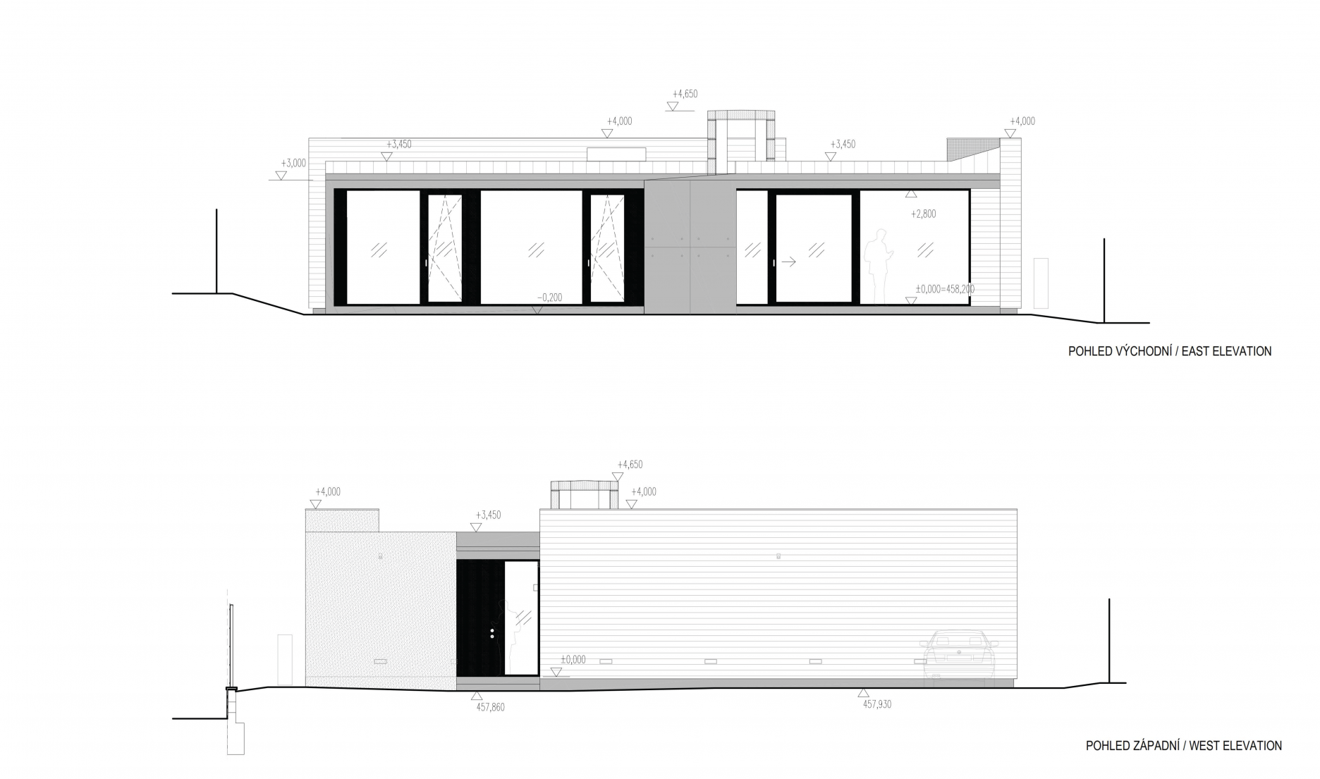 Transparentné plochy juhovýchodnej fasády dopĺňa pásový strešný svetlík prechádzajúci cez obývaciu izbu. Vrchné osvetlenie majú aj obe kúpeľne. Pôdorysný tvar domu udáva funkčné členenie prevádzky s jasne definovanou dennou, nočnou a technickou časťou.